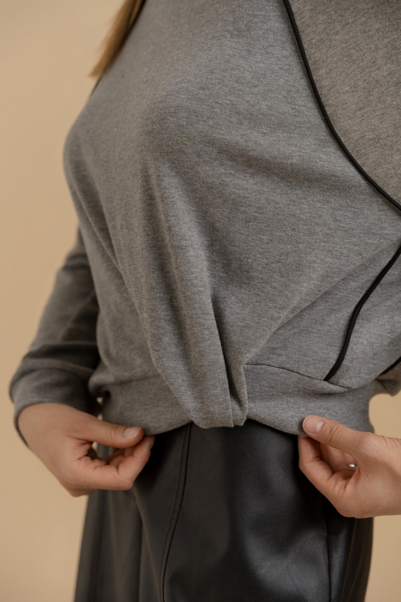 Джемпер женский из мягкого трикотажного полотна средней плотности свободного покроя. Рукава - цельнокроеные с углубленной проймой. Спереди выполнен декоративный элемент в виде драпировки. Вырез горловины - неглубокий с отрезной планкой. Низ изделия посажен на отрезную планку. Спереди и сзади в подрезы вставлены канты из отделочной ткани.