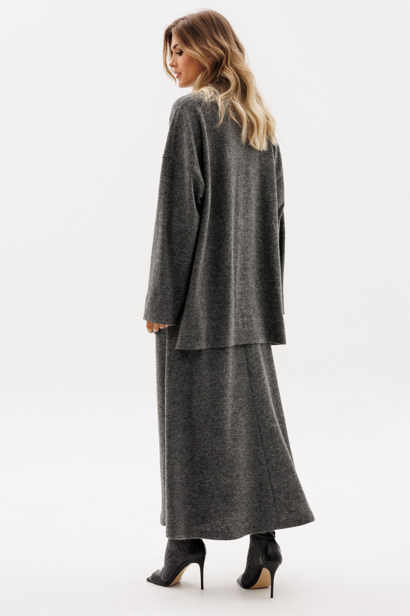 Джемпер выполнен из трикотажного полотна. Джемпер прямого силуэта, длиной ниже линии бедер. Перед и спинка цельные. Горловина округлой формы, обработана широкой бейкой. Плечевой шов удлинен. Рукав рубашечного покроя, одношовный. В боковых швах разрезы.