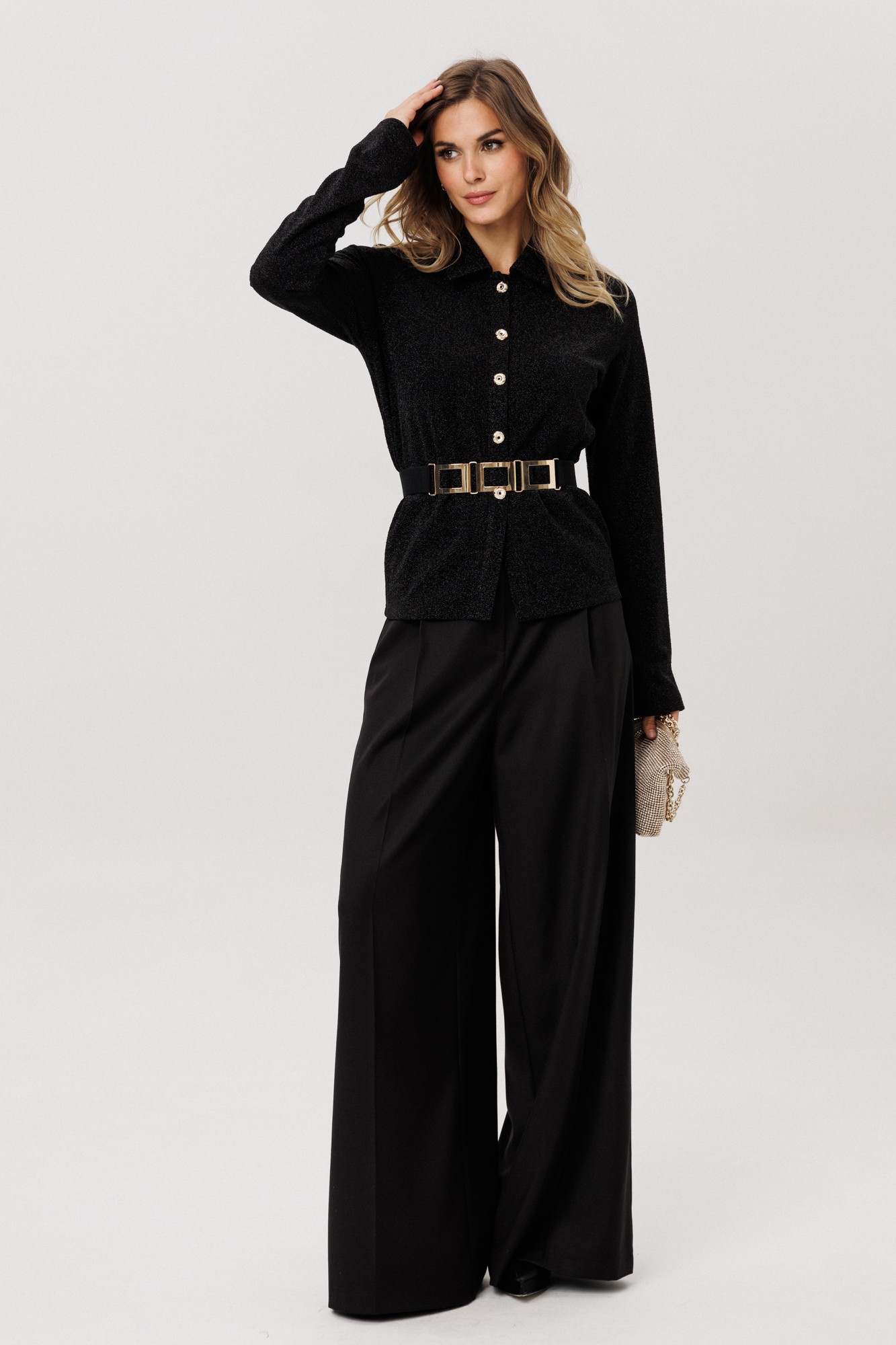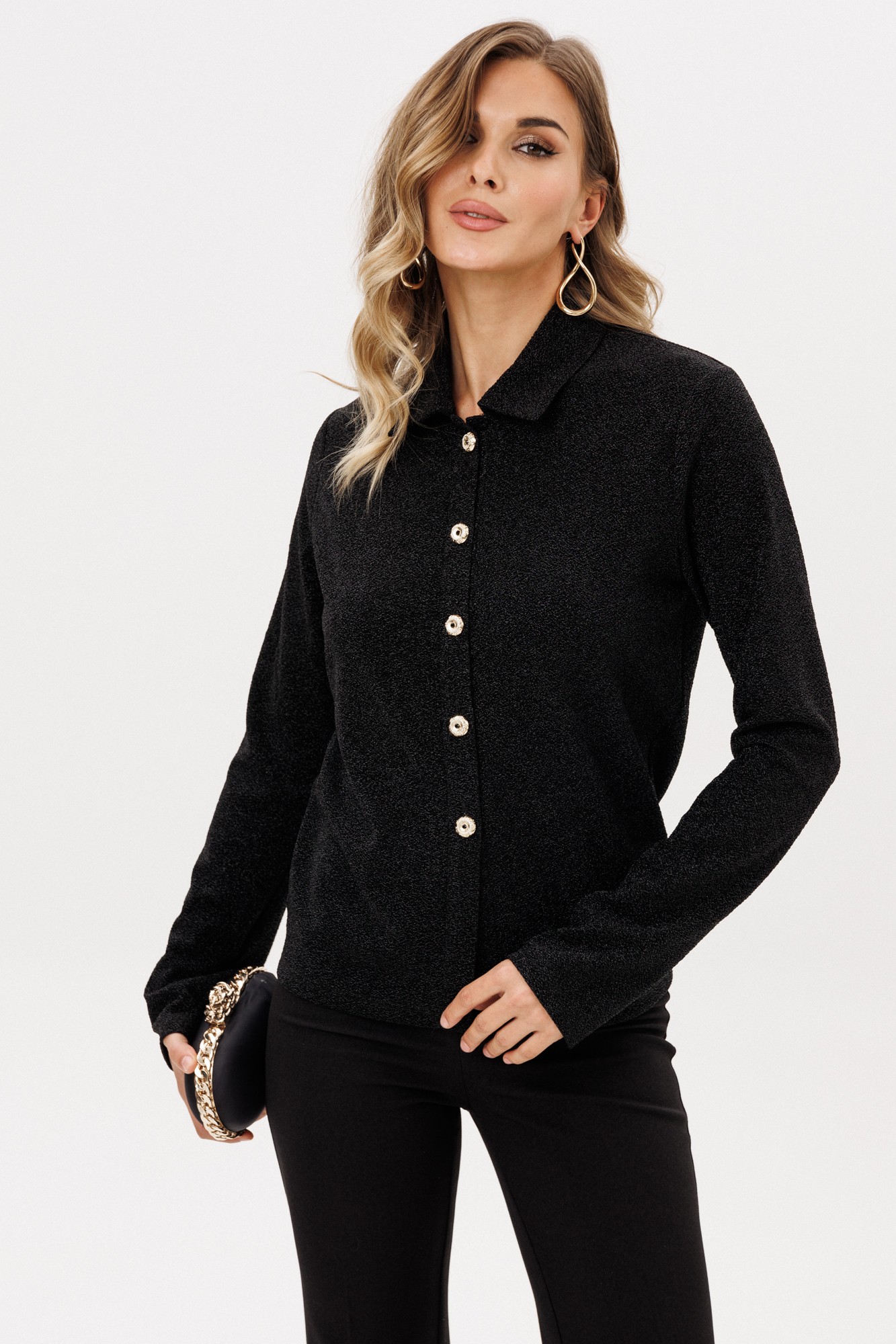 Джемпер выполнен из трикотажного полотна с блеском. Джемпер полуприлегающего силуэта, длиной выше линии бедер. Воротник стояче-отложной. Плечевой шов удлинен. Рукав втачного покроя, одношовный. Застежка по планке на петли и декоративные пуговицы.
