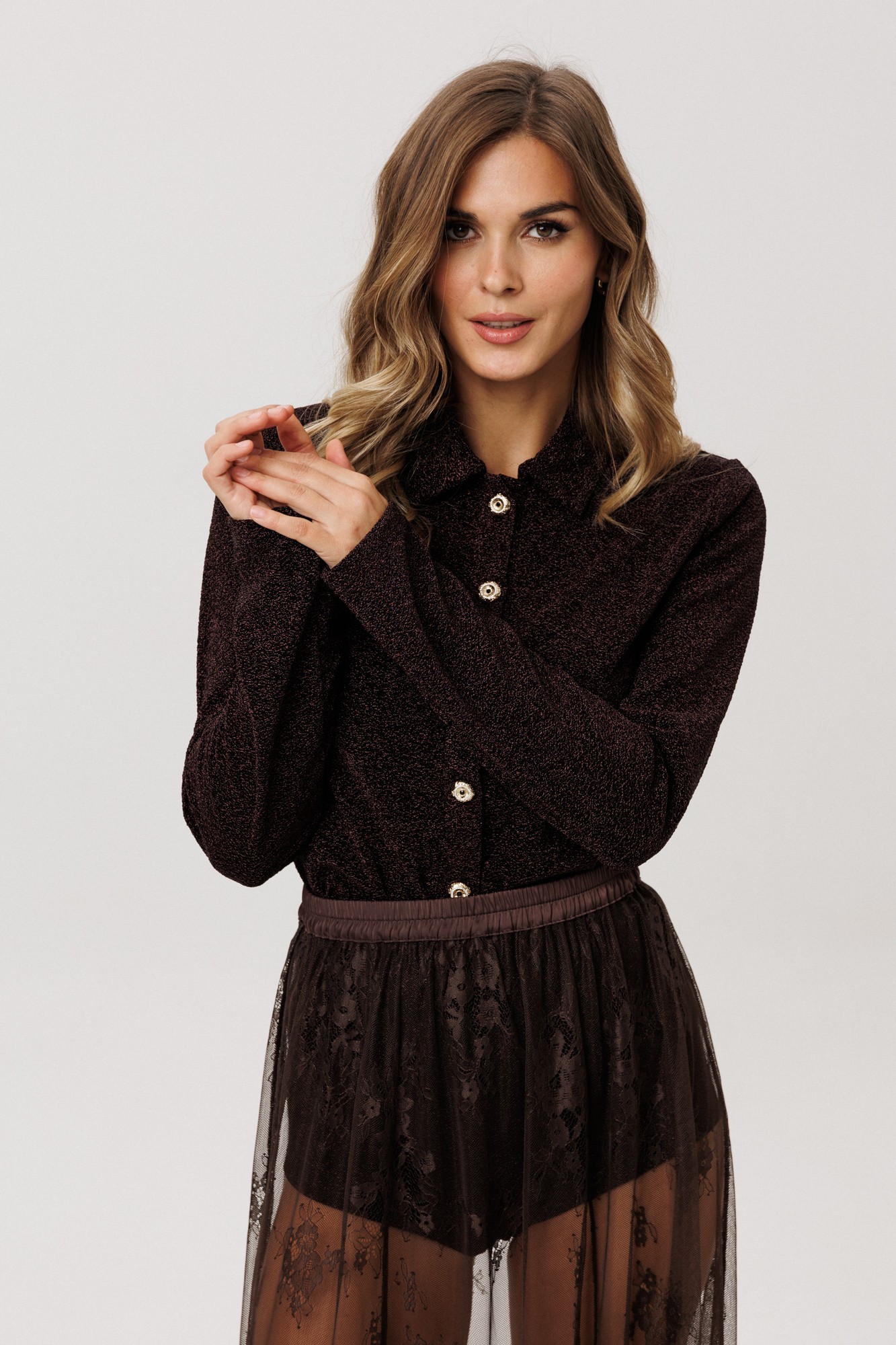 Джемпер выполнен из трикотажного полотна с блеском. Джемпер полуприлегающего силуэта, длиной выше линии бедер. Воротник стояче-отложной. Плечевой шов удлинен. Рукав втачного покроя, одношовный. Застежка по планке на петли и декоративные пуговицы.