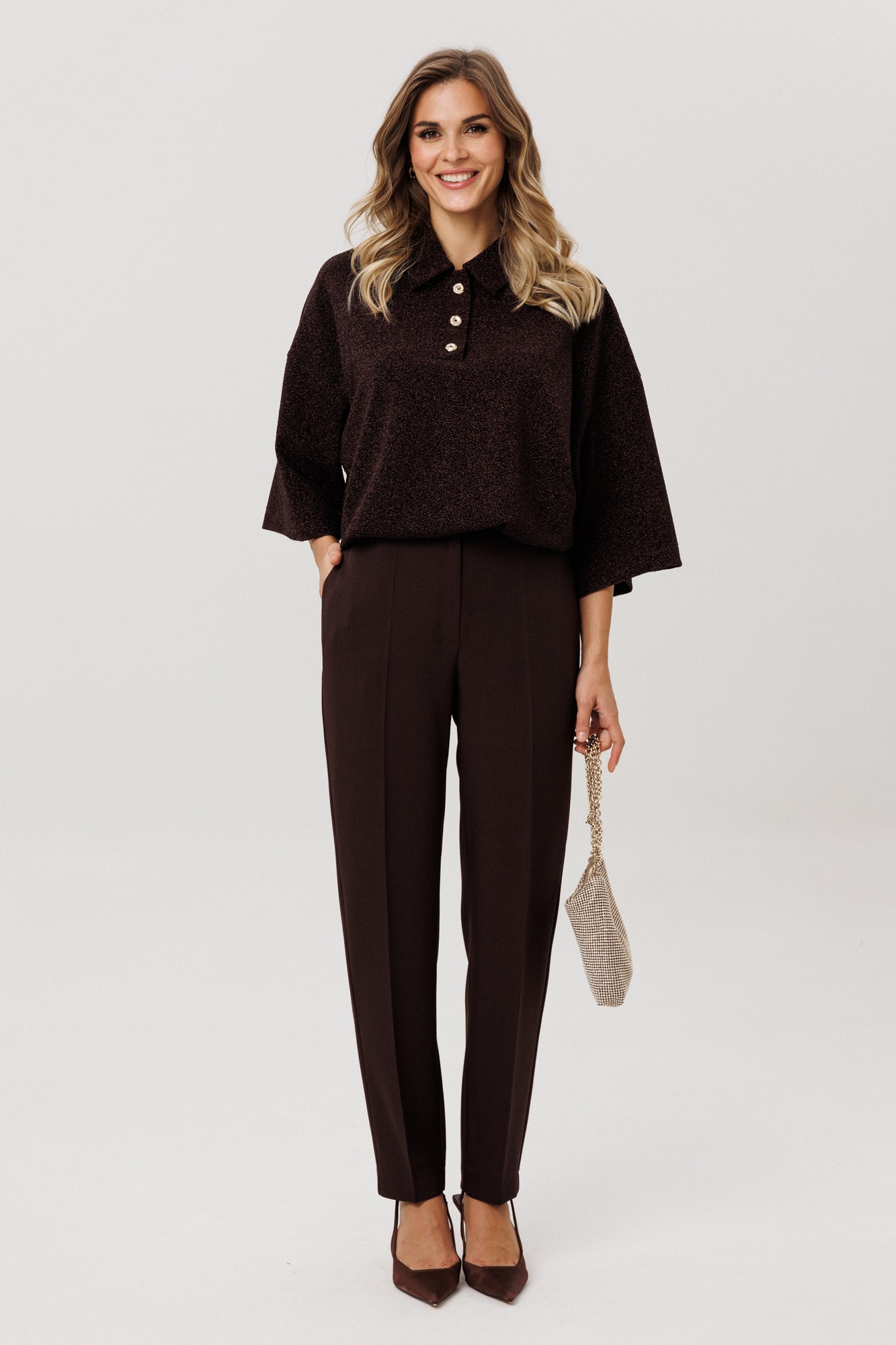 Джемпер выполнен из трикотажного полотна с блеском. Джемпер О-образного силуэта, длиной выше линии бедер. Спереди центральная застежка на декоративные пуговицы. Спинка цельная. Воротник стояче-отложной. Плечевой шов удлинен. Рукав рубашечного покроя, одношовный, длиной до линии локтя. Низ джемпера присобран на эластичную тесьму.