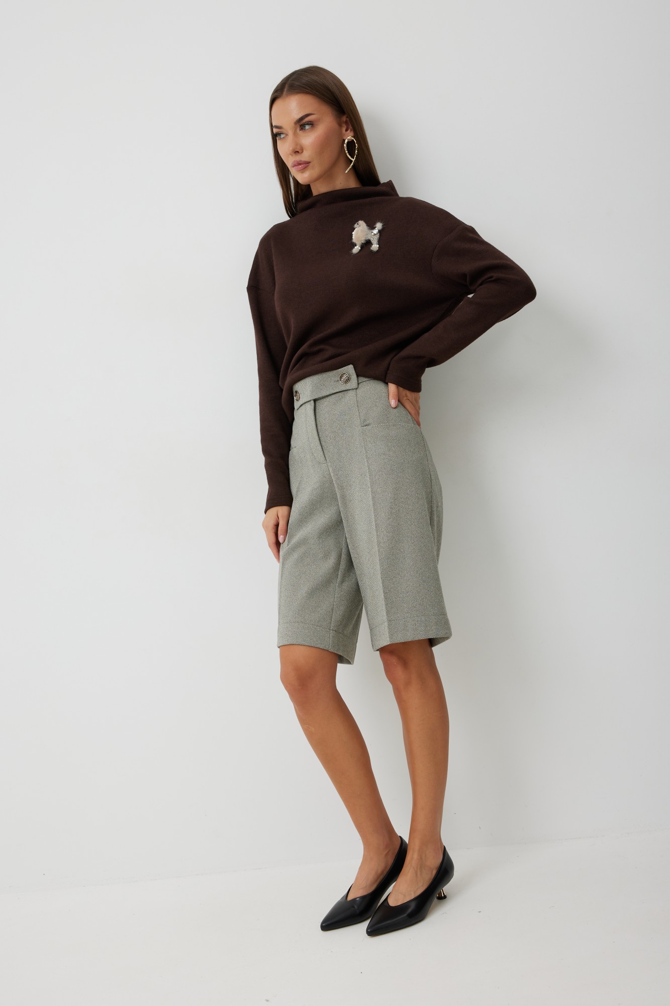 Блузон женский с цельнокроеной горловиной типа "хомут". Линия плеча и проймы спущены. Рукав втачной, одношовный. Блузон декорирован авторской брошью. Декоративные элементы и фурнитура могут отличаться от заявленных на фото. Цвет материала может отличаться по тону в зависимости от настроек вашего монитора!