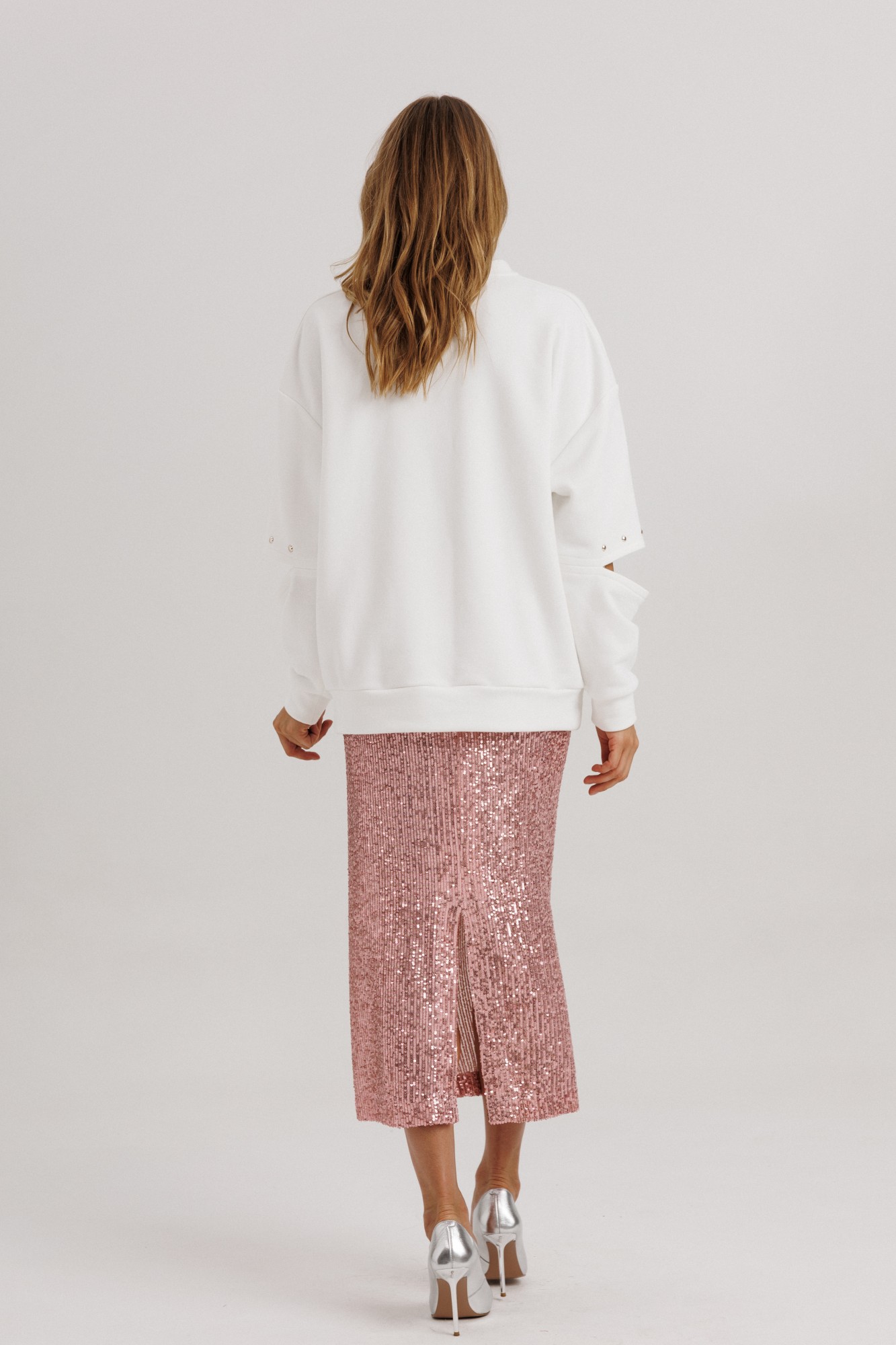 Блузон из уютного трикотажного полотна, свободного прямого силуэта. Линия плеча спущена, рукав прямой, на зауженной манжете. Линия плеча состоит из притачного элемента: погона. Рукав основной состоит из двух деталей, в горизонтальном шве стачивания данных деталей расположен открытый разрез. По верхнему срезу расположены стразы. При желании длина рукава может трансформироваться и отверстием выступает открытый разрез. Длина рукава, вместе с плечевой линией 75 см. Из них 13 см: длина плеча и 62 см: длина рукава. Высота манжета 5 см. На центральной части переда блузона расположены декоративные аппликационные элементы, в виде ассиметричных полос из пайеток. Горловина округлая, оформлена притачной планкой, высотой 3 см. Низ блузона оканчивается притачной манжетой, высотой 6 см. Длина блузона по спинке изделия 70 см. (фурнитура может отличаться от представленной на рекламном фотоматериале). Особые рекомендации: рекомендуется холодная деликатная ручная стирка, без использования отбеливающих СМС, без интенсивного трения. Сушка в вертикальном положении. ВТО с минимальным паром.