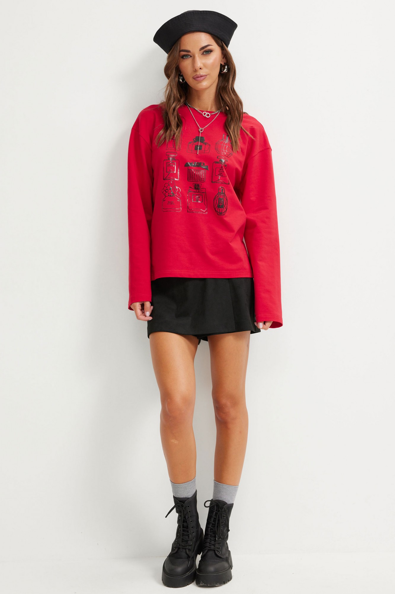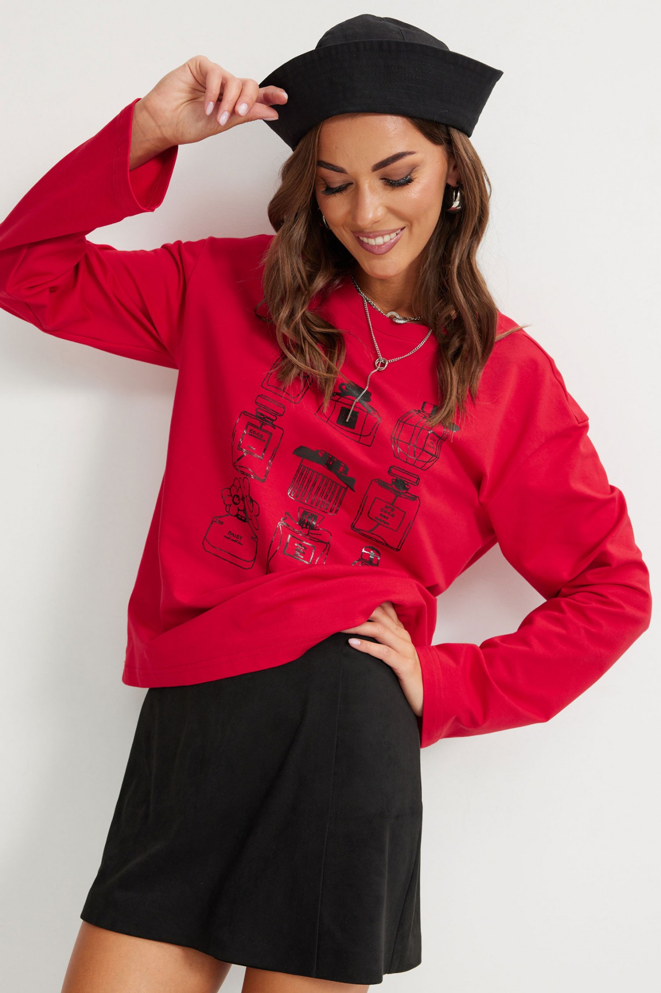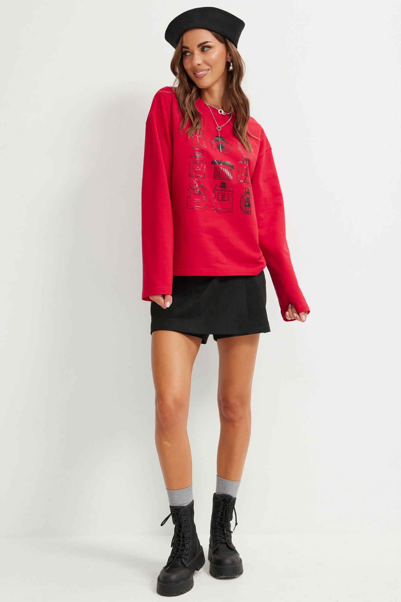 Стильный джемпер прямого силуэта из трикотажного полотна. Горловина округлая. Рукав втачной, удлиненный, расширенный к низу. По переду дизайнерская печать.