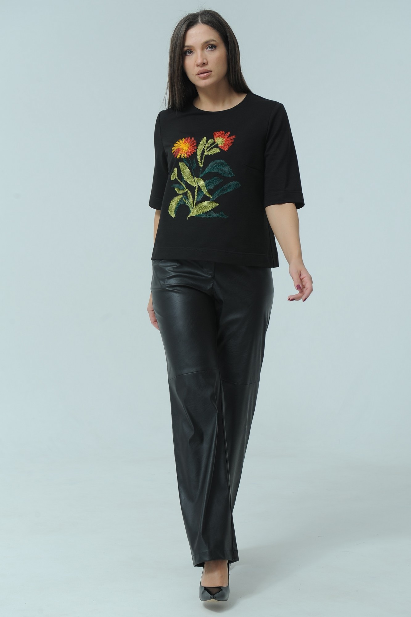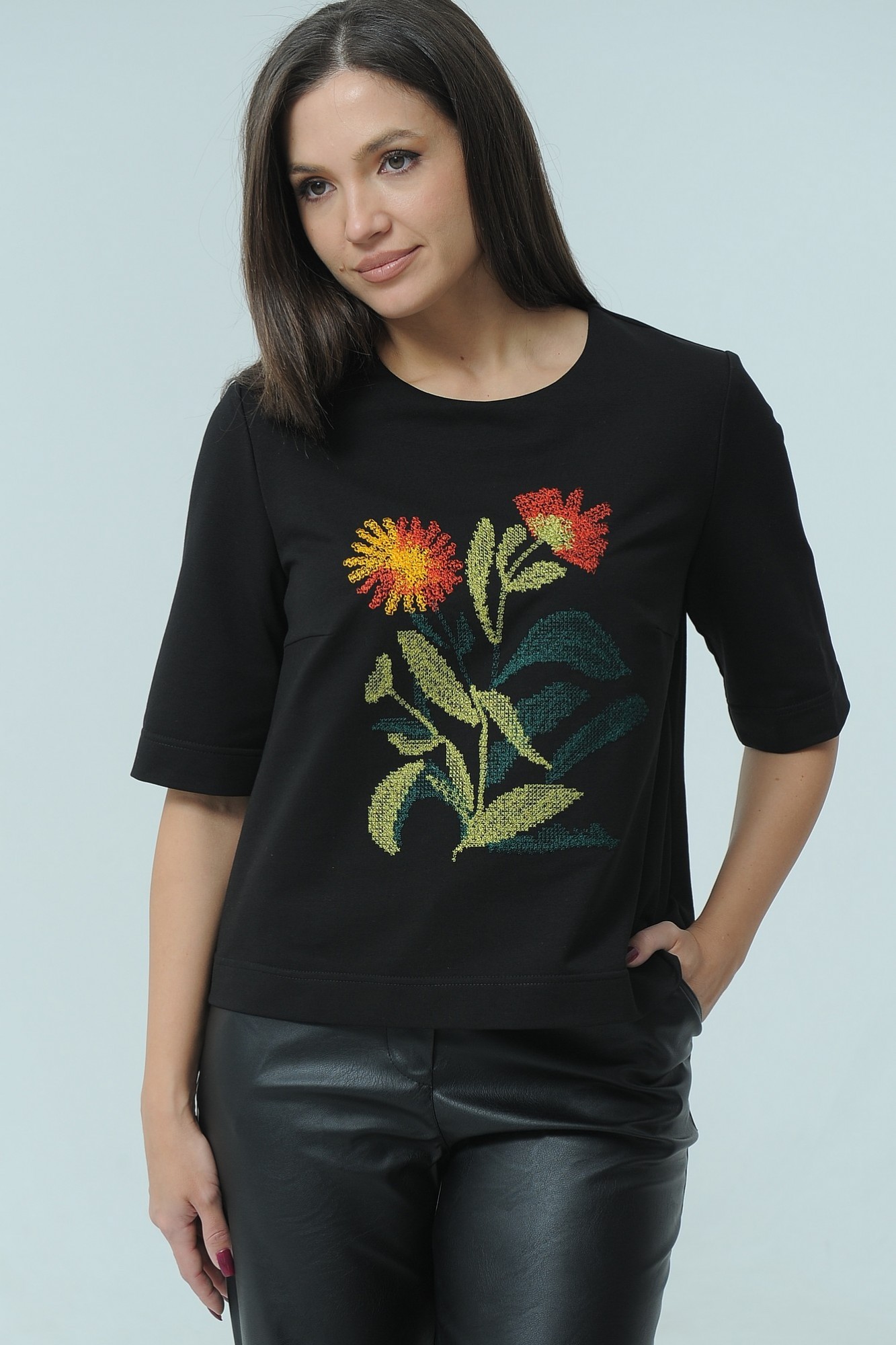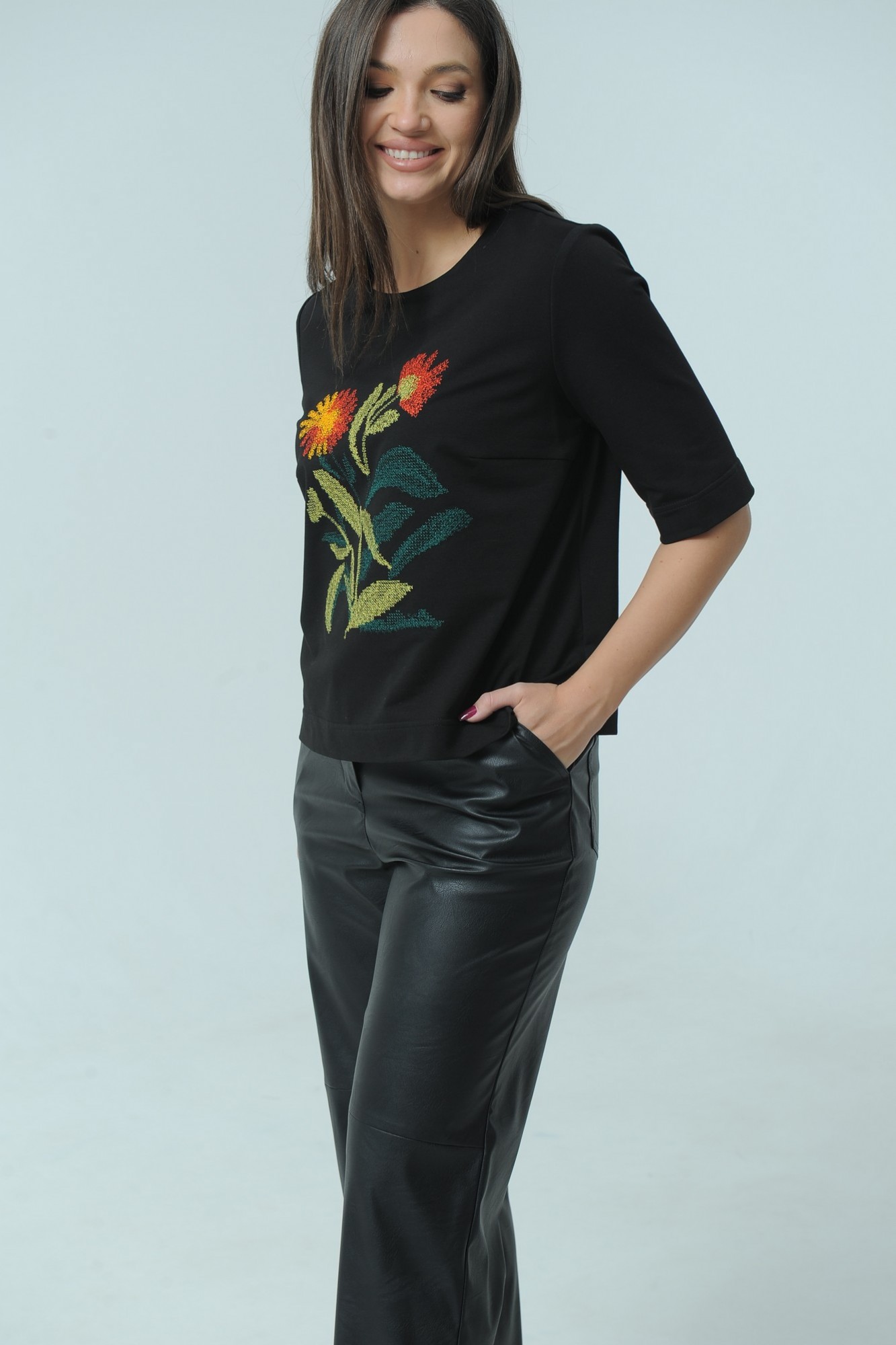 Горловина округлая, обработана обтачкой. Полочка цельная с нагрудными вытачками, на груди дизайнерская вышивка. Спинка со средним швом, в верхней части которого застежка на навесную петлю и пуговицу. Рукав короткий одношовный втачной.