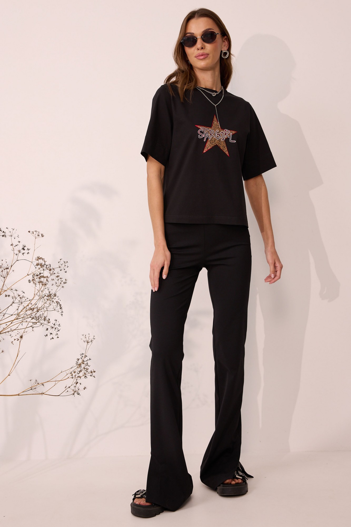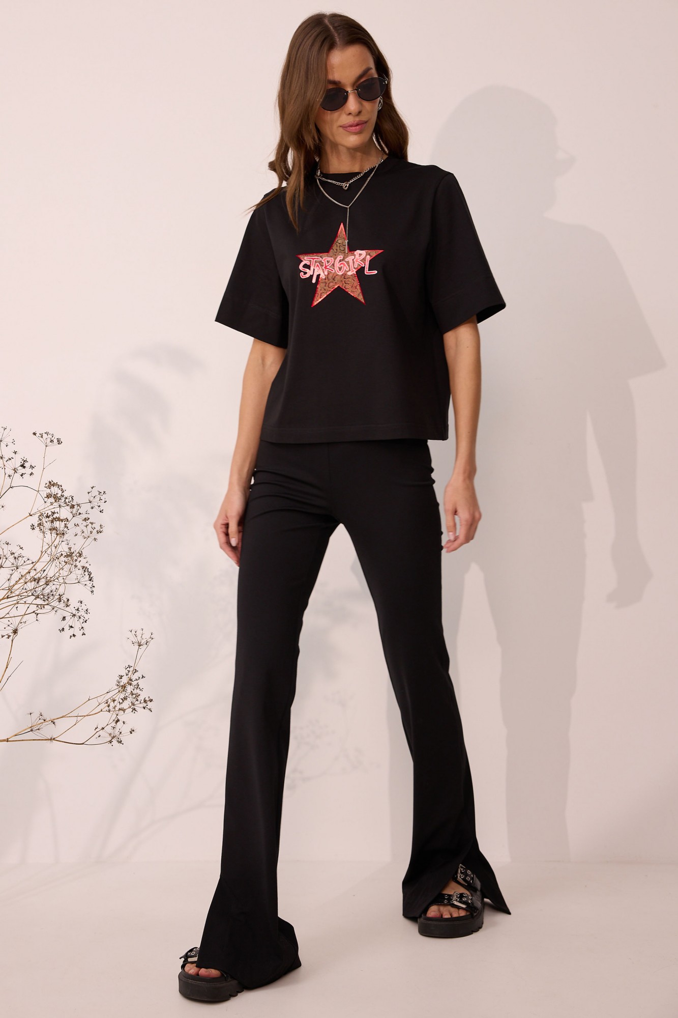 Джемпер прямого силуэта из трикотажного полотна. Горловина округлая. Рукав втачной. По переду дизайнерская печать.