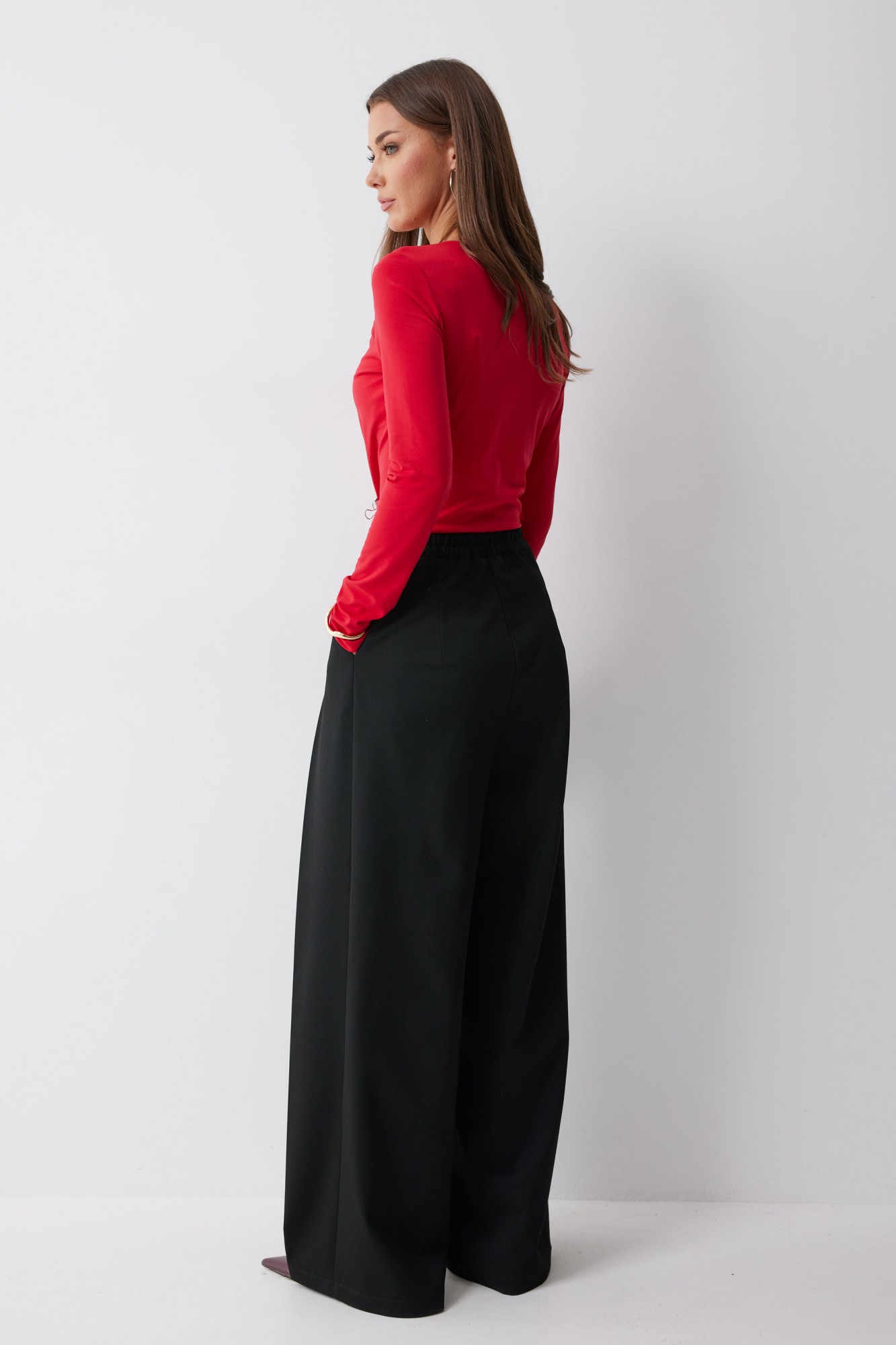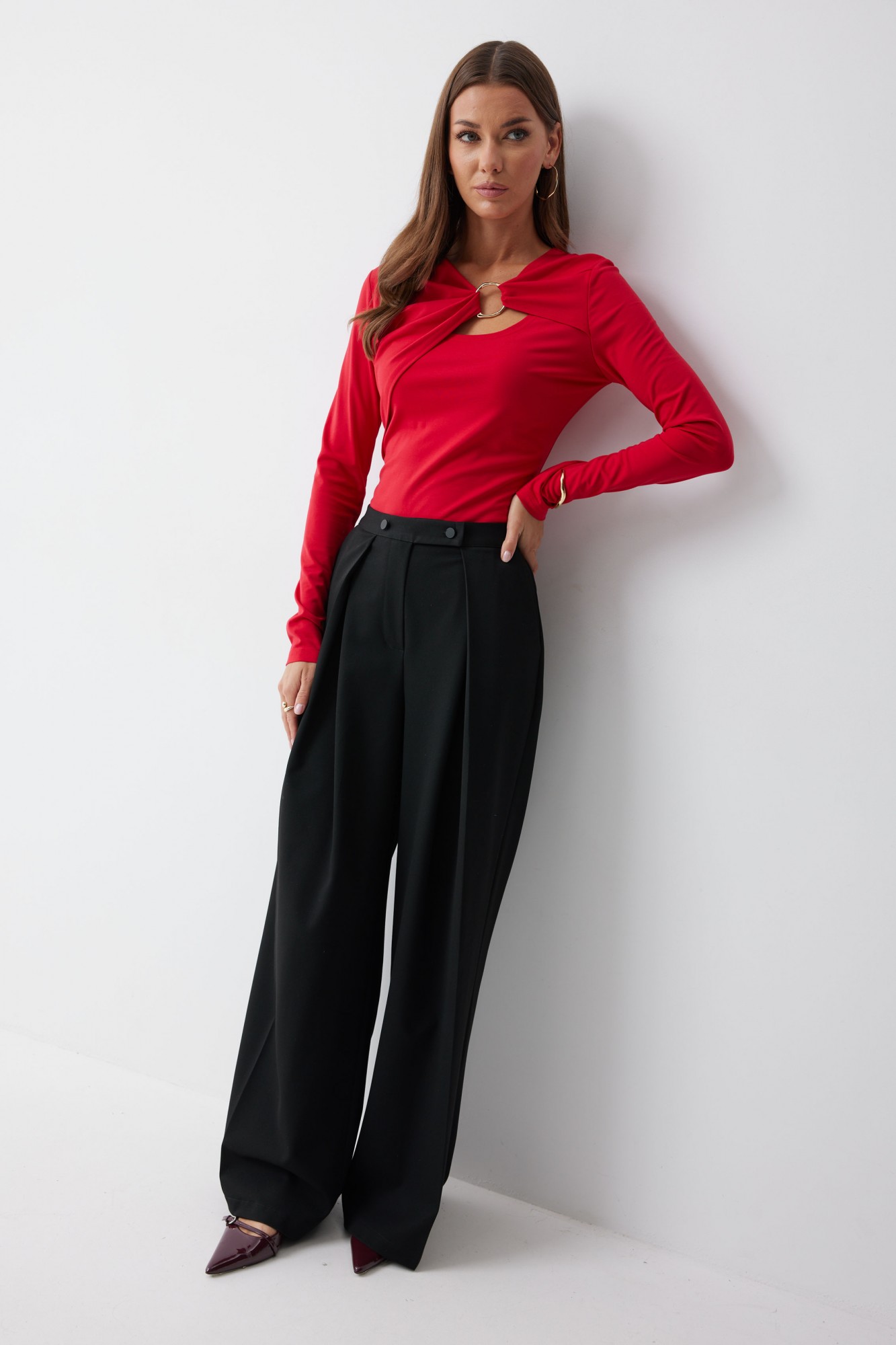 Джемпер прилегающего силуэта из трикотажного полотна. Горловина с фигурным вырезом декоративными складками и фурнитурой. Рукав втачной удлиненный. Обращаем ваше внимание, что фурнитура может отличаться от фото.
