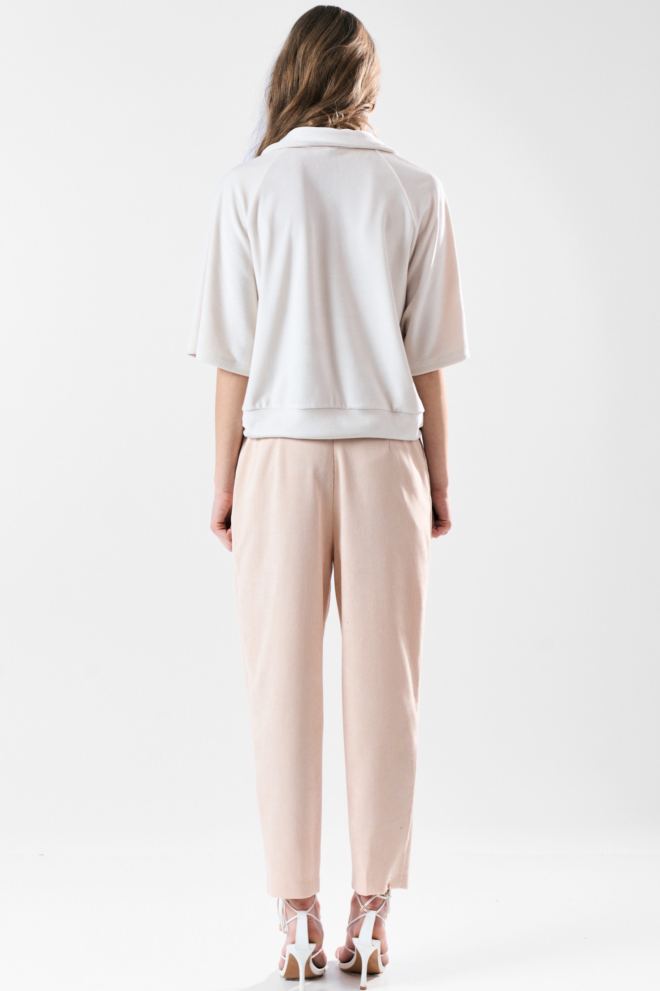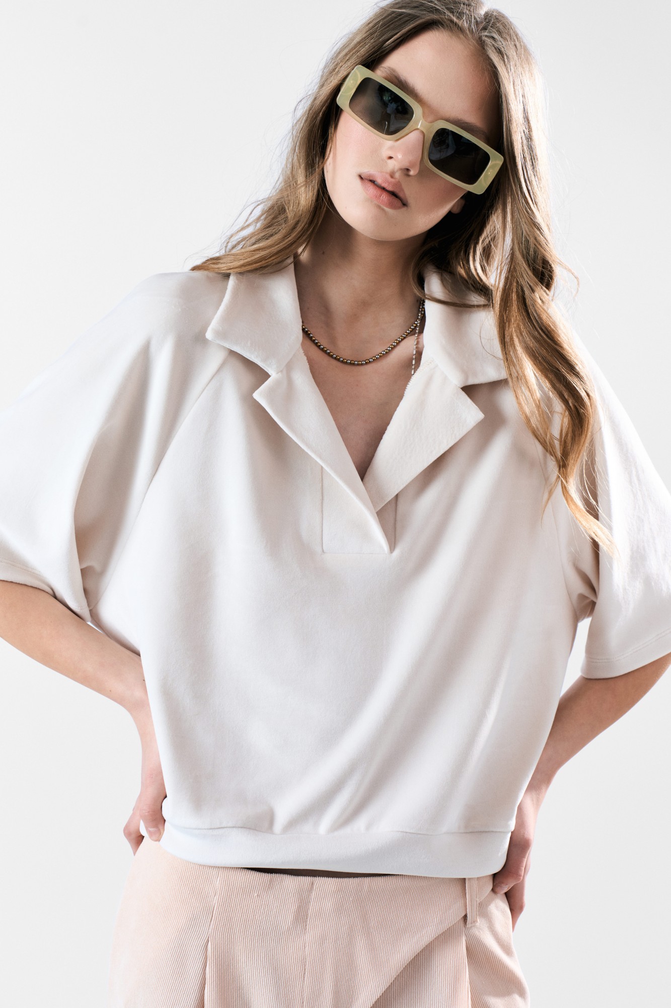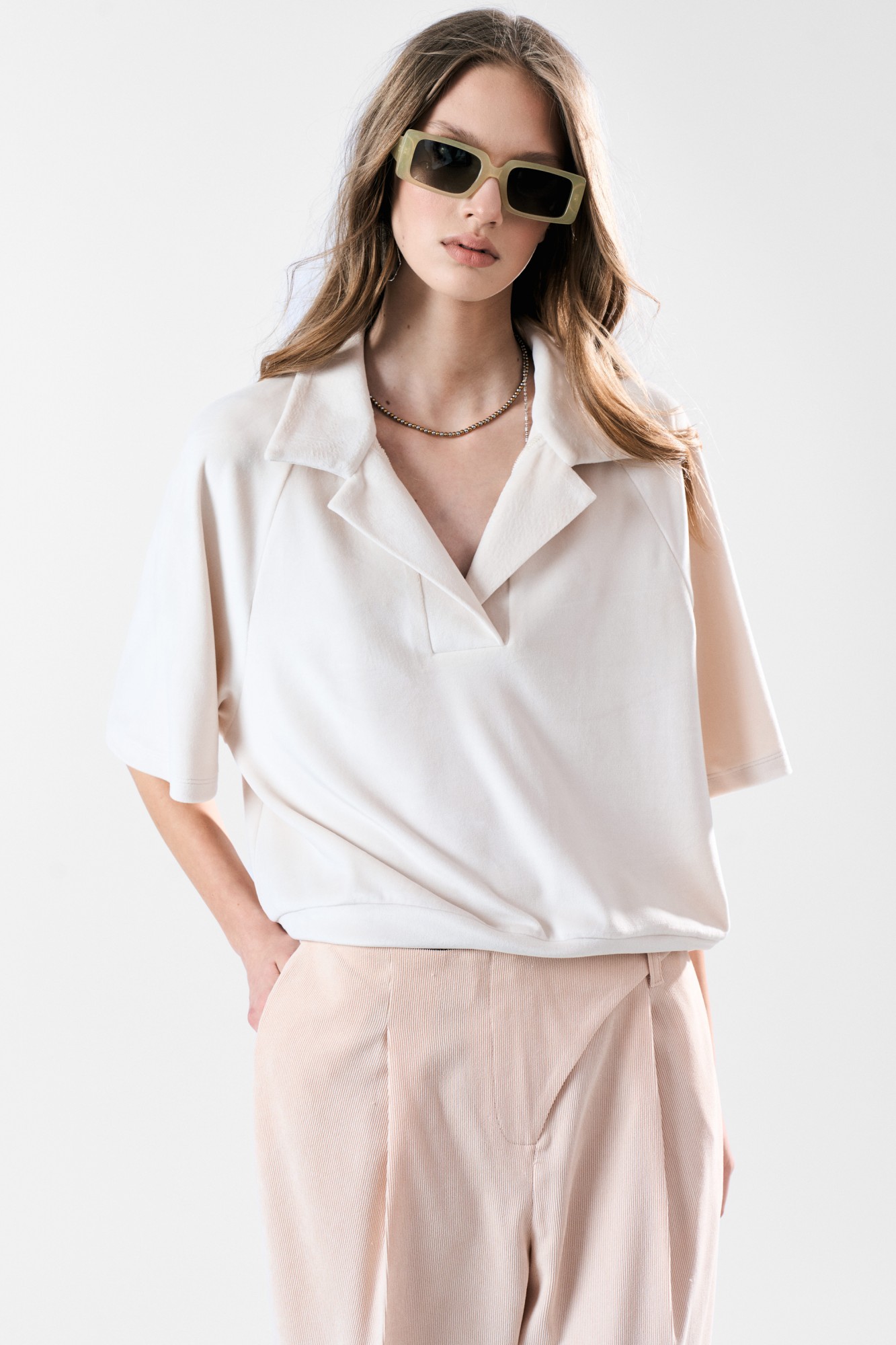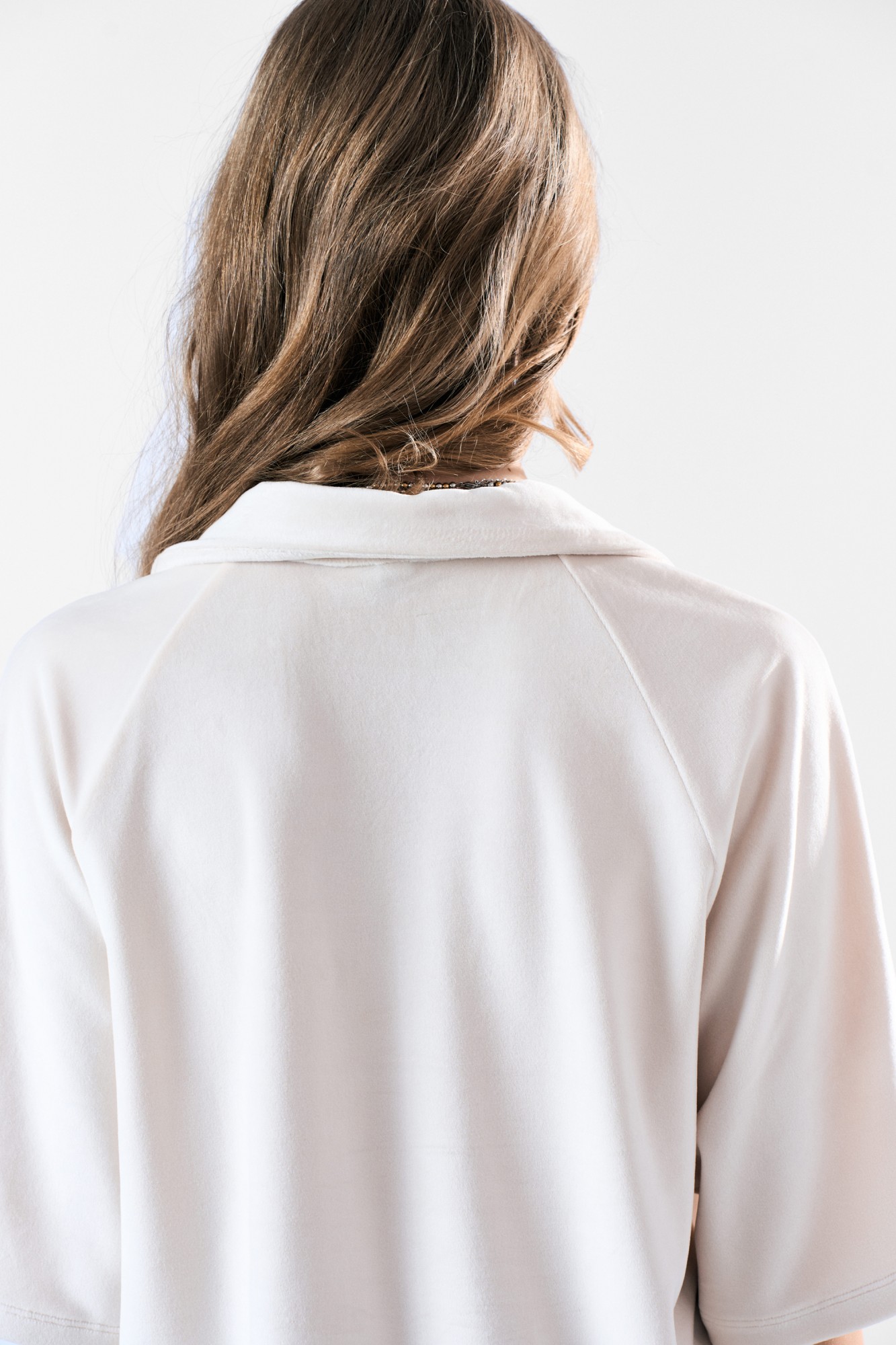 Джемпер с воротником поло из приятного мягкого бархата-велюра. Свободный силуэт, рукав-реглан. Два универсальных размера - S (42-44-46). M (48-50-52).