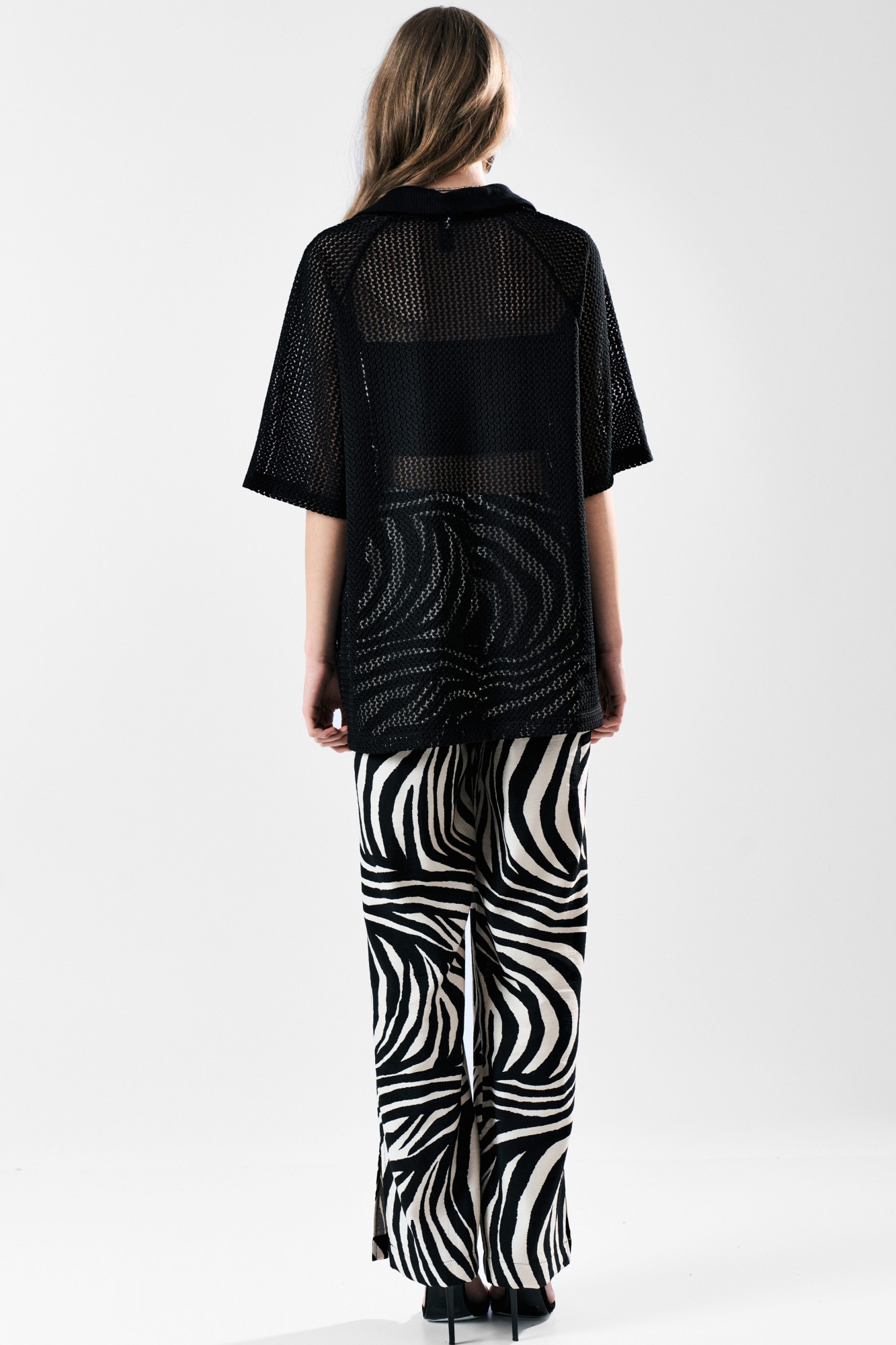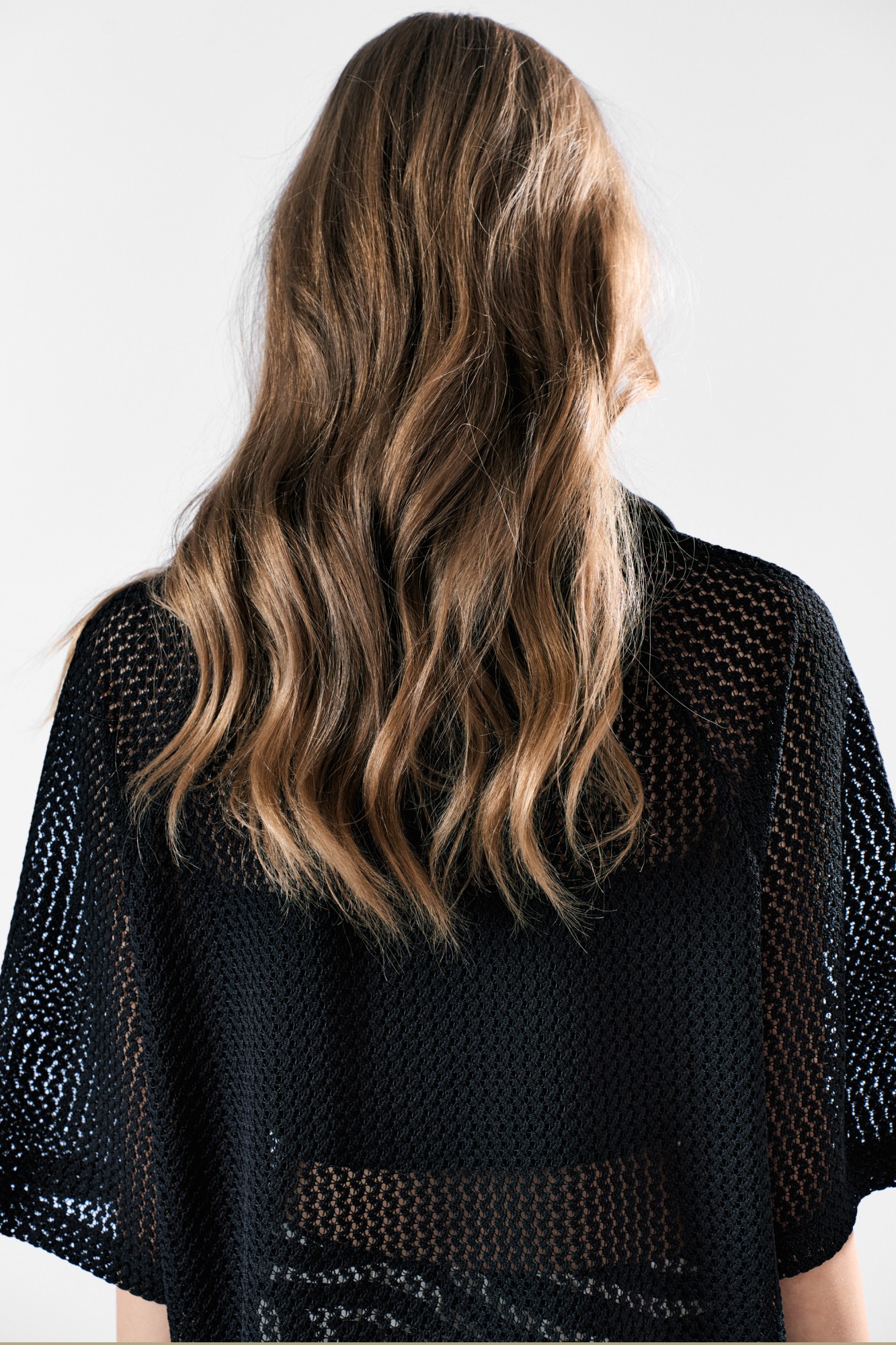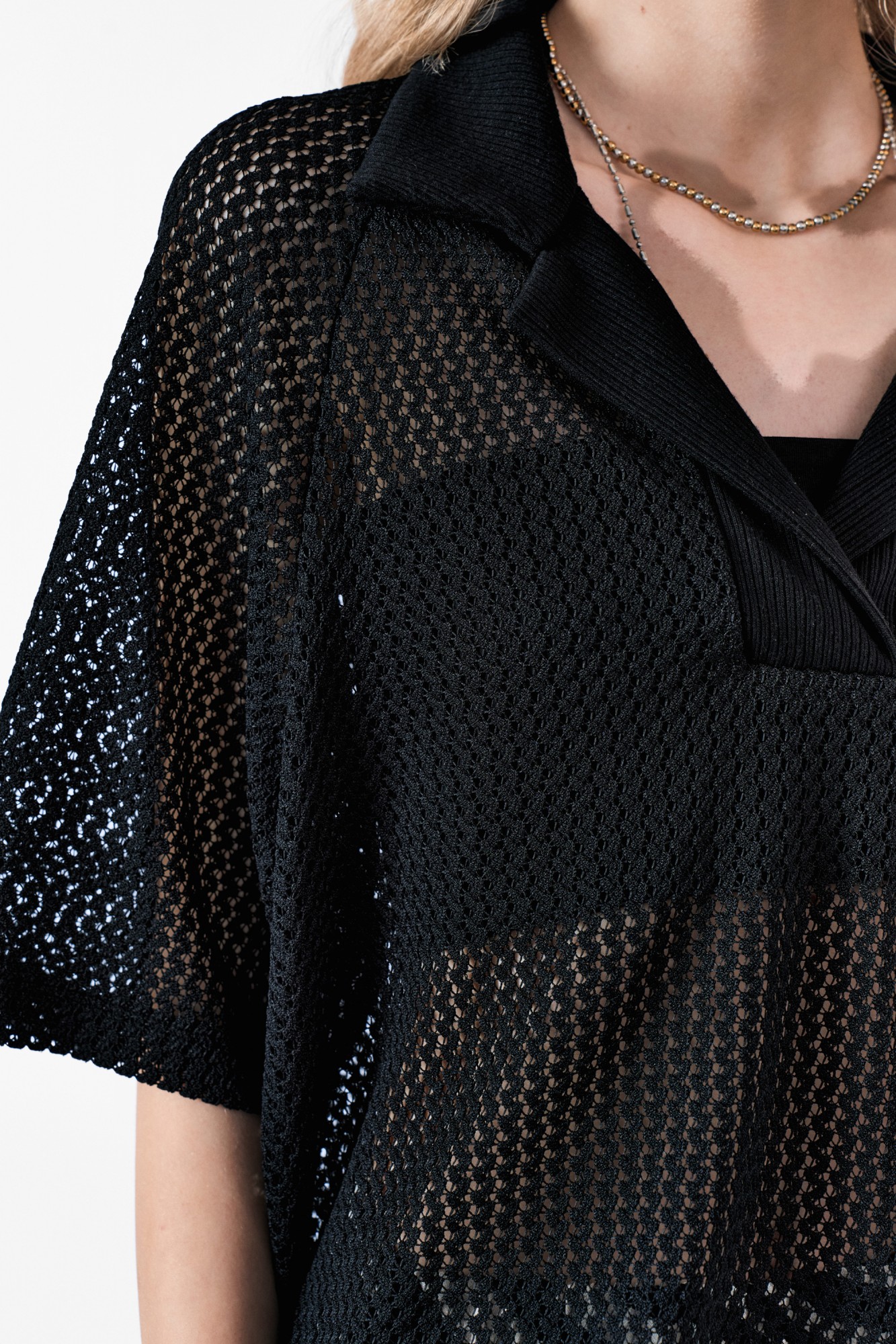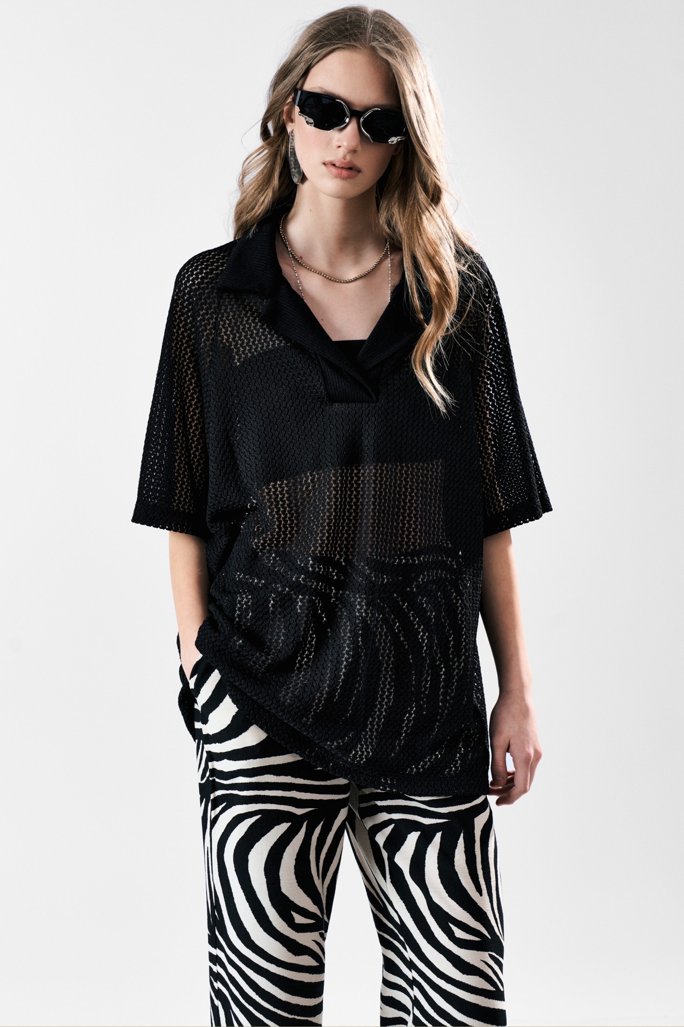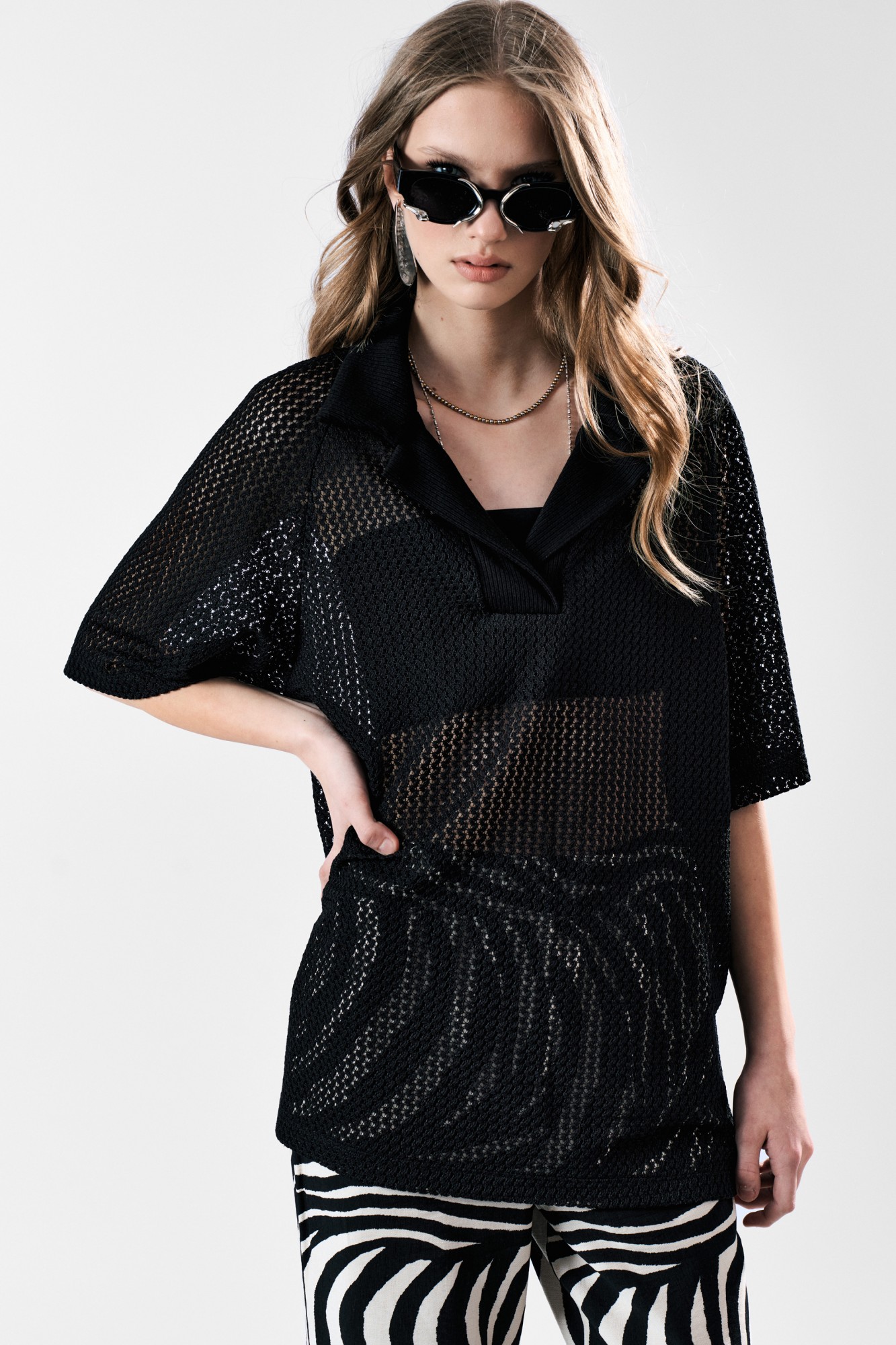 Поло из эластичной сетки с рисунком "волна". Силуэт - свободный, объемный. Рукав-реглан, до локтя. В комплекте полоска-топ из трикотажа (нижний слой).
