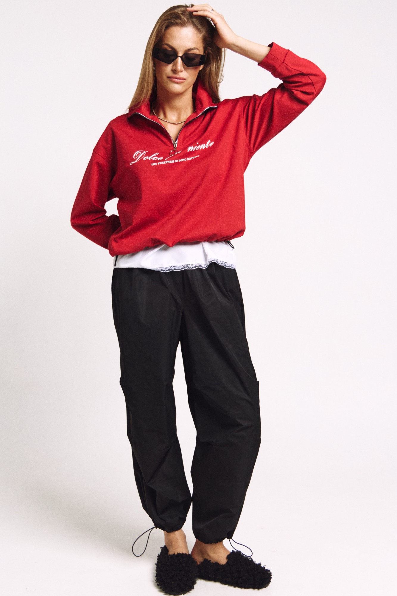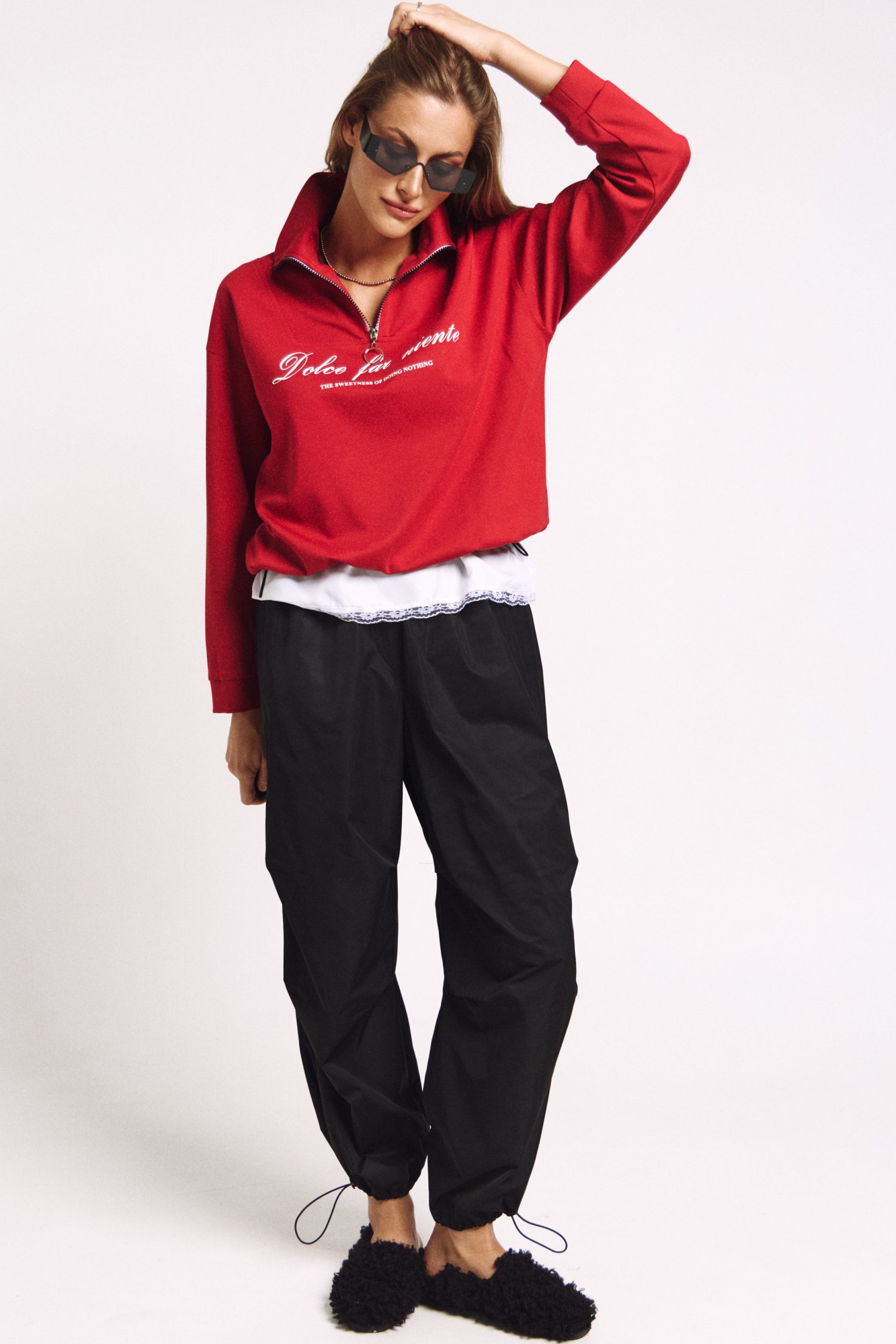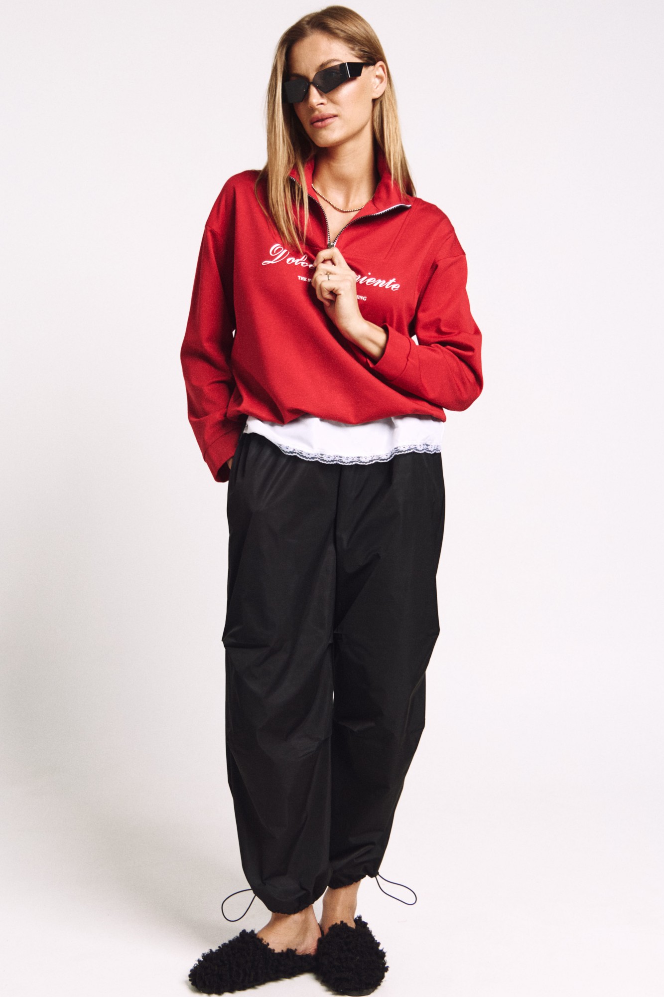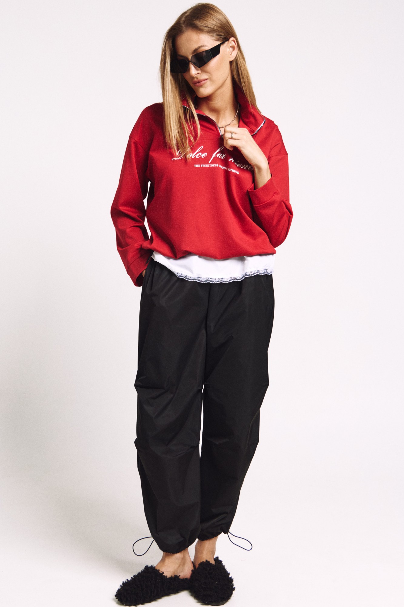 Джемпер в правильном красном цвете "скарлетт" со стойкой и молнией.