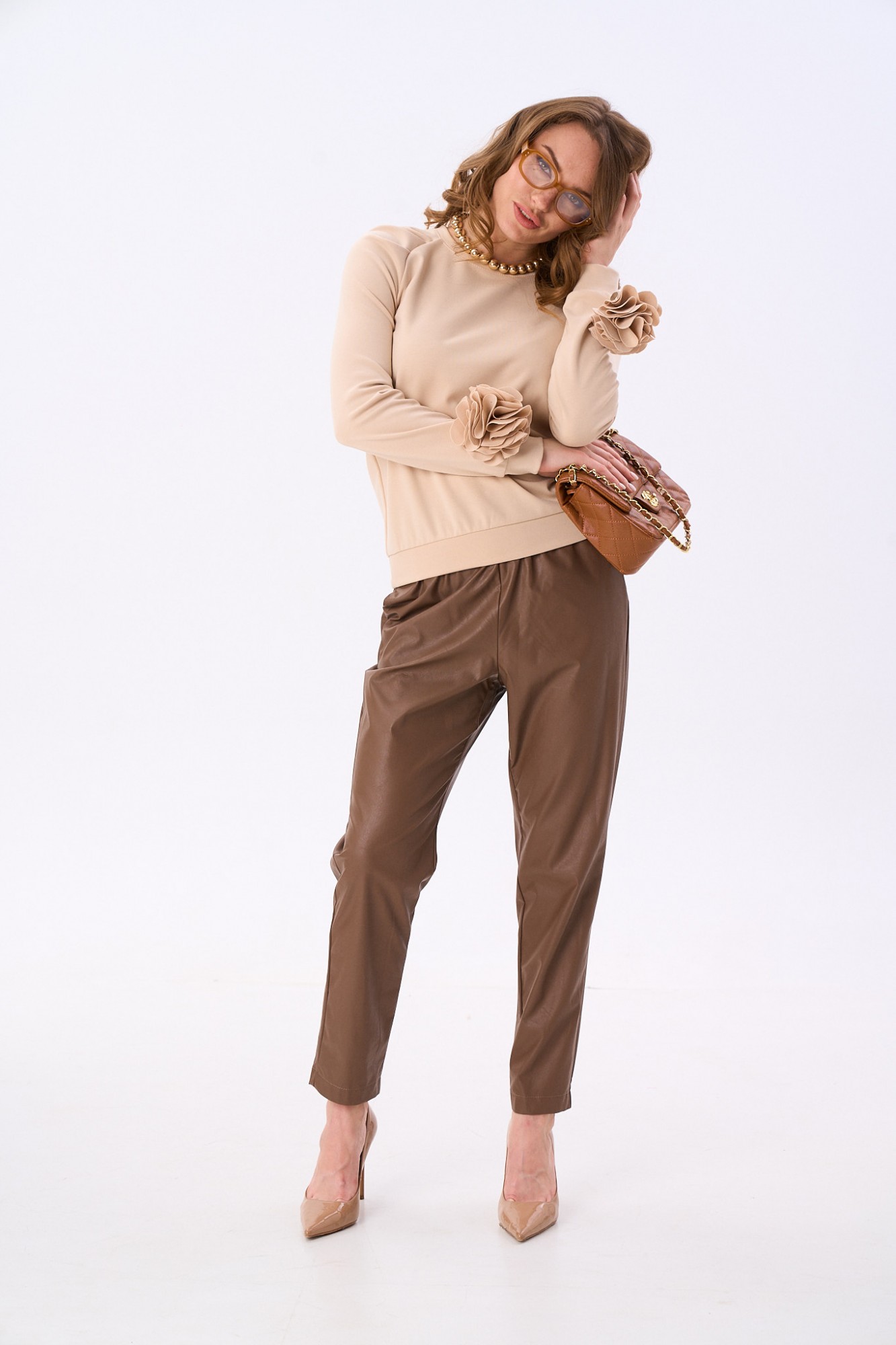 Уютный джемпер с округлой горловиной. Защипы на рукаве-реглане делают образ максимально женственным и элегантным. На рукавах есть съёмные авторские украшения в виде цветка из основной ткани.