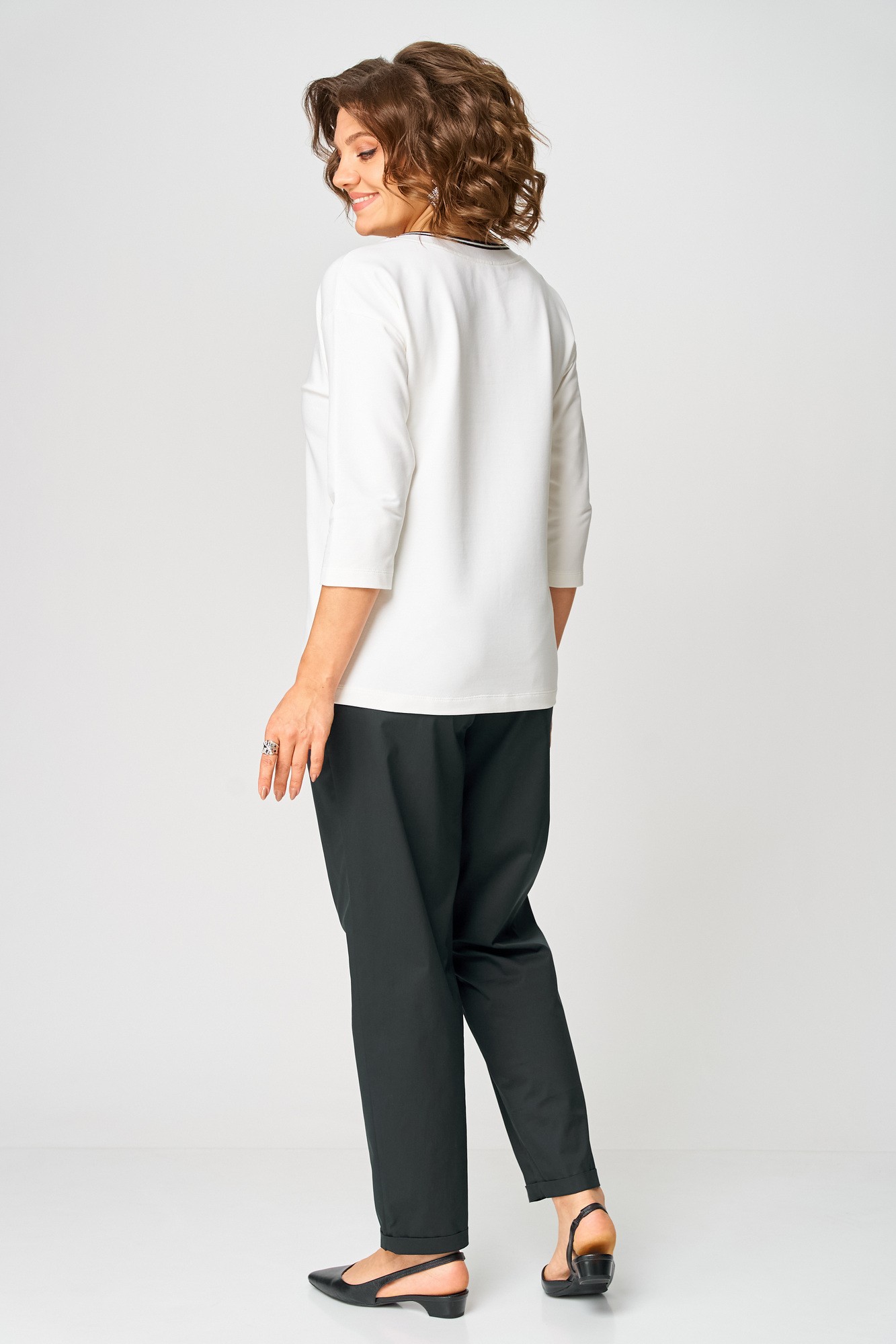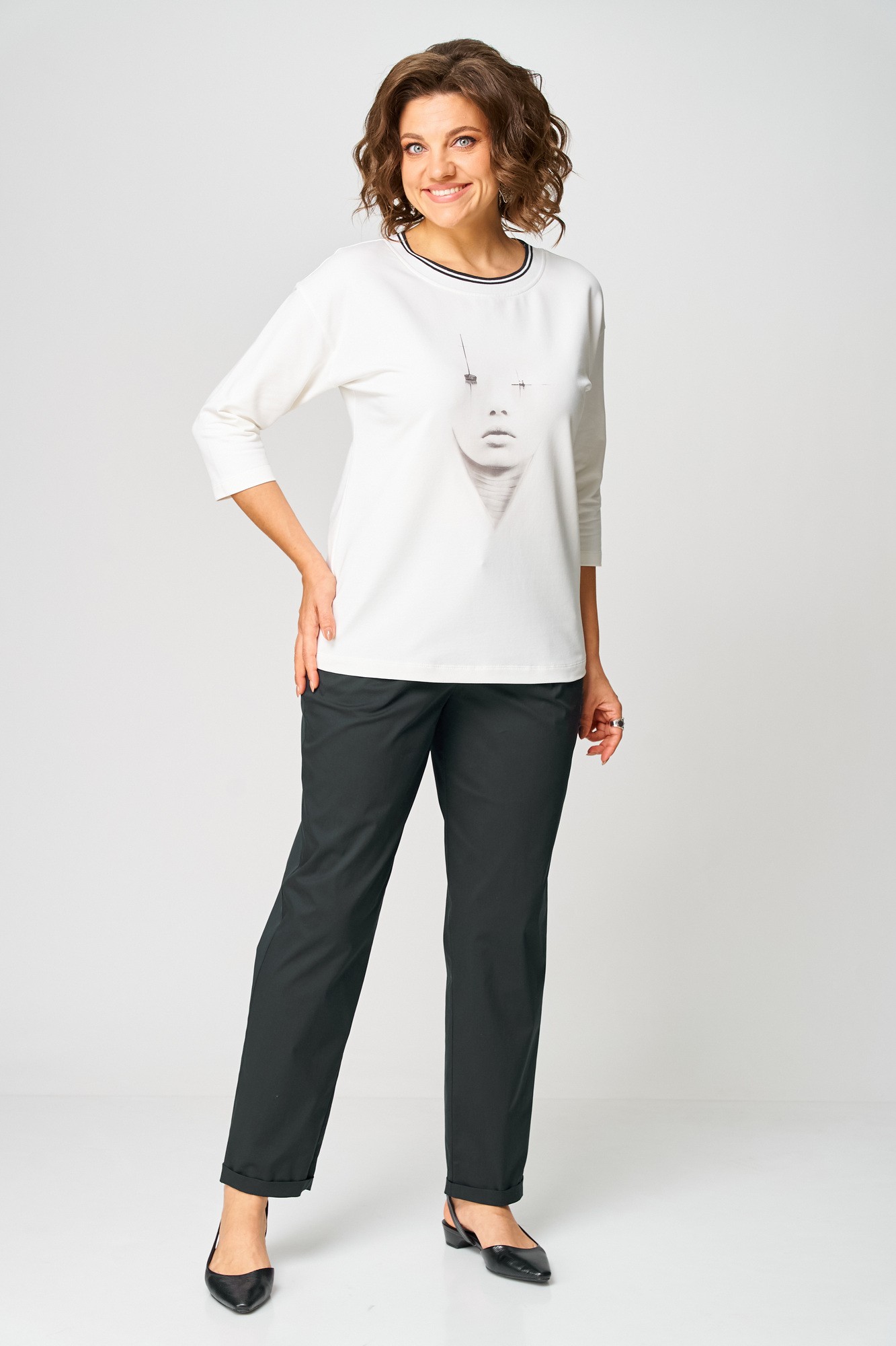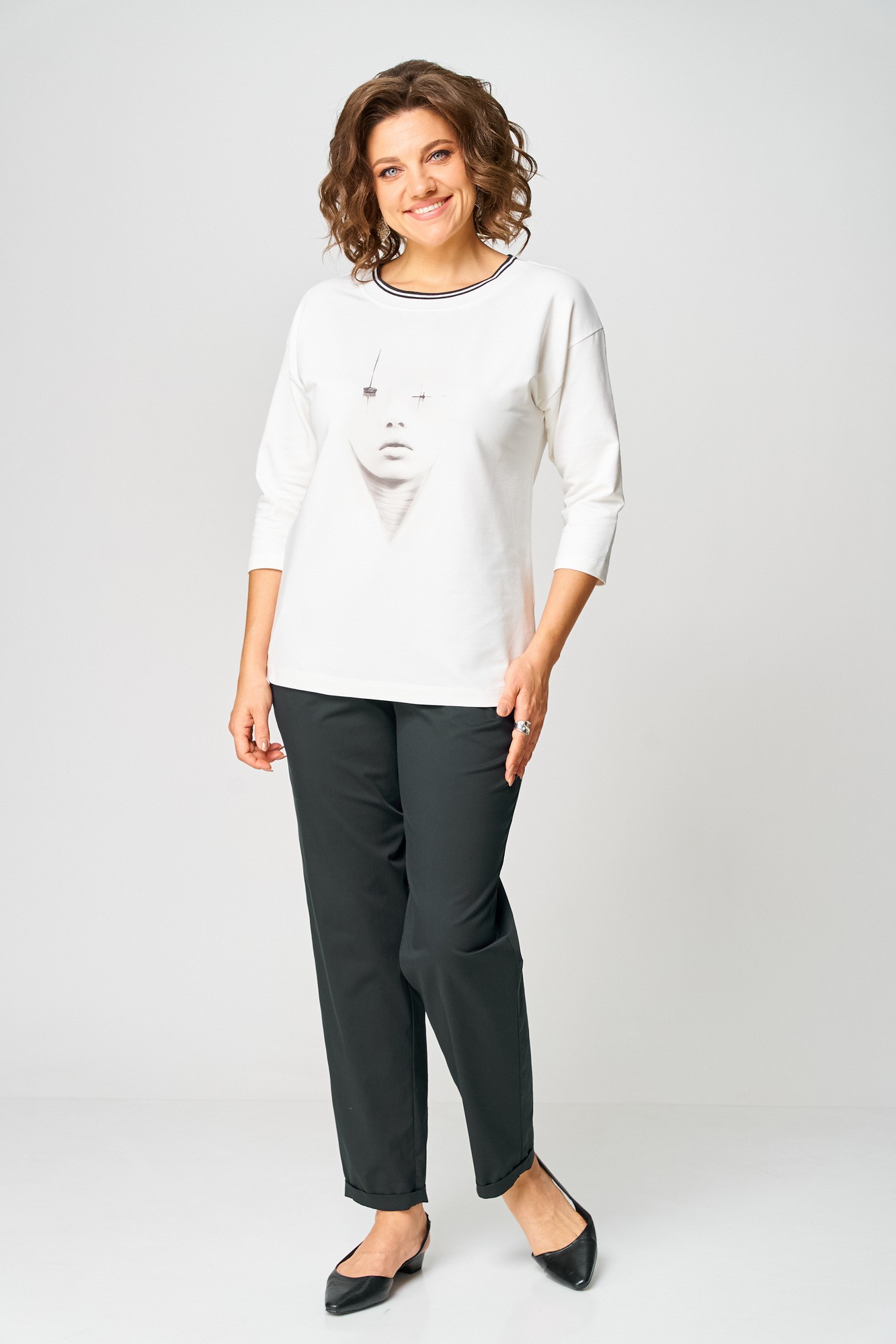Джемпер из трикотажной ткани (двунитка). Спущенное плечо. Рукав 3/4. Перед джемпера с принтом. Вырез горловины круглый, обработан довязом. Спинка без среднего шва.