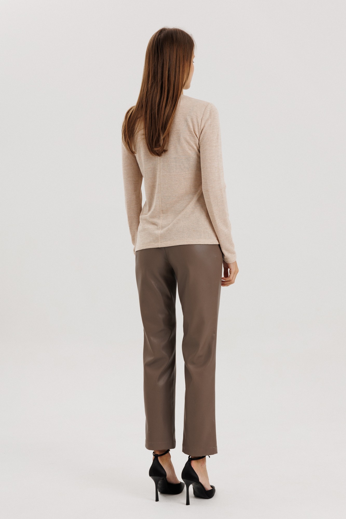 Базовый трикотажный джемпер прямого кроя из мягкой ткани бежевого цвета, по переду и спинке разрезной с отстрочкой, рукав втачной. Джемпер отлично будет сочетаться с любыми повседневными вещами.