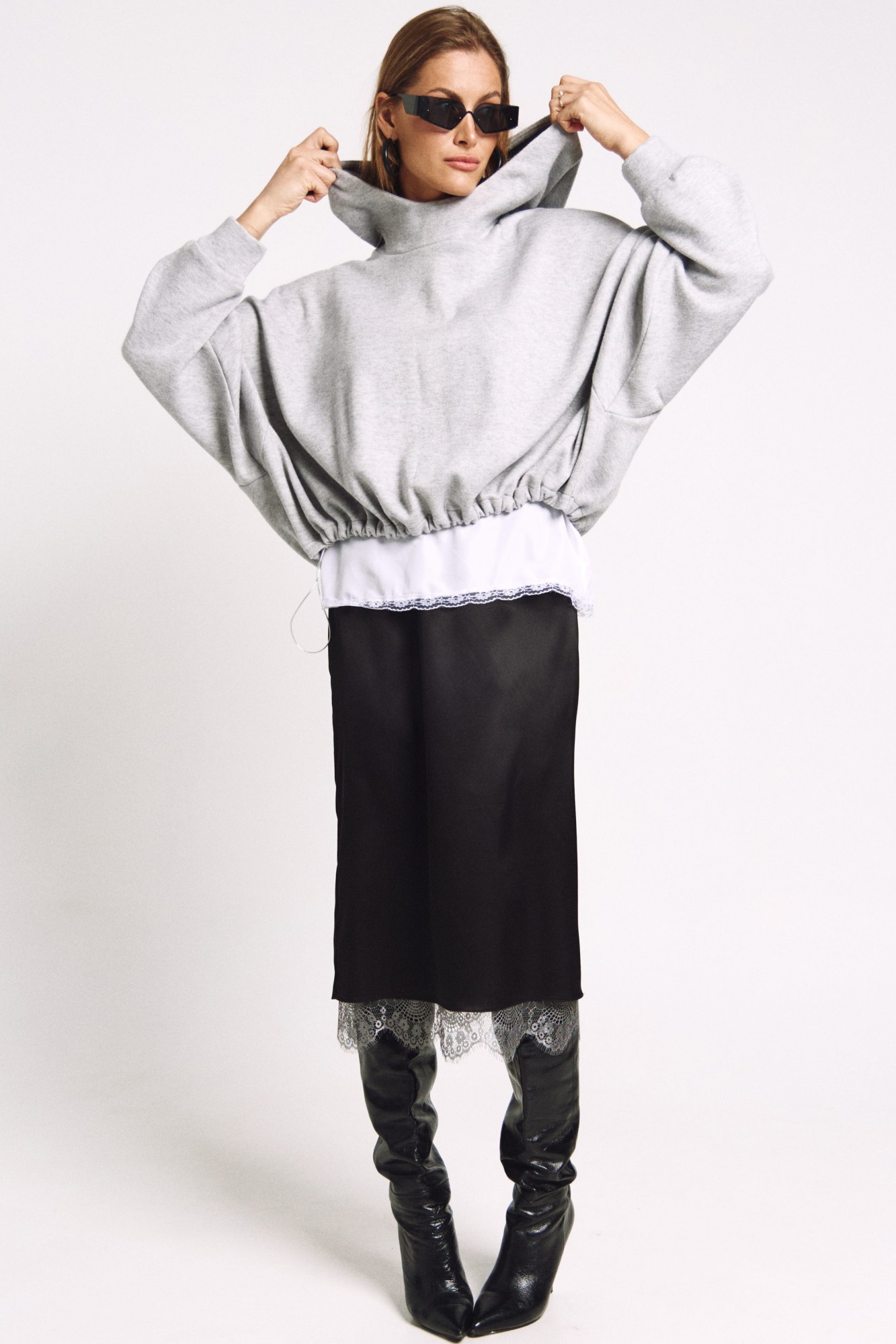 Худи большого объема с необычным капюшоном-стойкой. Ширина низа худи регулируется резинками. Два универсальных размера - S (соответствует 42-44-46), L (соответствует 48-50-52).