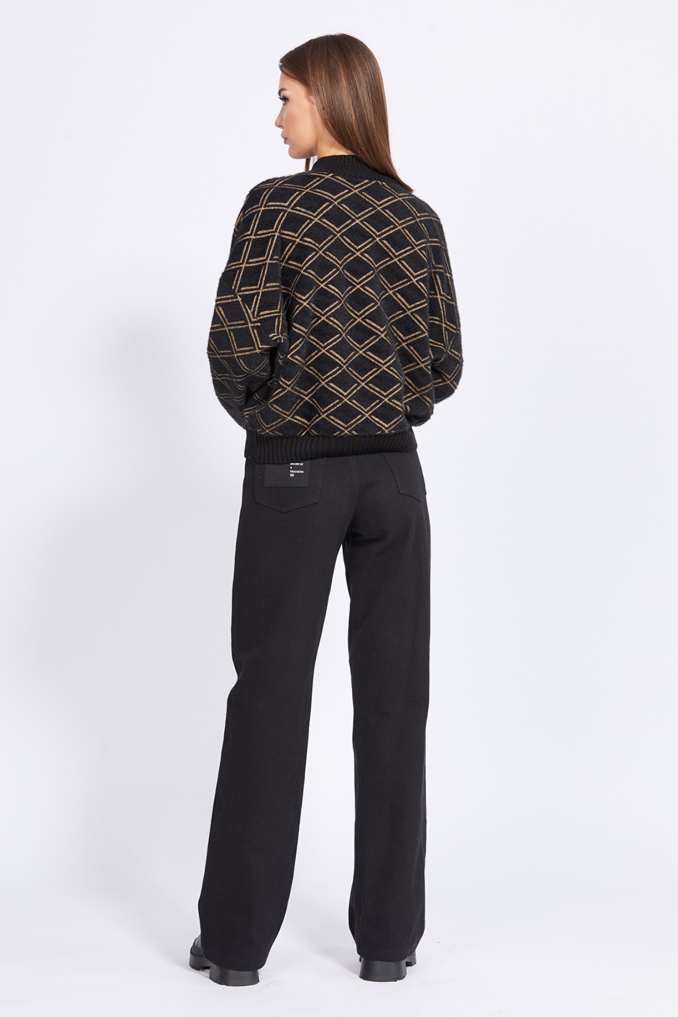 Джемпер выполнен из трикотажного полотна с геометрическим рисунком. Джемпер О-образного силуэта, длиной ниже линии талии. Перед и спинка цельные. Воротник-стойка из довяза. Плечевой шов спущен. Рукав одношовный. Низ рукава и джемпера на манжете из довяза.