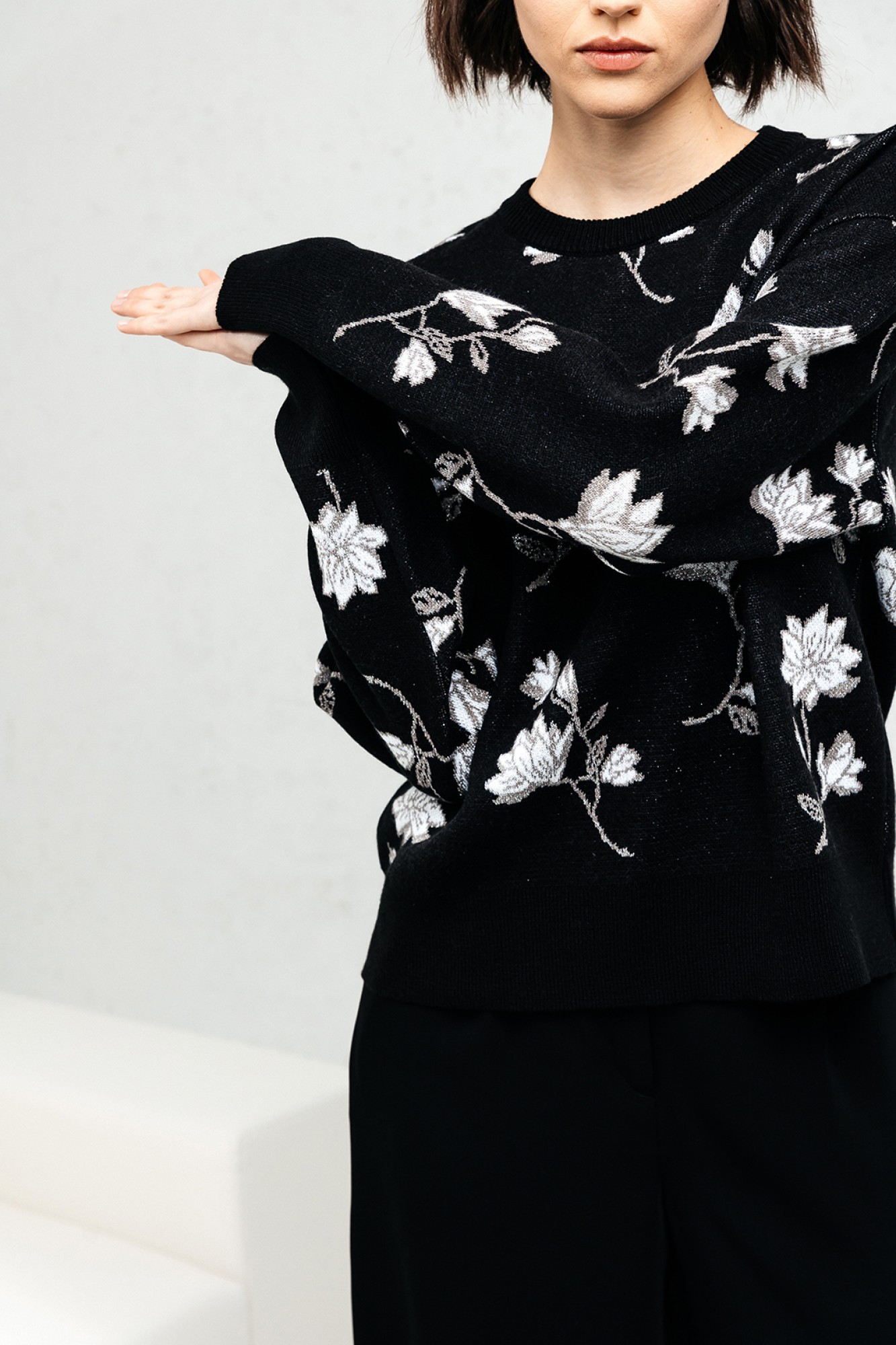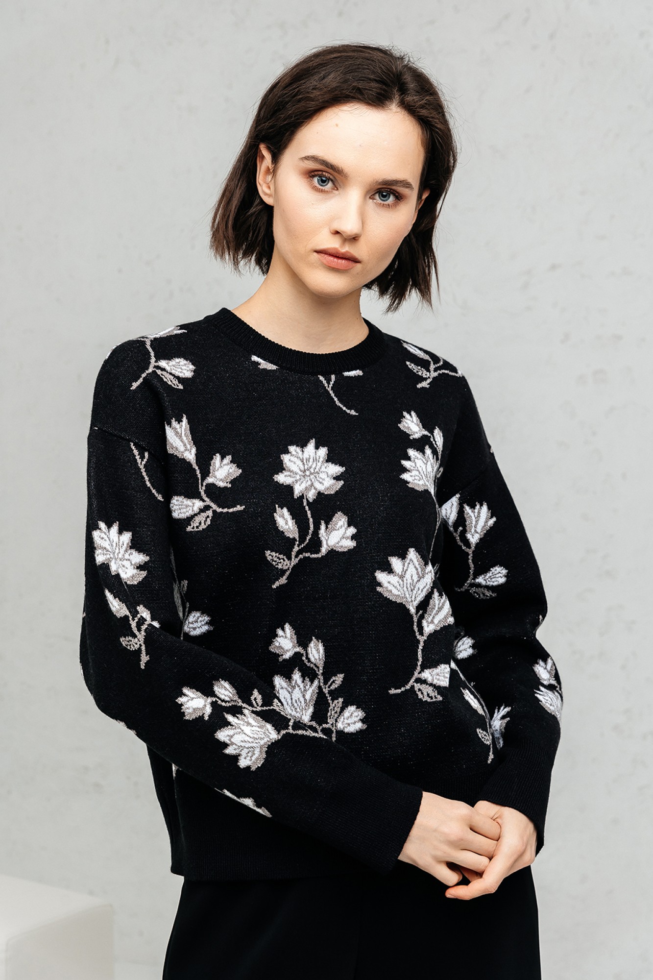 Джемпер прямого силуэта. Джемпер очень приятный к телу, вывязан жаккардовым переплетением. По переду, спинке и рукавам вывязаны цветы. Рукав втачной, длинный. Вырез горловины круглый обработан прикеттлёванной бейкой. Он нарядный сам по себе, так что после работы смело иди на встречу с подругой в кафе. Это базовый джемпер, который просто необходим в наше время!