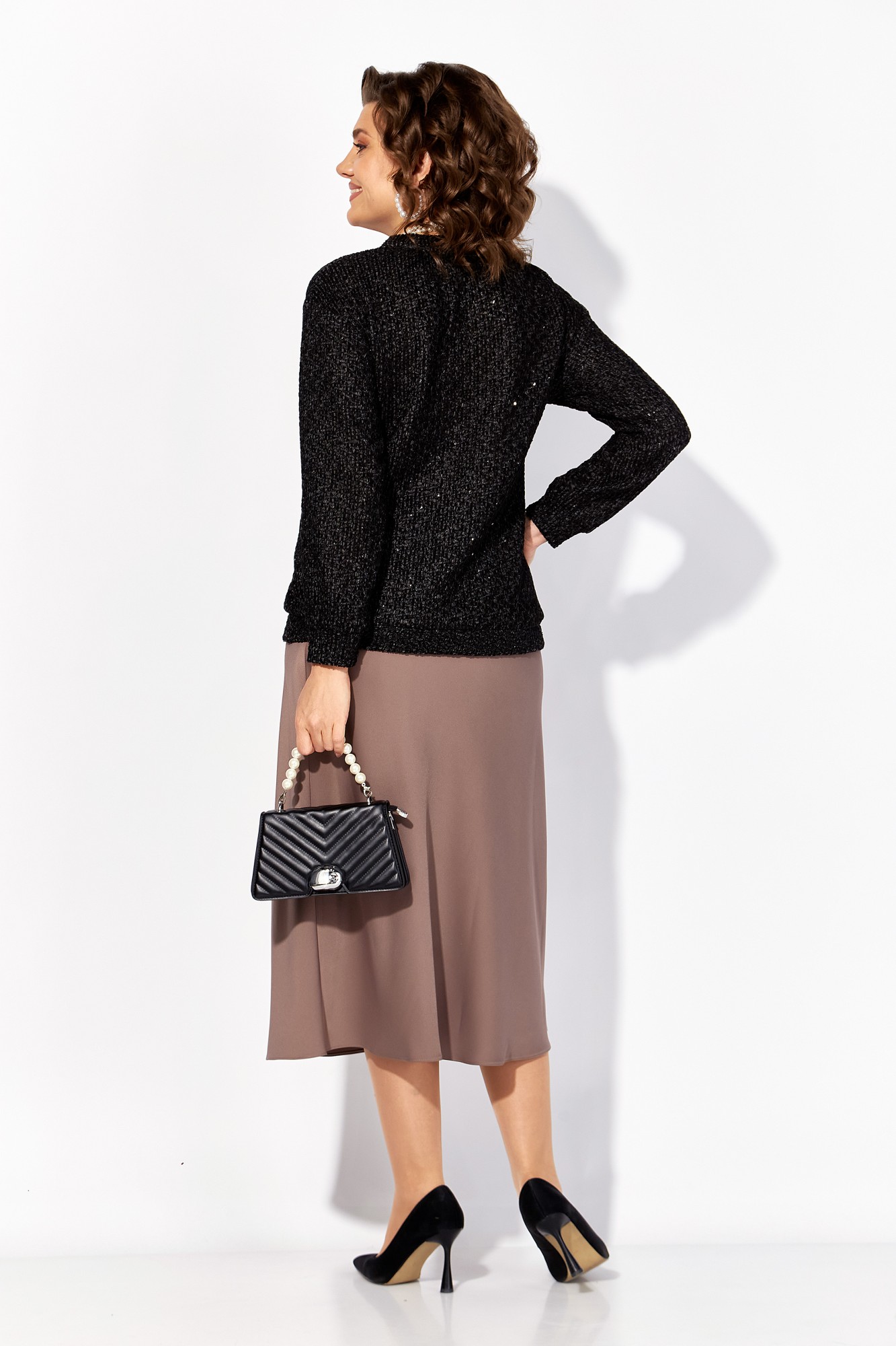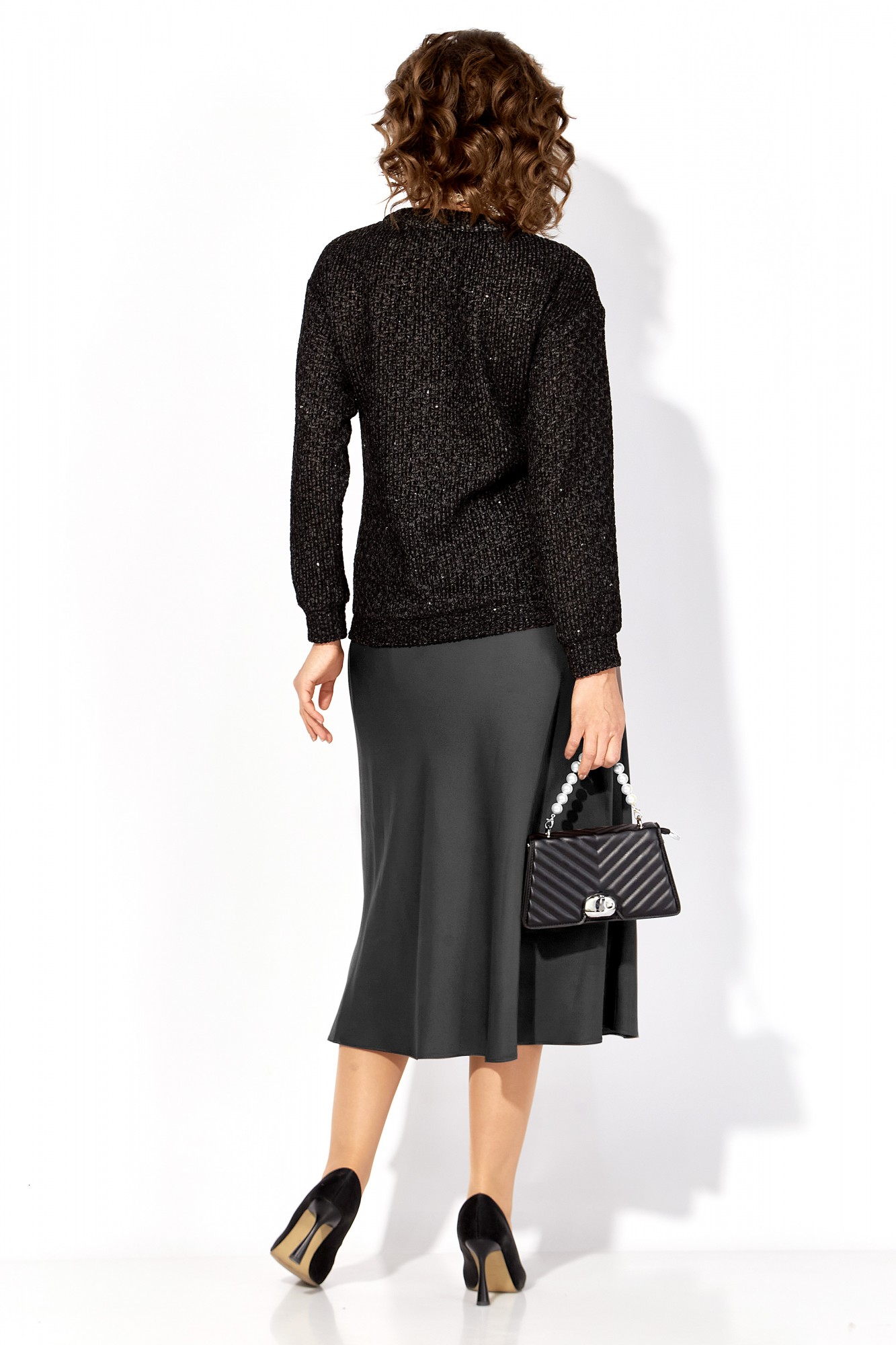 Вязанный черный джемпер с ажуром по вороту - это идеальный вариант для создания стильного и привлекательного романтического образа! Мягкий и нежный материал этого джемпера делает его очень приятным на ощупь, теплым и уютным, а легкое мерцание придает свою изюминку. Горловина v-образной формы приковывает взгляды к линии декольте. Рукав длинный, на спущенной линии плеча. Низ рукава, а также низ изделия оформлен мягкой трикотажной манжетой. Особенно актуальна данная кофточка на осенний и зимний период, за счет качественного состава, не пропускает холод обеспечивает тепло и комфорт!