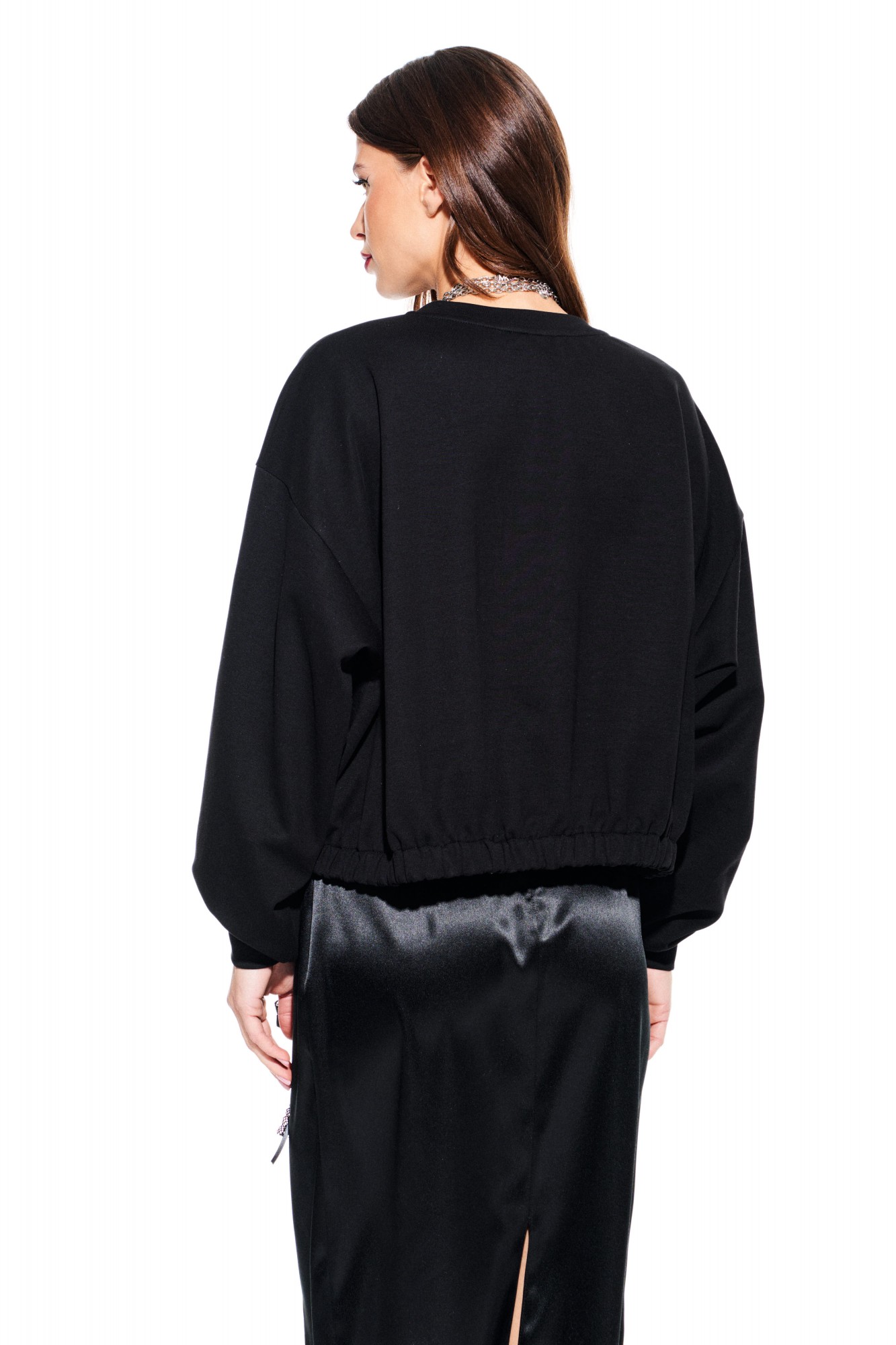 Свитшот из трикотажного полотна, свободного объема, прямого силуэта, с круглым вырезом горловины. Перед с фигурной линией низа со сборкой на резинку, декоративными полукольцами и тесьмой из кружева и атласа. Спинка со сборкой на резинку по низу изделия. Рукав втачной, длинный. По низу рукава притачные манжеты.