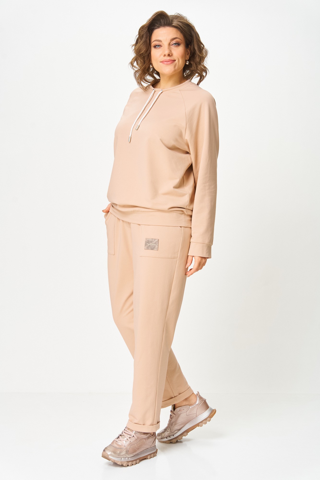 Джемпер женский из трикотажной хлопковой ткани (двунитка). Рукав реглан. Низ рукава обработан притачной манжетой. Низ изделия оформлен притачным поясом. На спинке настрочен декоративный элемент. Вырез горловины круглый, обработан бейкой со шнуром.