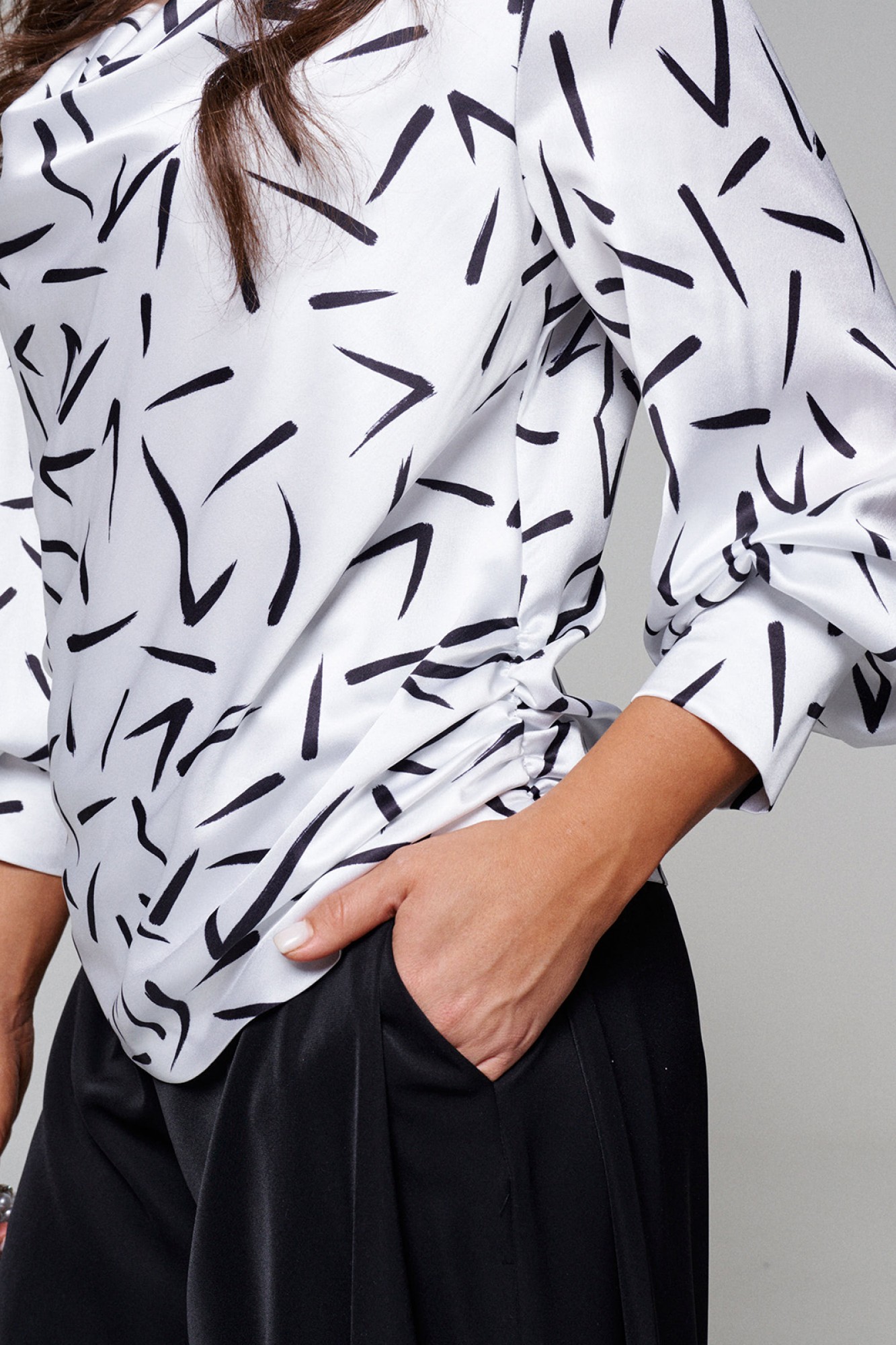 Блузкаслегкаприталенногосилуэта; выполнена из шёлк-шифона. Эта ткань почти не просвечивает и легко драпируется.Отличительной особенностью является глянцевый блеск.