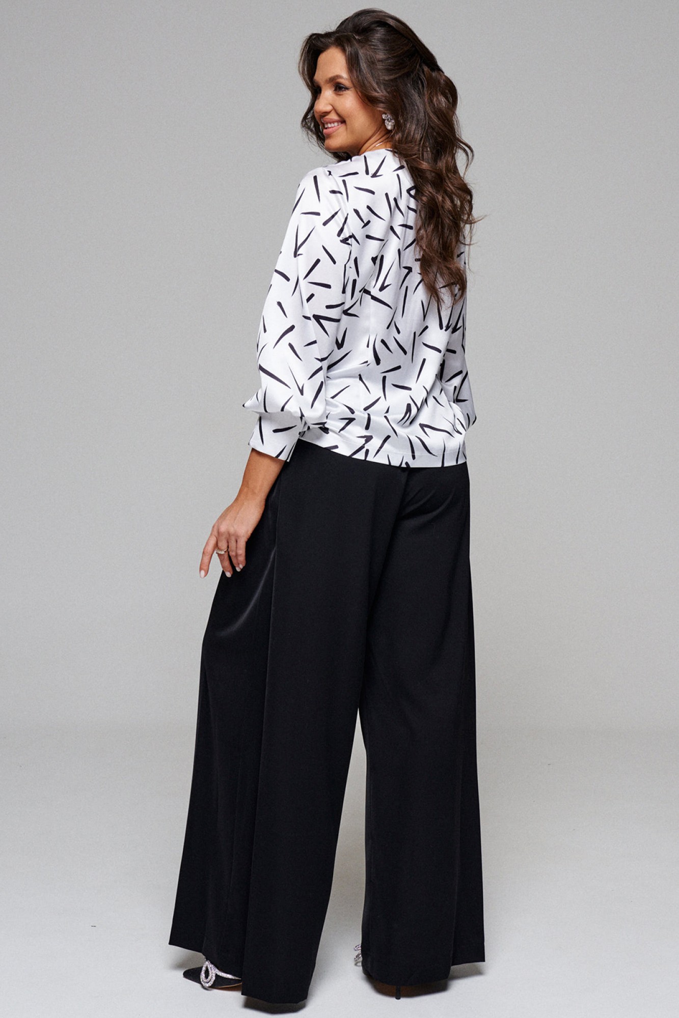 Брюки широкие, типа «палаццо»; свободного, прямого силуэта; с двумя глубокими складками в верхней части бокового шва и двумя внутренними карманами, выгодно скрытыми внутри складки.
