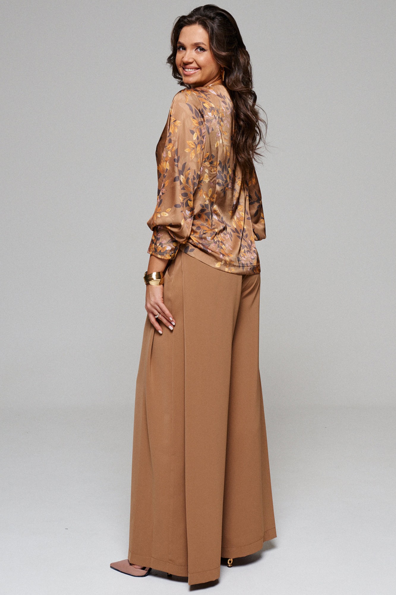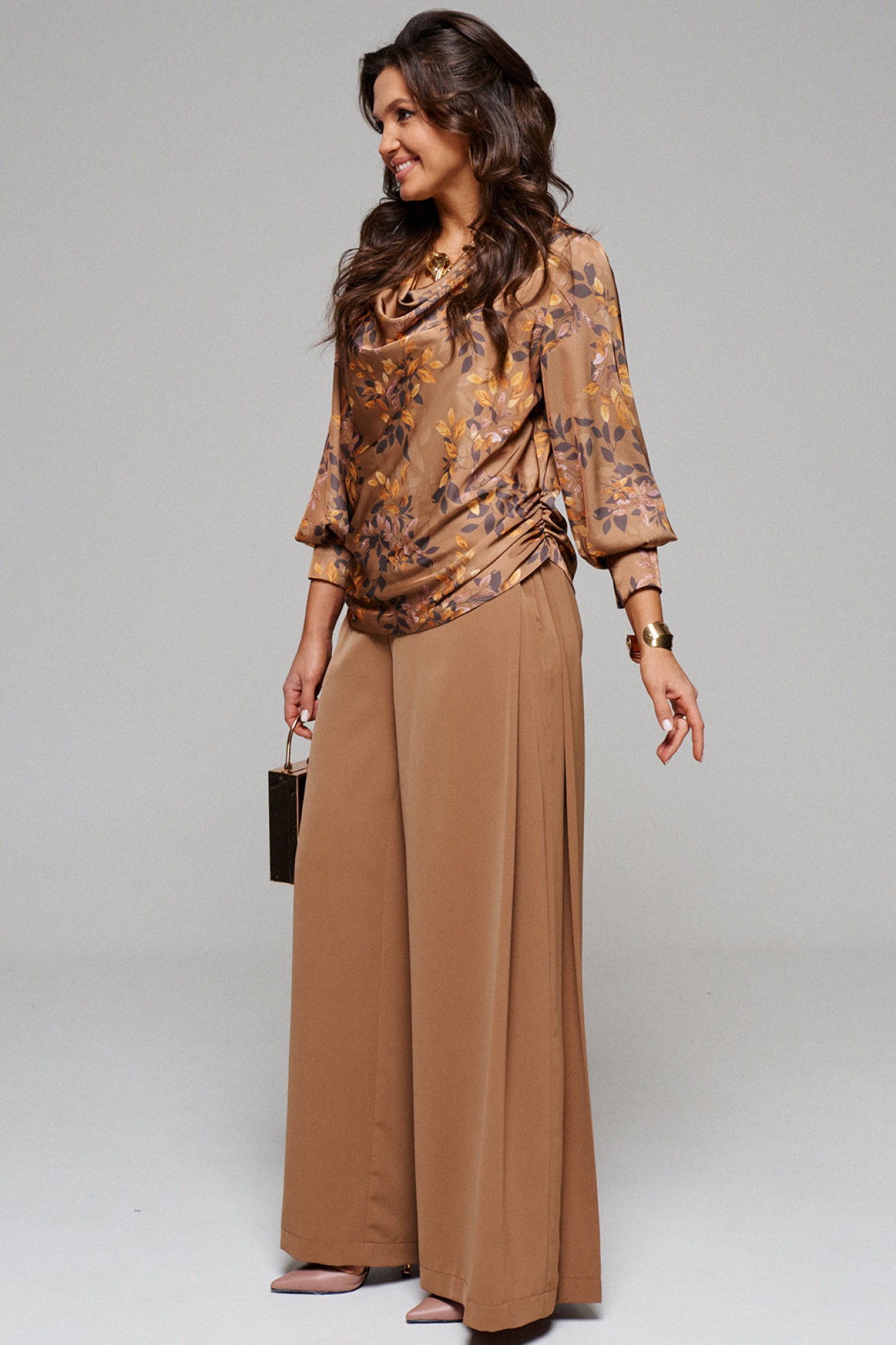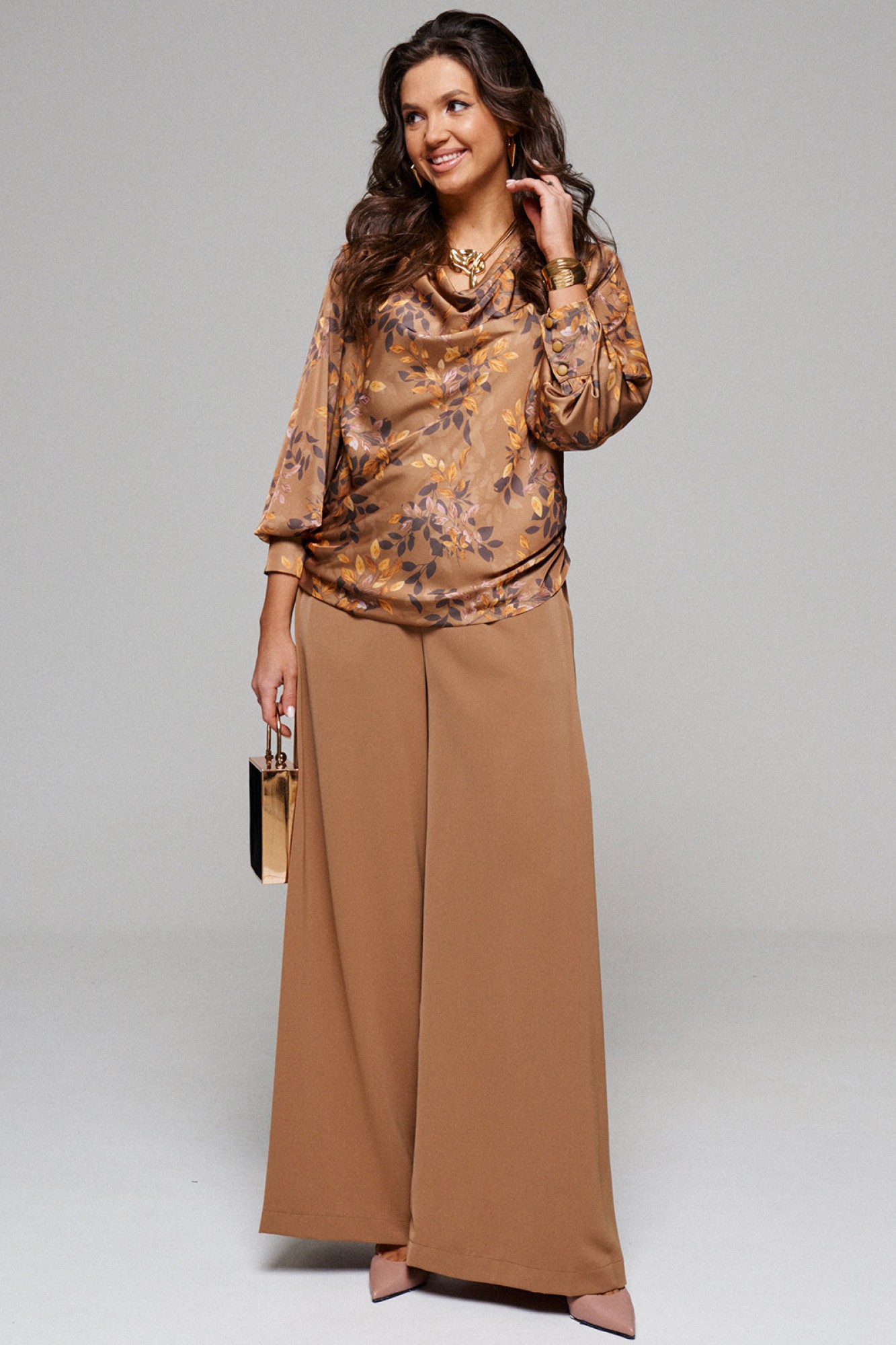 Брюки широкие, типа «палаццо»; свободного, прямого силуэта; с двумя глубокими складками в верхней части бокового шва и двумя внутренними карманами, выгодно скрытыми внутри складки.