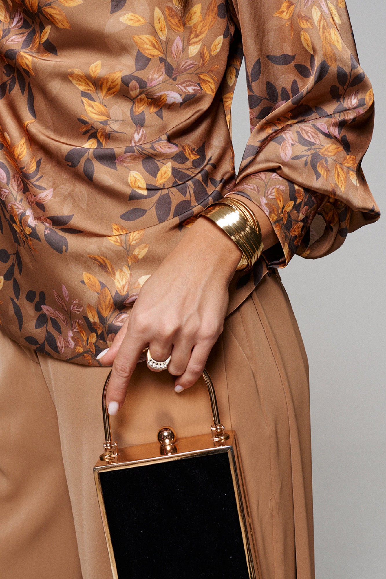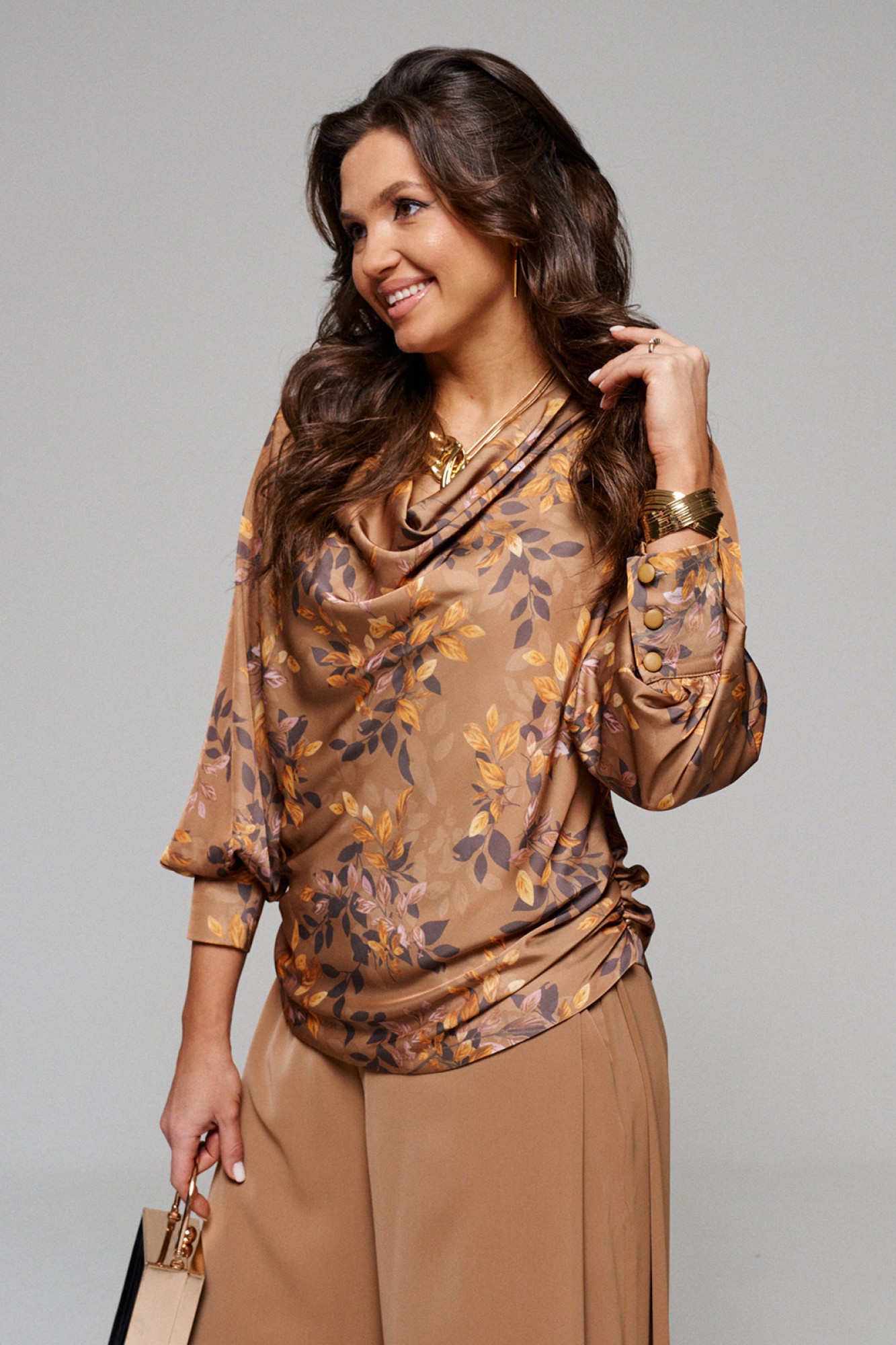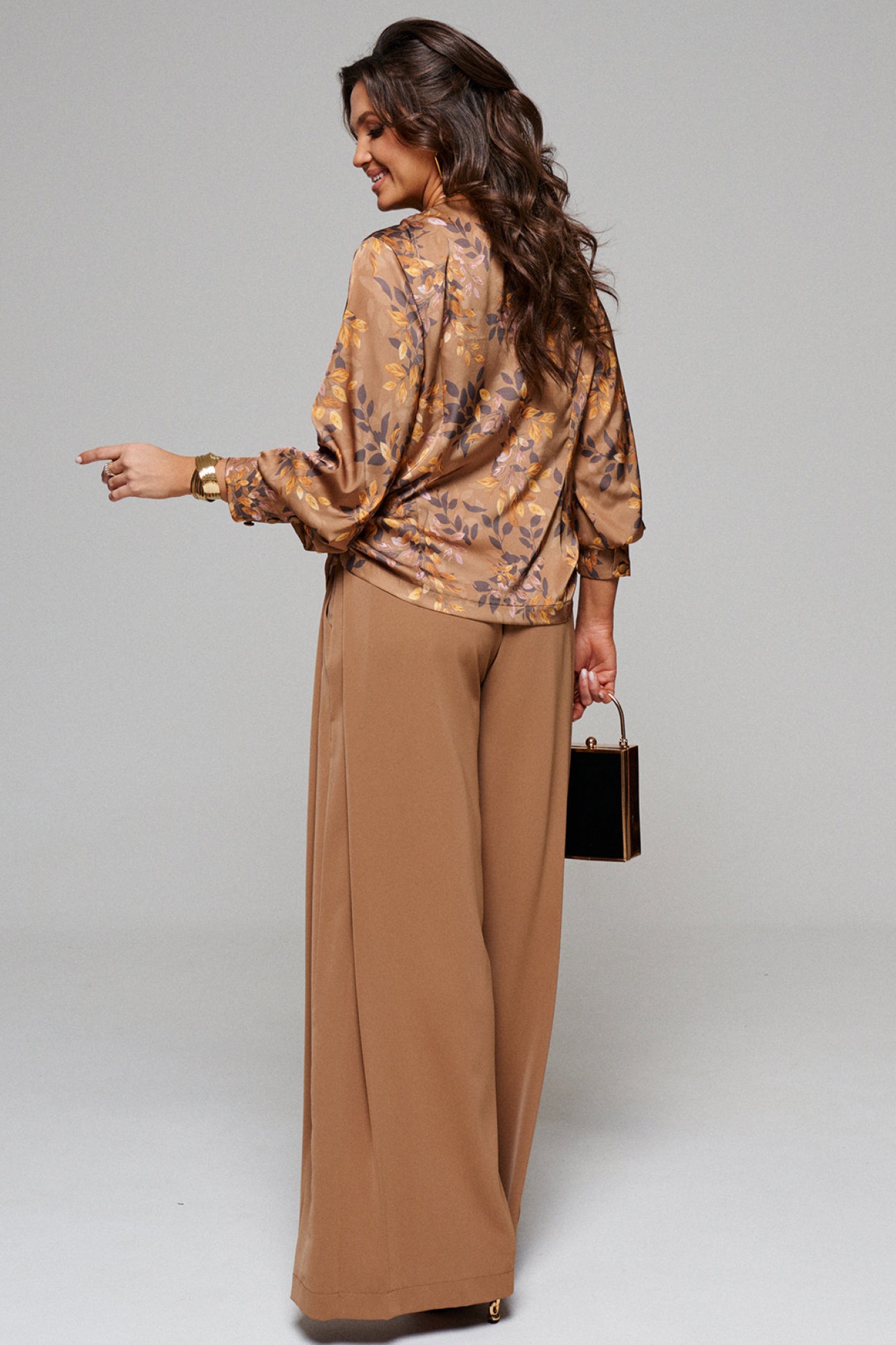 Брюки широкие, типа «палаццо»; свободного, прямого силуэта; с двумя глубокими складками в верхней части бокового шва и двумя внутренними карманами, выгодно скрытыми внутри складки.