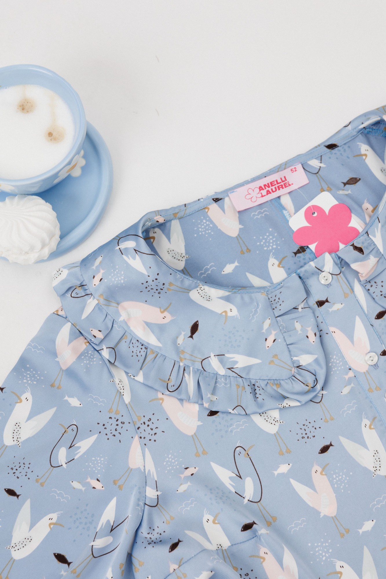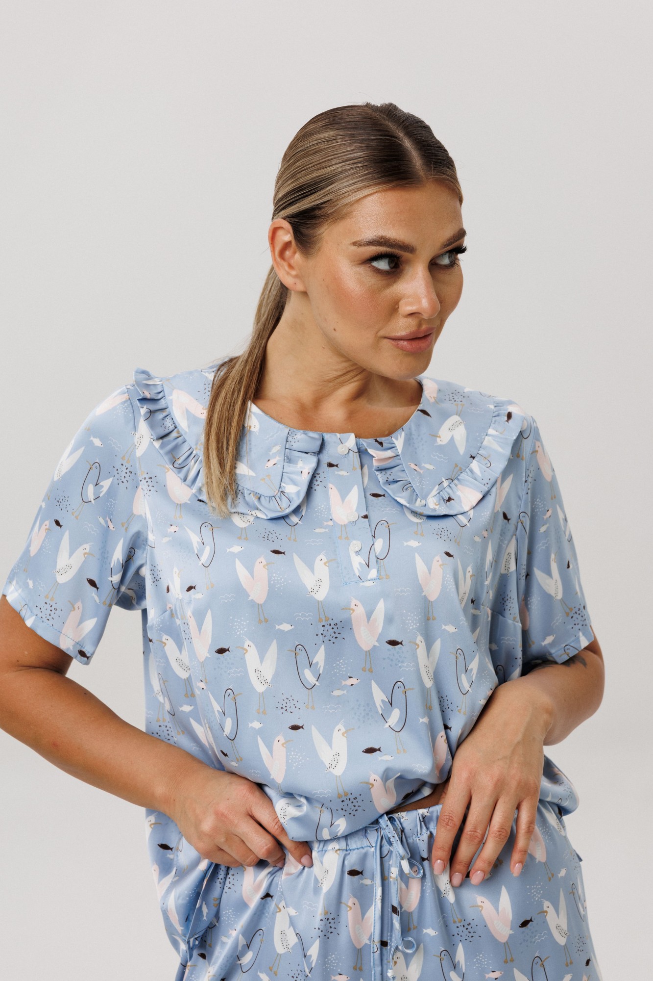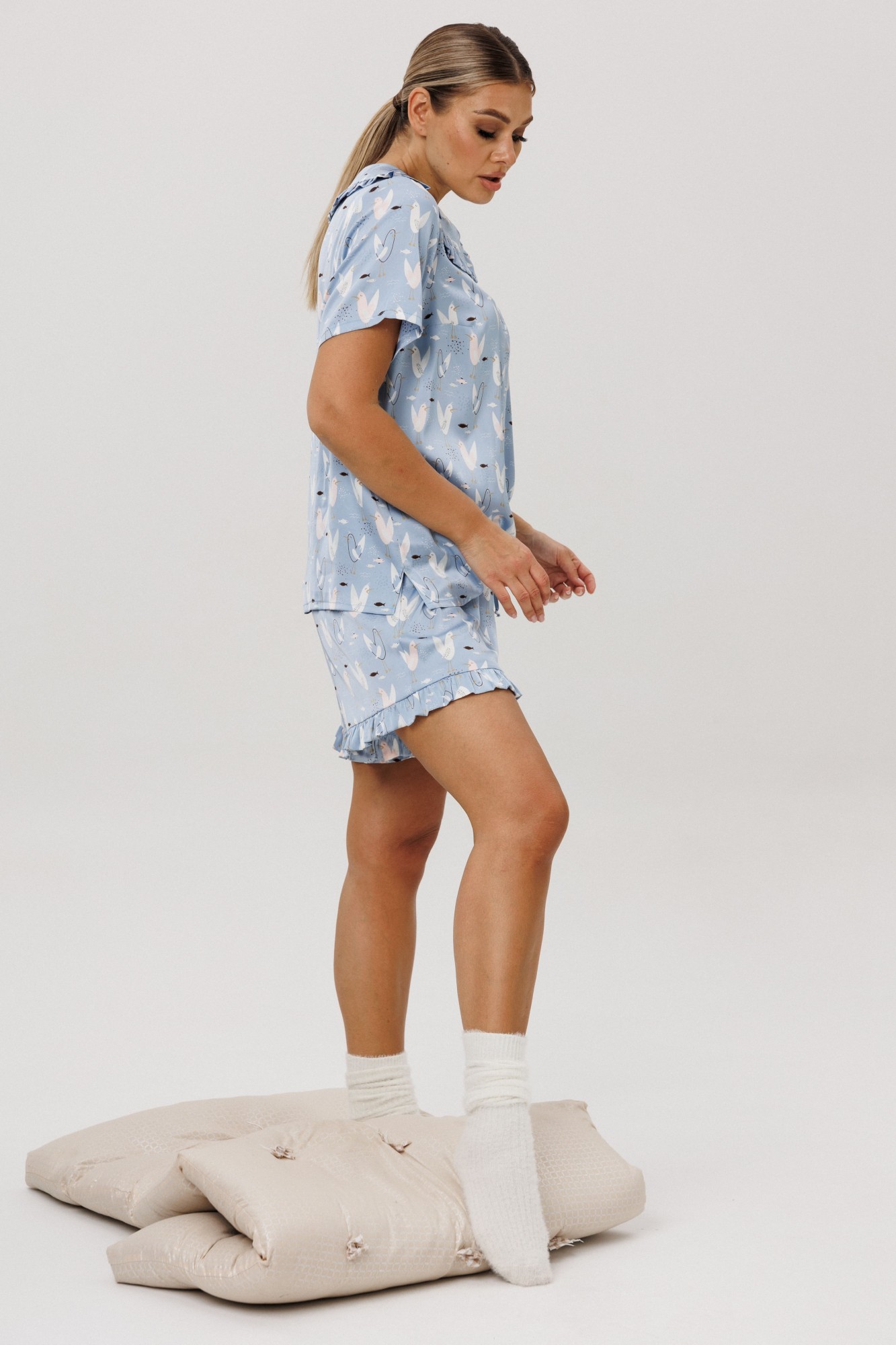 Воротник блузы и отделка шорт рюшами создают атмосферу сказочности и воздушности.