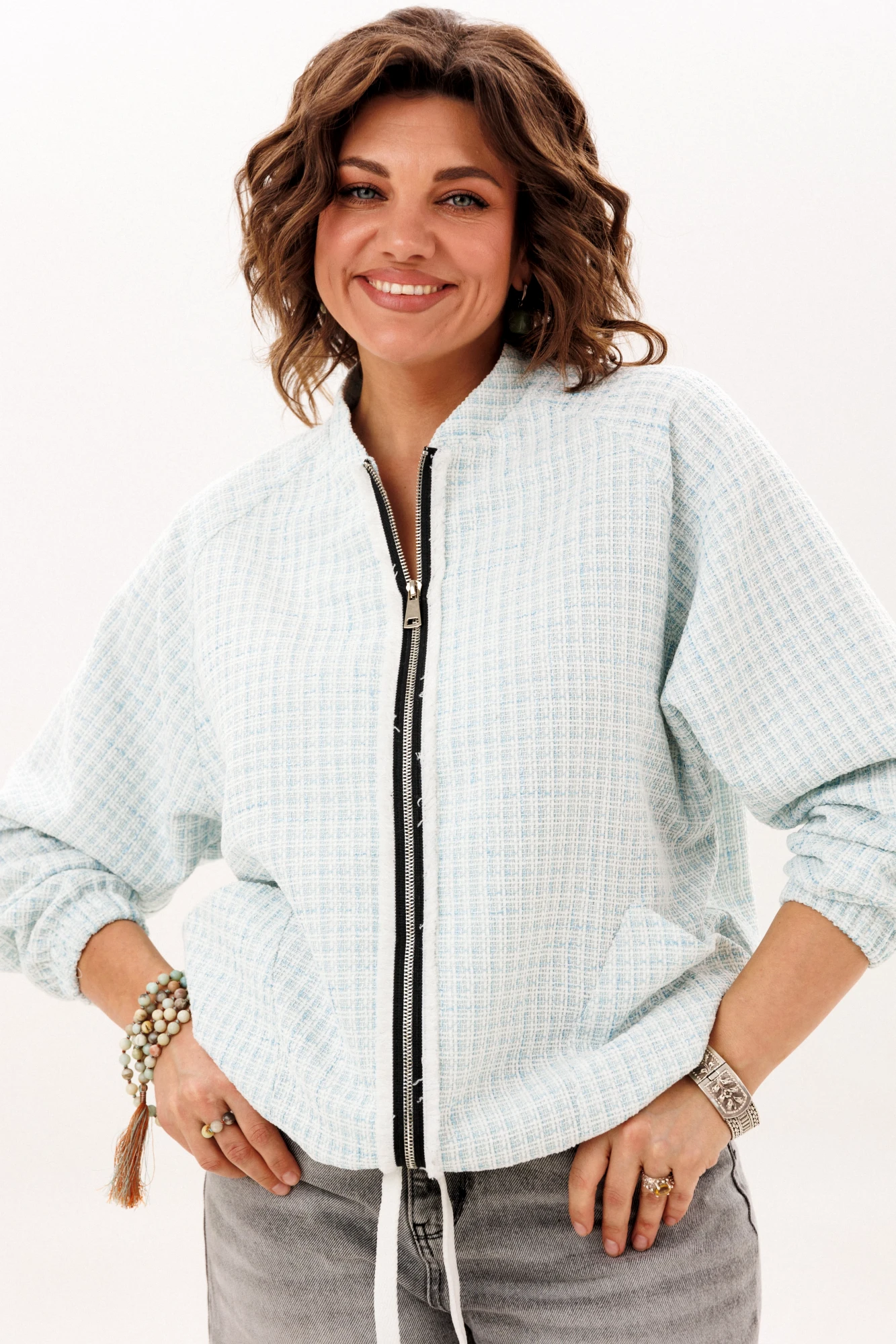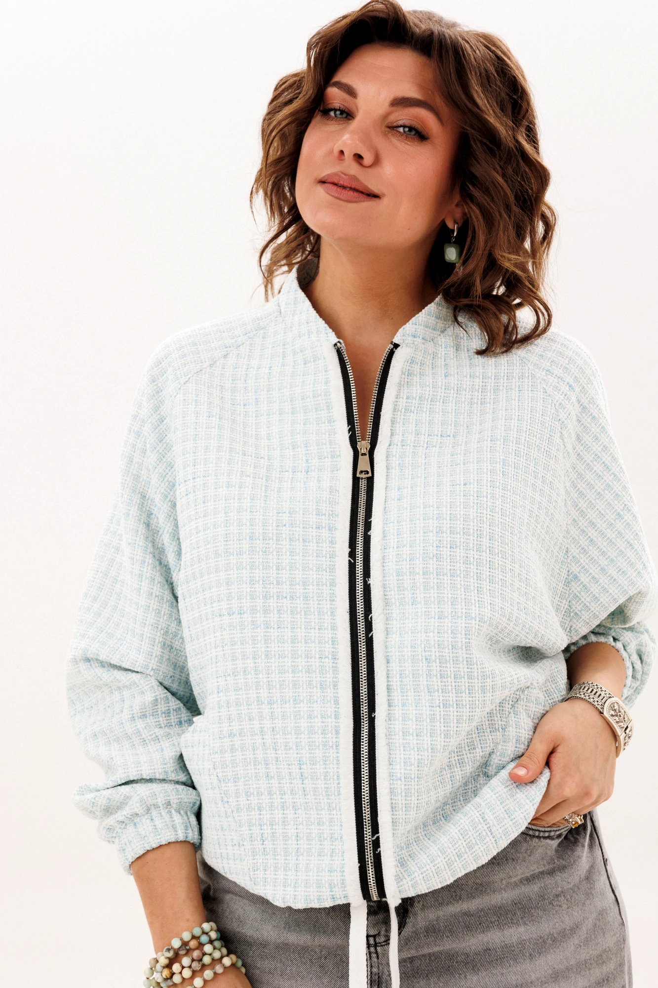 Этот блузон, словно воплощение непринужденной элегантности, предлагает ощущение комфорта, которое становится продолжением тебя. Его прямой силуэт, лишенный строгих границ, мягко следует за очертаниями фигуры, даря свободу каждому движению. Уют обрамляет горловину благодаря воротнику-стойке, создавая ощущение защищенности в прохладный день. Центральным элементом, приковывающим взгляд, служит застёжка-молния, чья фактурная текстура напоминает легкую, пушистую изморозь, придавая практичной детали неожиданно художественный эффект.