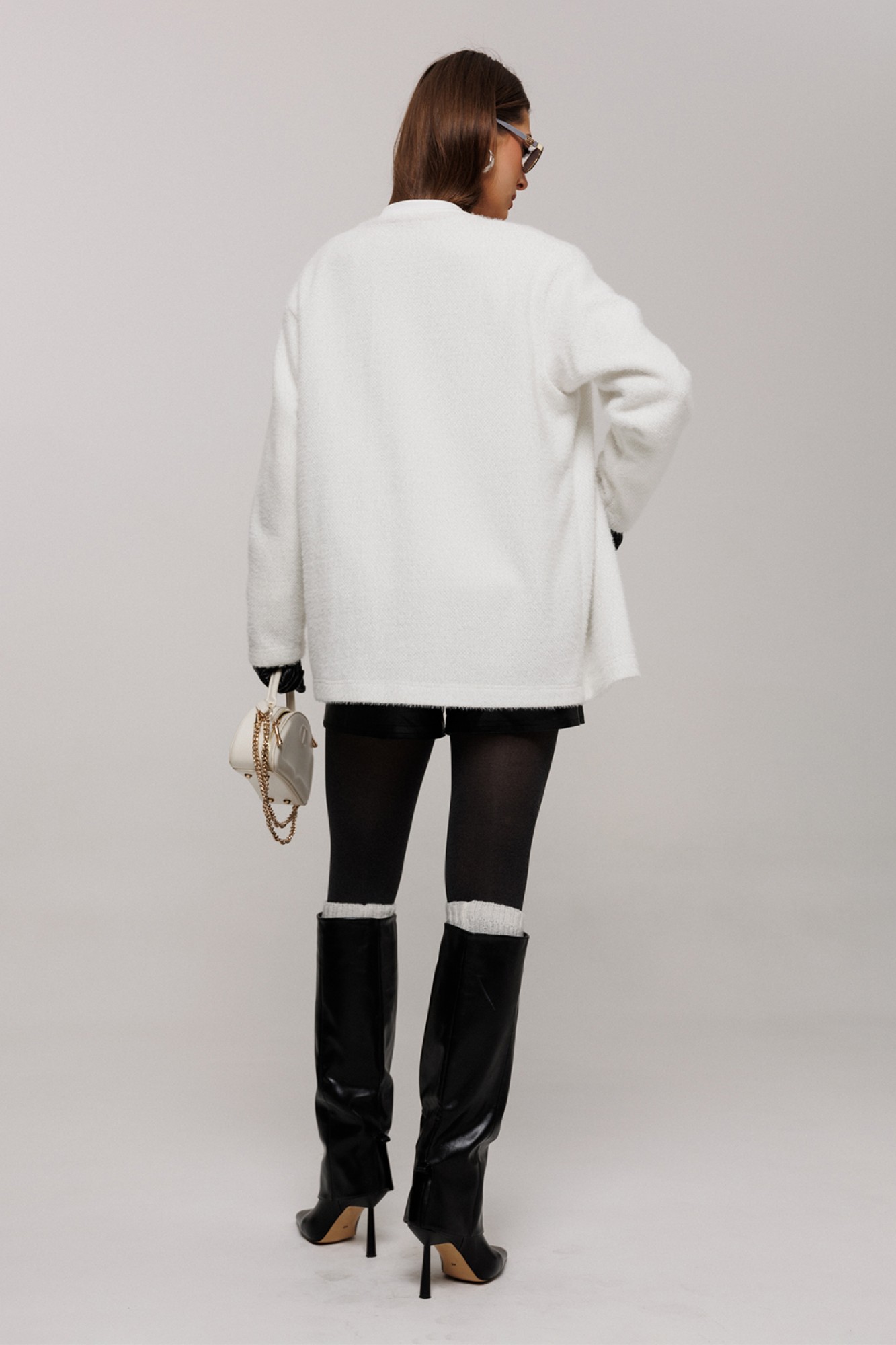 Кардиган из трикотажного полотна свободного силуэта слегка заужен к низу, со спущенной линией плеча и втачным рукавом. Полочка с V-образным вырезом и центральной застежкой на пришивные кнопки. Без подкладки.