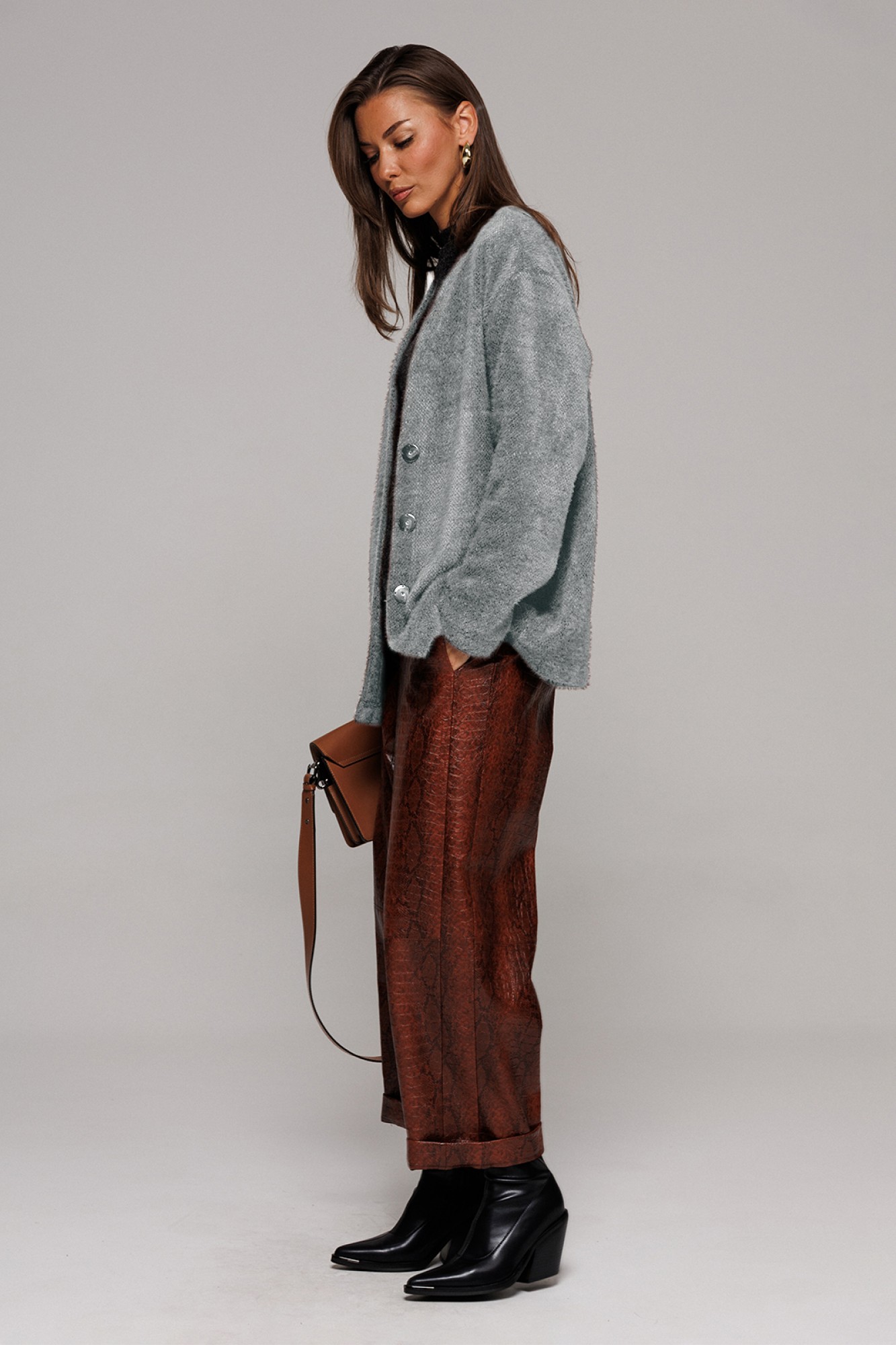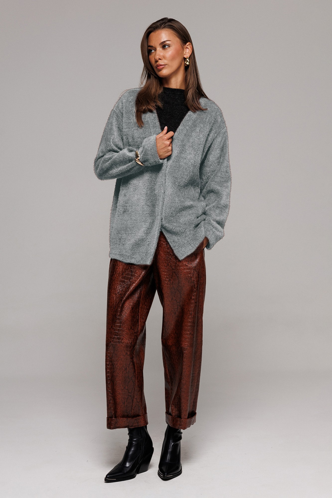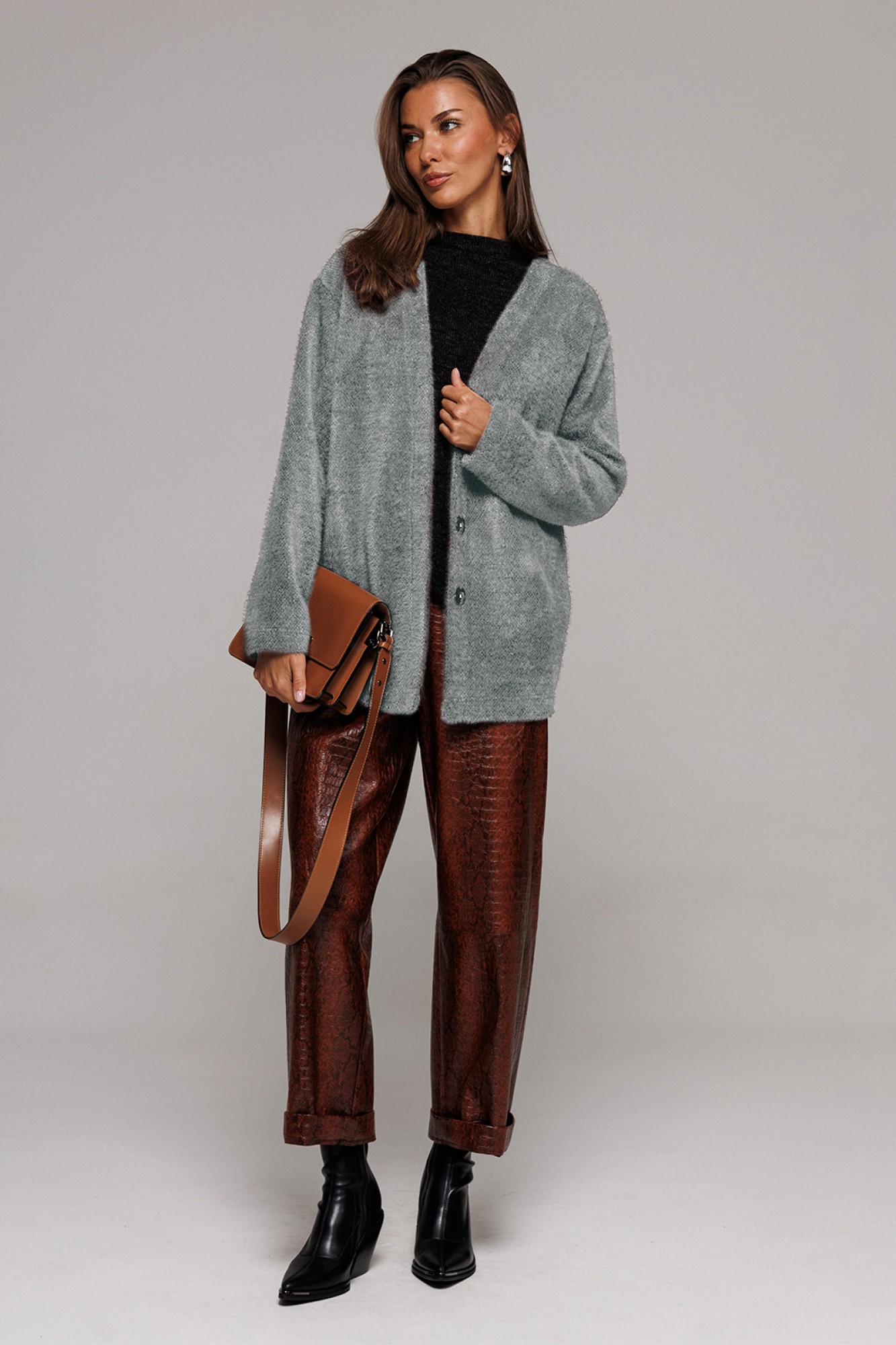 Кардиган из трикотажного полотна, свободного силуэта, слегка заужен к низу, со спущенной линией плеча и втачным рукавом. Полочка с V-образным вырезом и центральной застежкой на пришивные кнопки. Без подкладки.