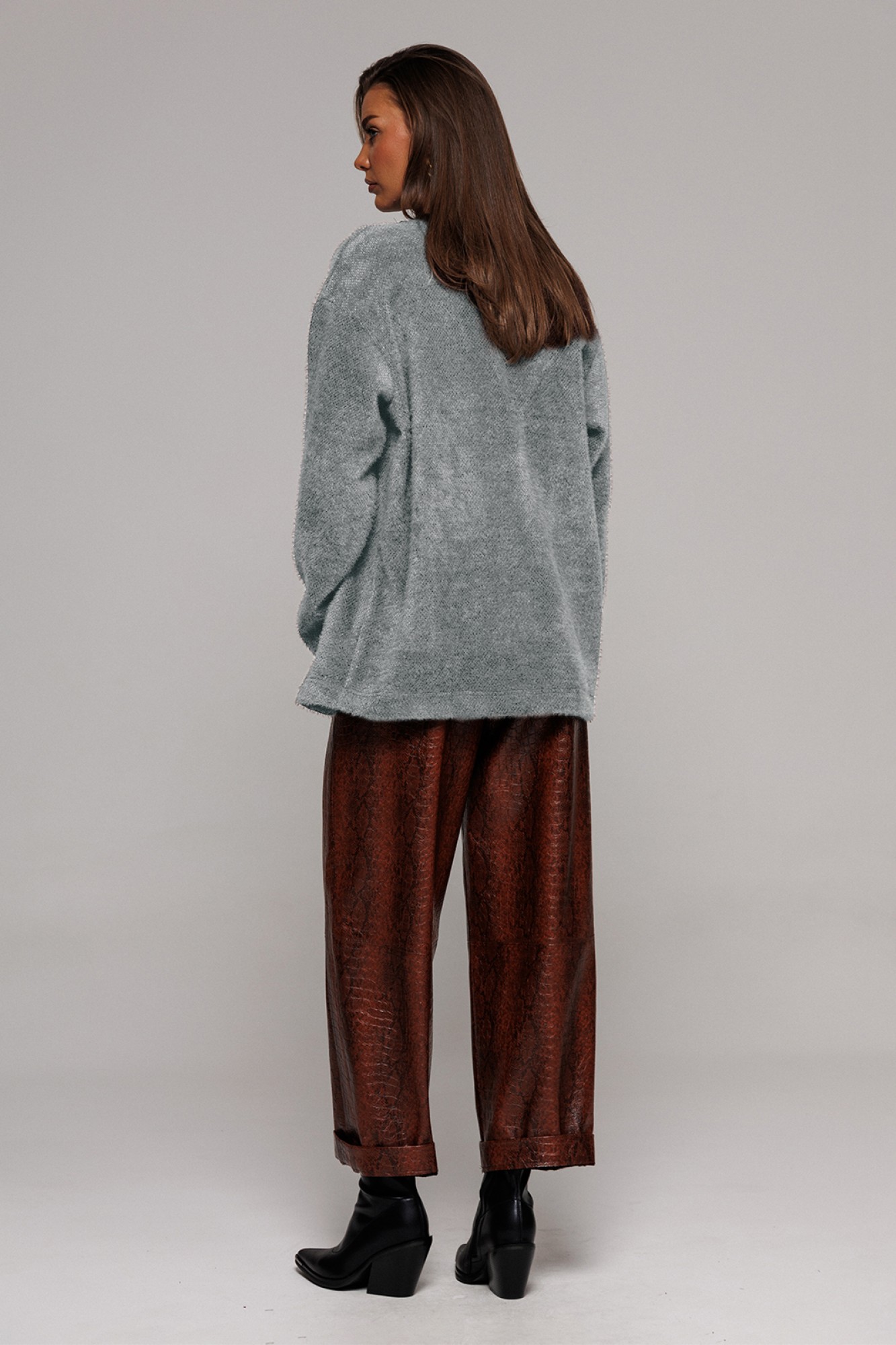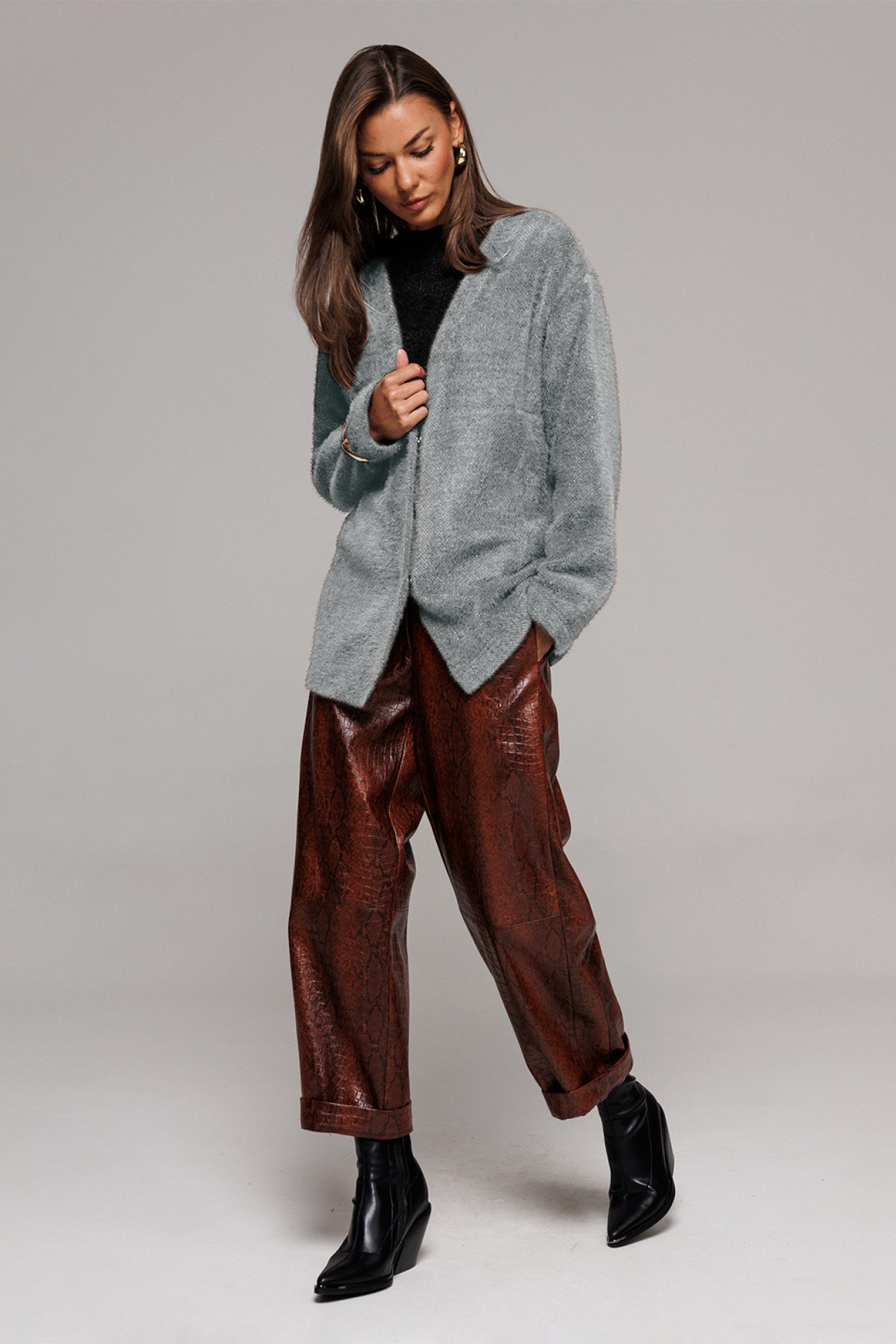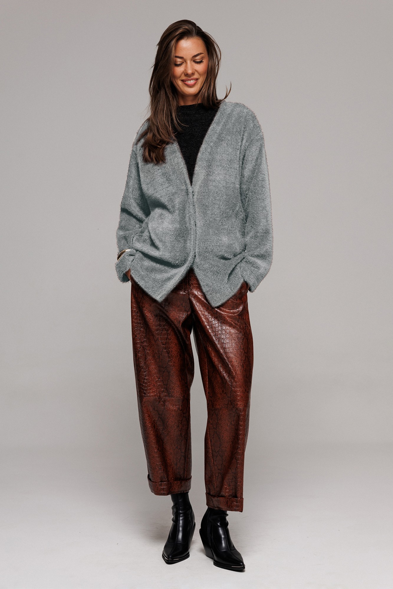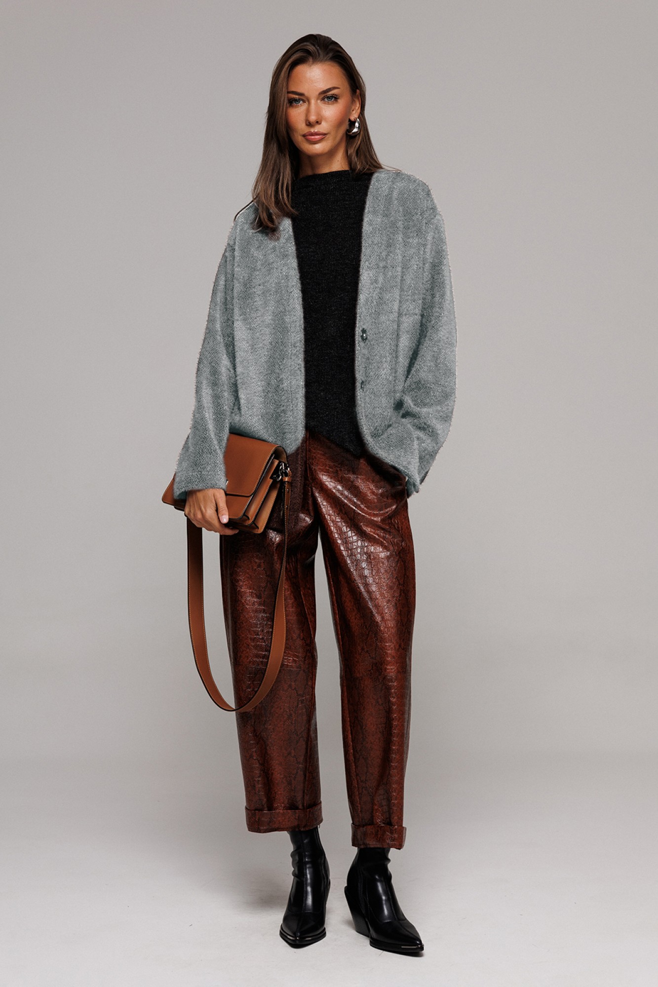 Кардиган из трикотажного полотна, свободного силуэта, слегка заужен к низу, со спущенной линией плеча и втачным рукавом. Полочка с V-образным вырезом и центральной застежкой на пришивные кнопки. Без подкладки.