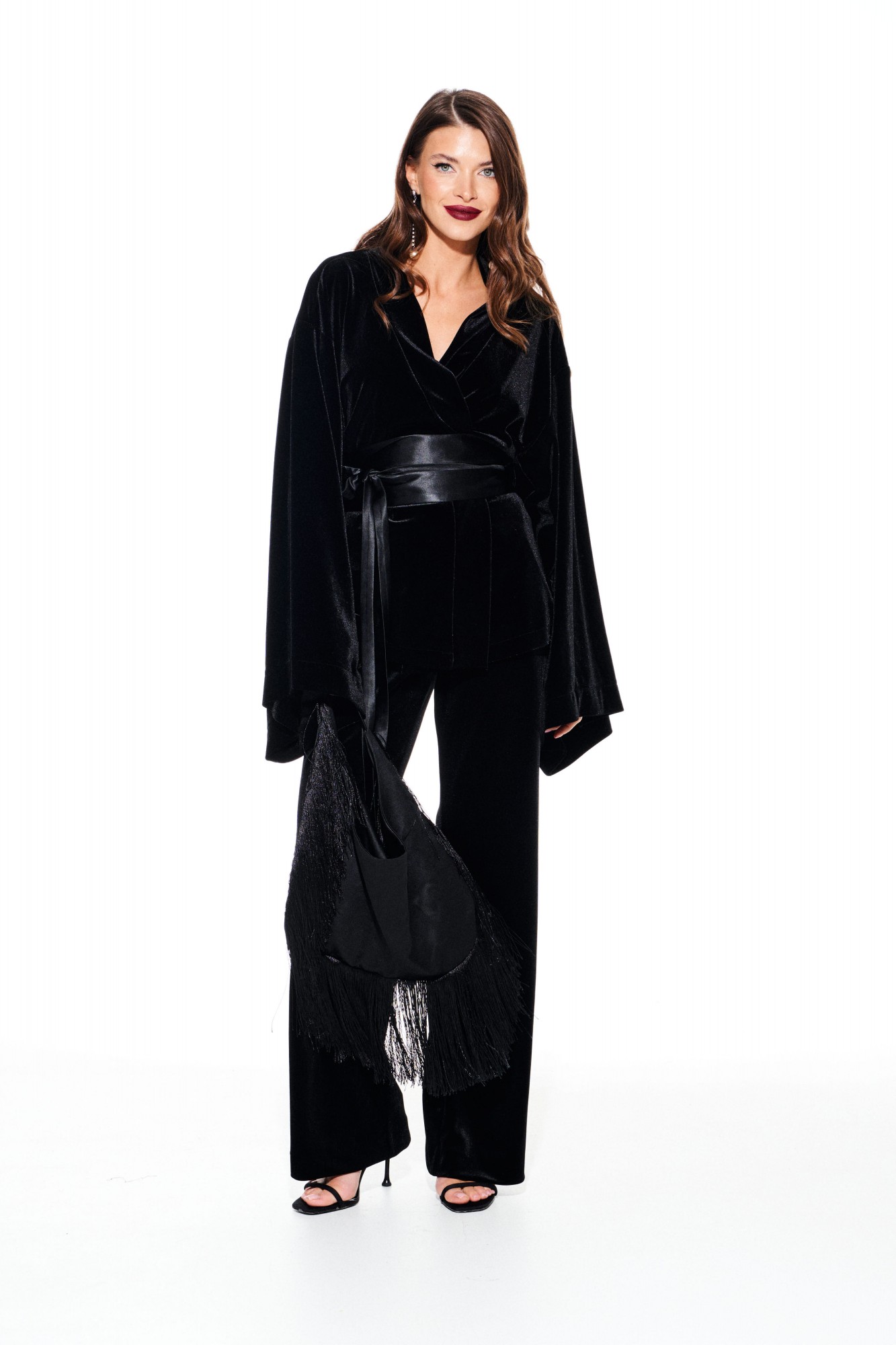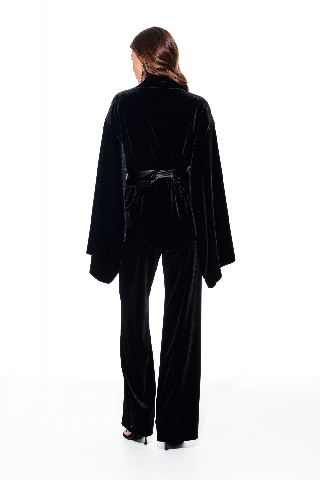 Кардиган из бархата на трикотажной основе, свободного объема, прямого силуэта, на подкладке. Срезы борта и горловины спинки обработаны притачной обтачкой. Линия плеча спущенная. Спинка цельная. Рукав втачной, широкий, в стиле "кимоно". В комплекте пояс из атласной ткани.