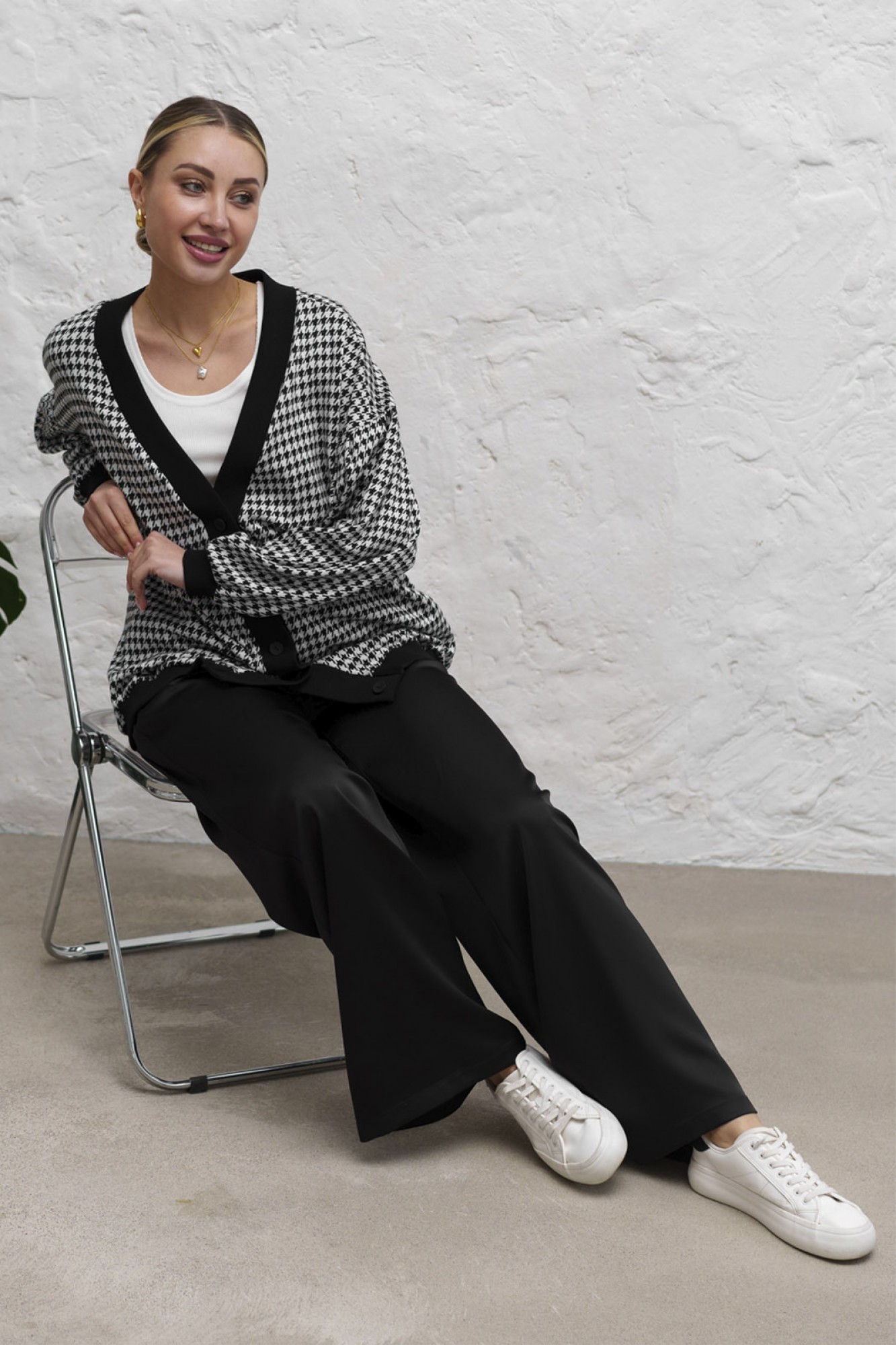Кардиган женский трикотажный свободного прямого кроя в эффектные принты, застегивается на пуговицы, рукава длинные, вырез V-образный. Трикотажный кардиган – это практичная и универсальная вещь, которая незаменима в любое время года. У трикотажных кардиганов немало достоинств: они очень комфортны и удобны, хорошо согревают в прохладную погоду; изделия не подвержены деформации, они не мнутся, хорошо ложатся по фигуре, подчеркивая ее достоинства; практически не выгорают и даже после многочисленных стирок сохраняют стойкость цвета; качественный трикотаж экологически безопасен, не вызывает аллергических реакций, поэтому подходит людям-аллергикам; хорошо поглощают влагу и пропускают воздух, поэтому являются максимально гигиеничными. Модель умеренный оверсайз, к каждому размеру можно добавить на 1-2 размера больше, в зависимости как вы любите: очень свободно или умеренно.
