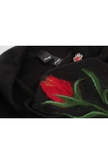 Великолепный жакет свободной формы с воротником «апаш» и рукавами в полную длину из трикотажного полотна. Декор левой полочки – замечательный пример «handmade»: цветок тюльпана из натуральной шерсти вручную наносится и закрепляется на изделии специальными иглами, образую оригинальное дополнение к прекрасному изделию. На левом лацкане брошь из металлофурнитуры. В качестве застежки служат шнуры с наконечниками.