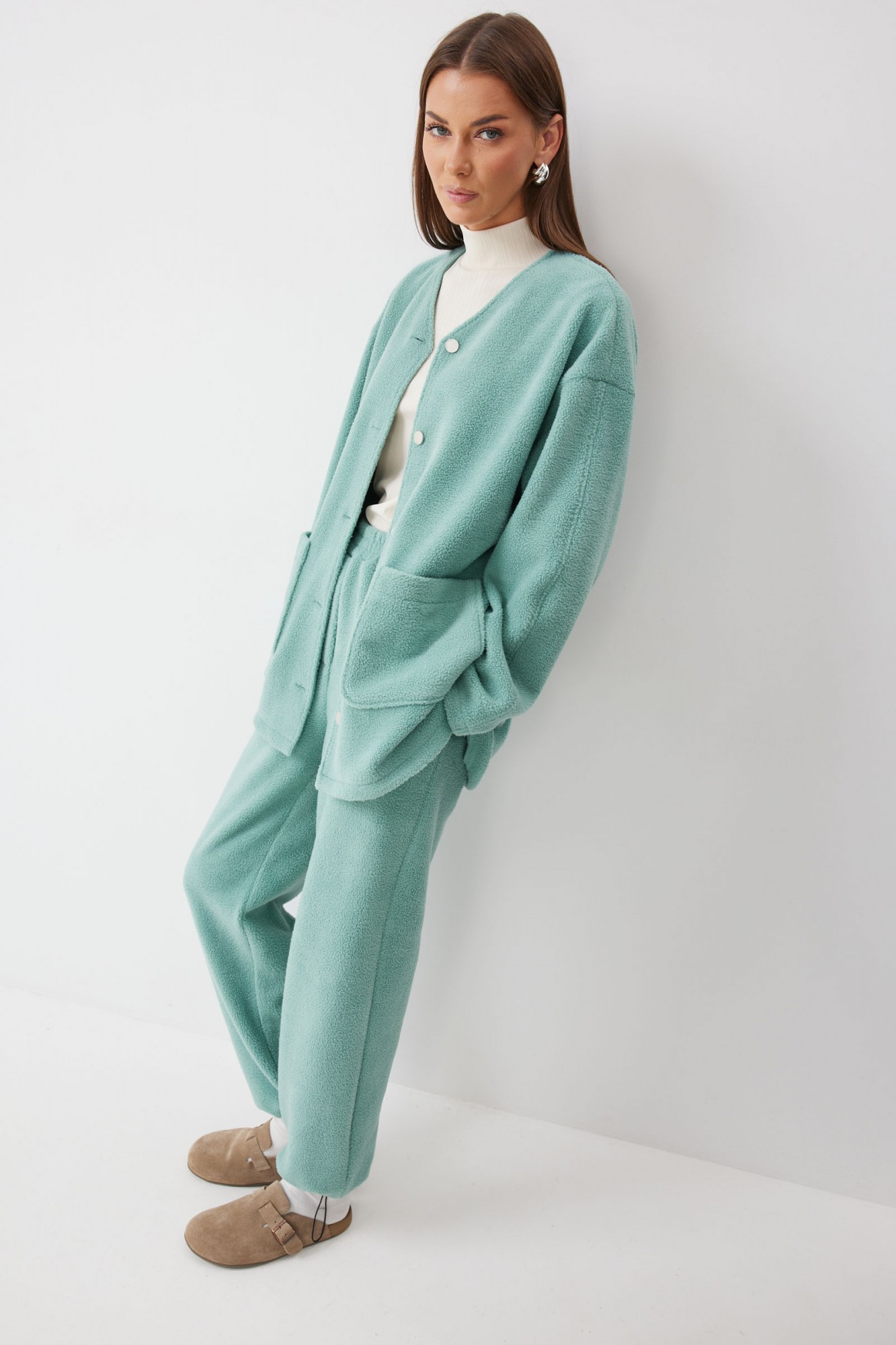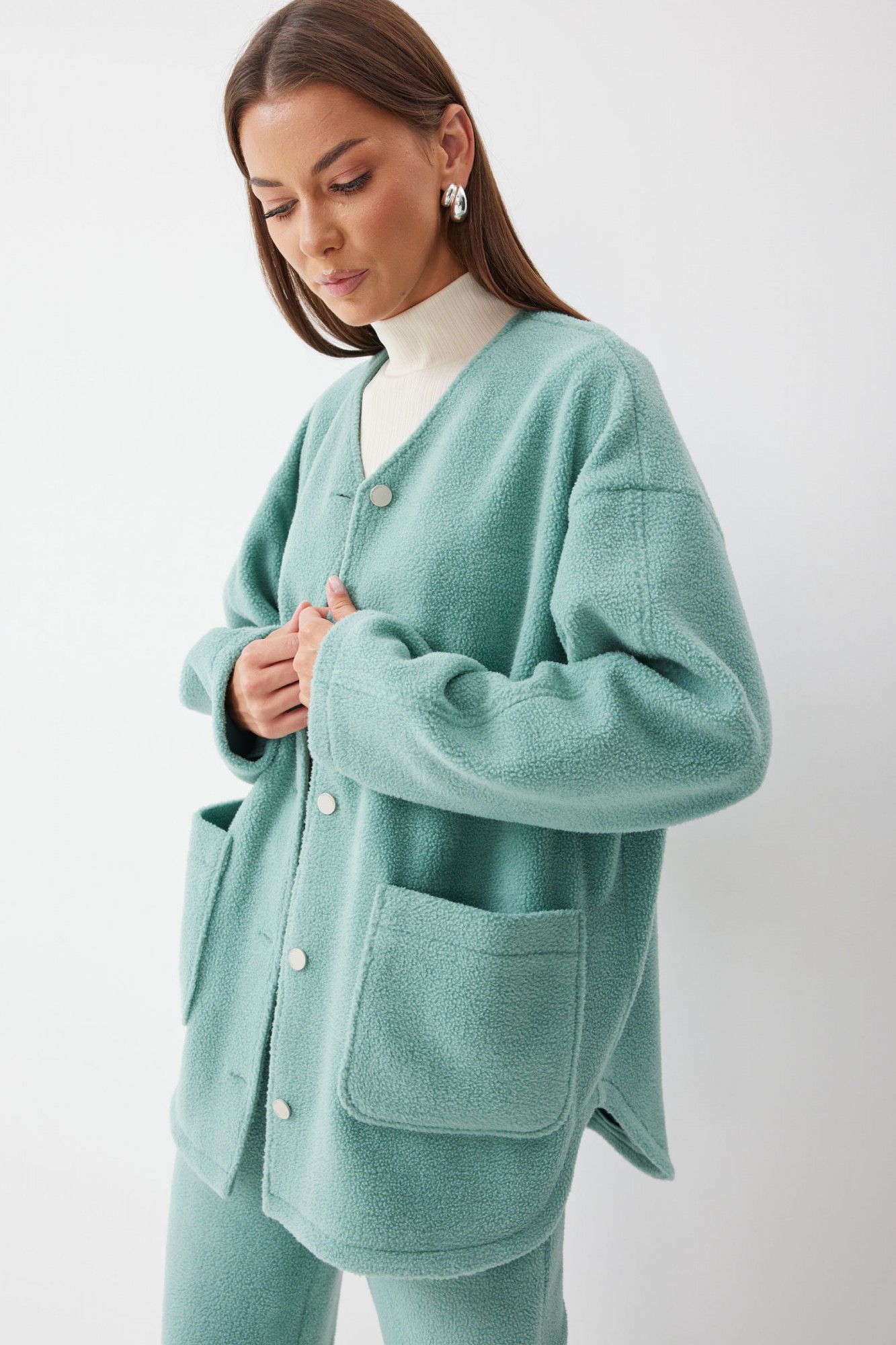 Жакет прямого силуэта с фигурным низом из трикотажного полотна. Горловина округлая, по центру застежка на кнопки. Рукав со спущенной линией плеча. По переду накладные карманы. Жакет без подкладки. Обращаем ваше внимание, что фурнитура может отличаться от фото.
