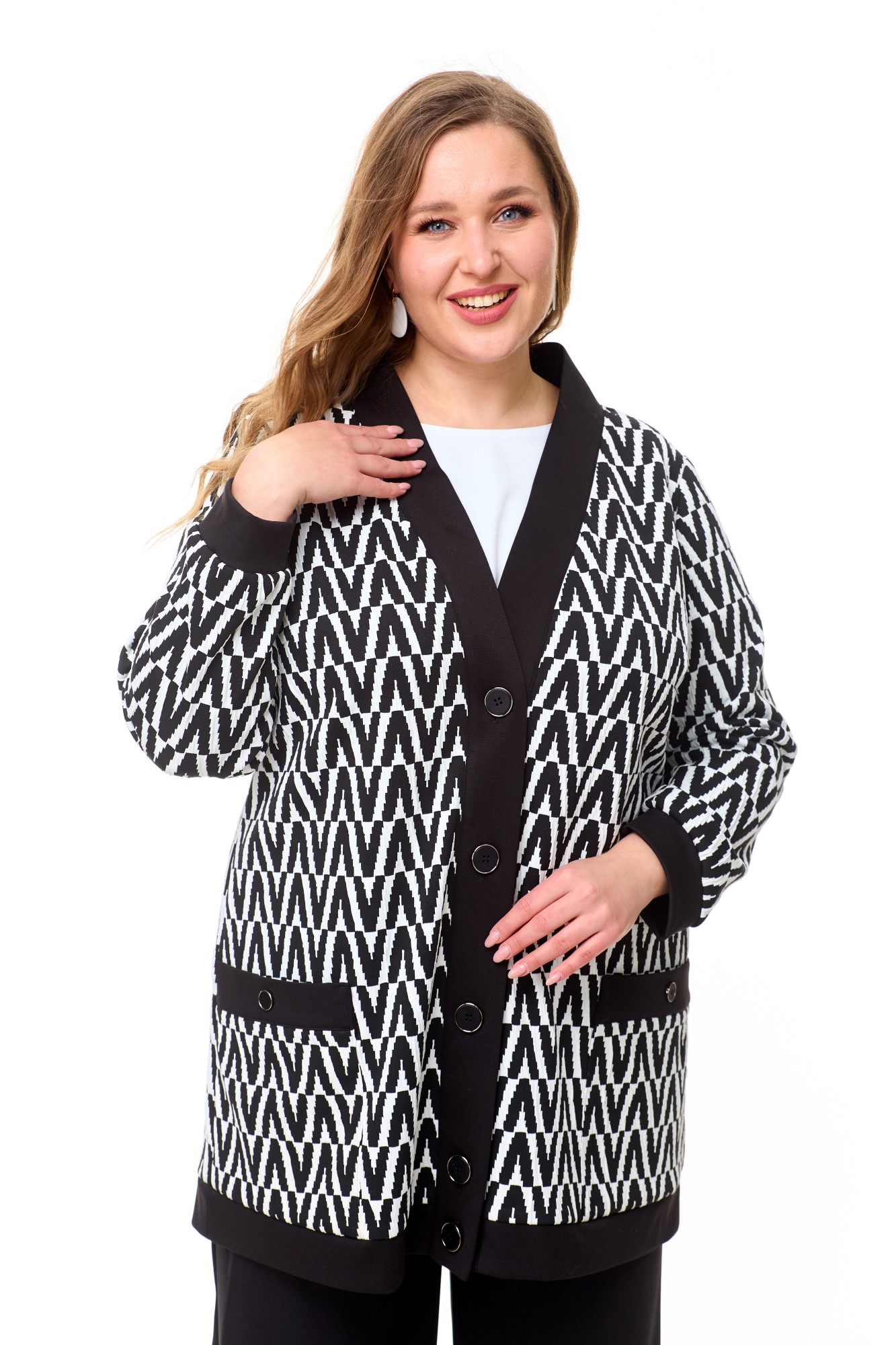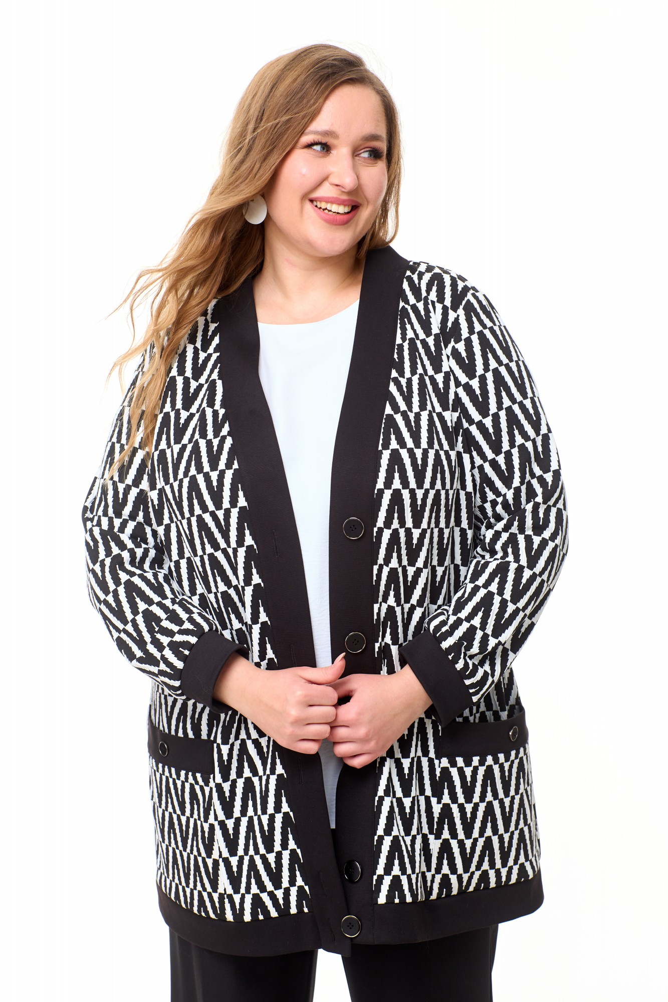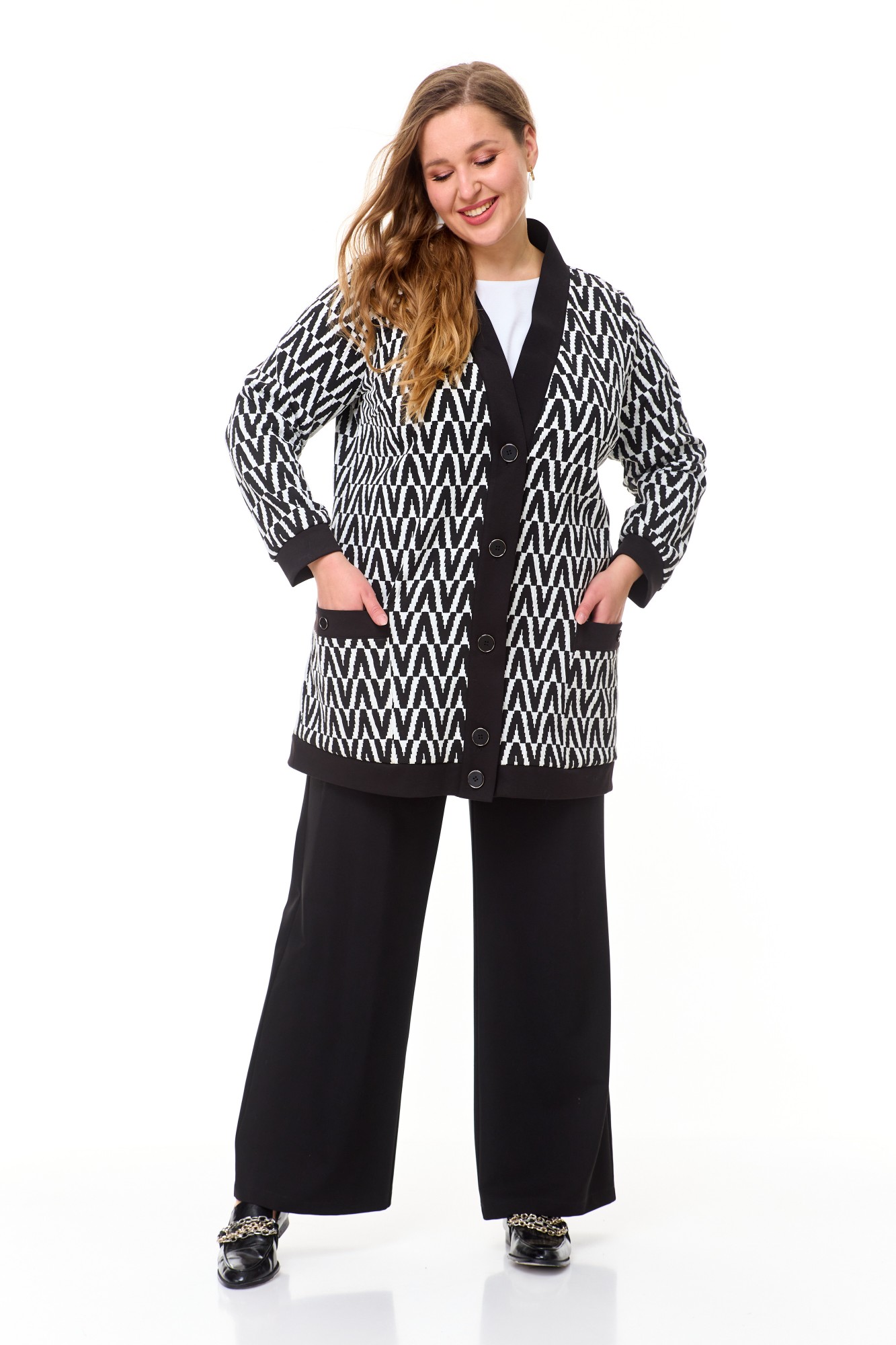 Кардиган свободного покроя, на пуговицах, с вырезом V-образной формы. Кардиган без подкладки и плечевых накладок. Рукав втачной на манжете из контрастной ткани, горловина с планкой тоже из контрастной ткани. На полочках накладные карманы Кардиган выполнен из трикотажной, приятной к телу ткани. Его можно носить на топ, блузку ли водолазку. Стильный женский кардиган станет незаменимой вещью в Вашем гардеробе