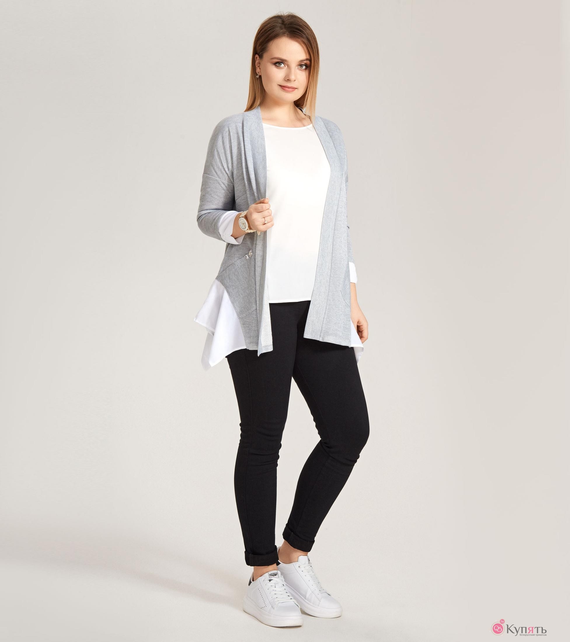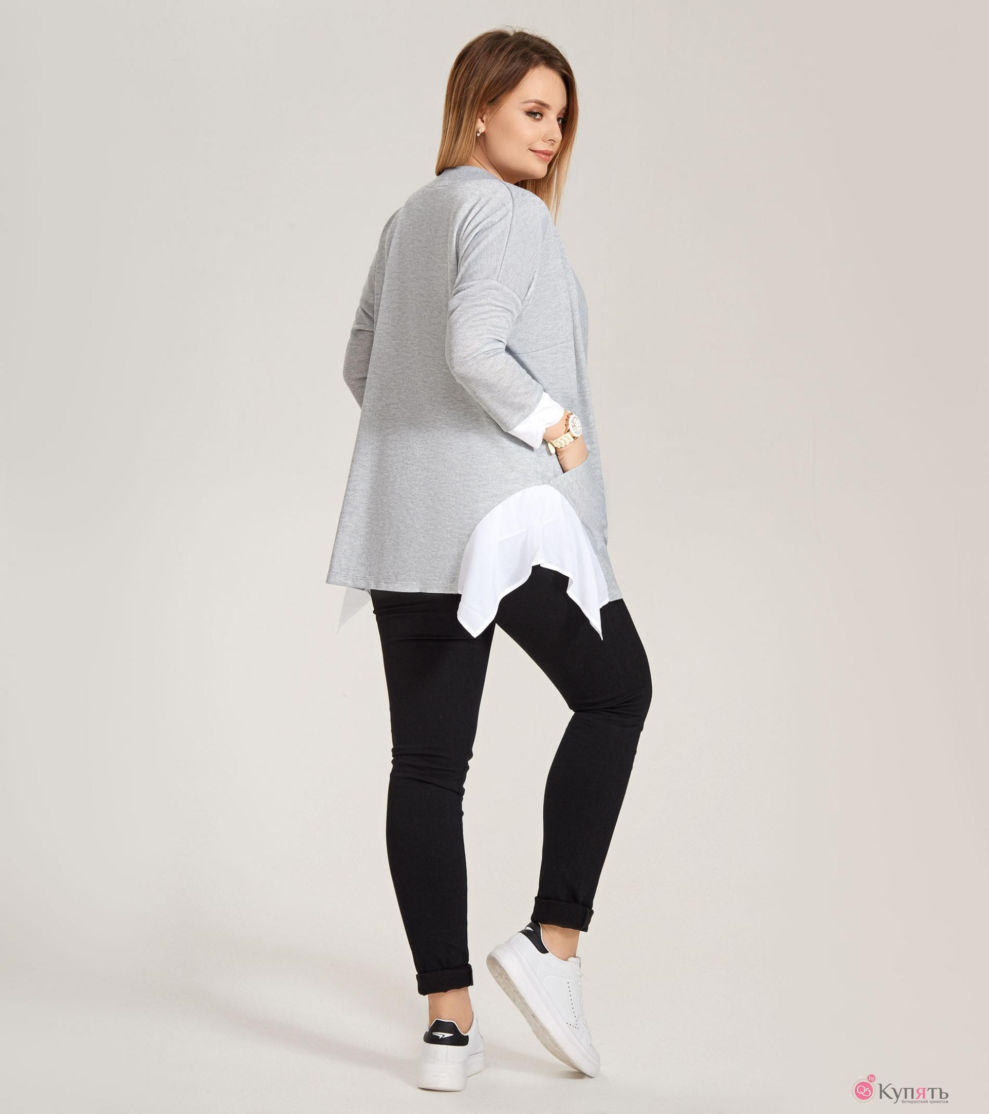 Чудесный трикотажный кардиган на каждый день выполнен из мягкого трикотажного полотна и наверняка будет радовать его одладательницу каждый день. Пластичный трикотаж дарит ощущение комфорта и свободы действий,хлопковый изнутри кардиган приятен на ощупь и при этом имеет лёгкий мерцающий блеск, благодаря тончайшей нити люрекса,присутствующей в переплетении на лицевой стороне полотна. Кардиган удачно сочетает в себе две ткани .Белый шифон образует ниспадающие мягкие фалды по бокам изделия,что невероятно стройнит фигуру.Также подчеркнуть остроту образа и освежить его помогают присборенные шифоновые манжены на рукавах.Линия плеча кардигана приспущена.Шалевый воротник мягко облегает шею сзади и драпируется спереди.Также по переду выполнены карманы фигурной формы,декорированые изящными стеклостразами.Кардиган чудесно будет смотреться с тонким белым джемпером,блузкой без рукавов или майкой с принтом.Идеалиный вариант одежды на каждый день для стильной деловой женщины.