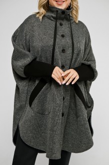 Женское пончо, выполненное из плотного трикотажа с лицевой поверхностью «букле». Застежка центральная бортовая на петли и пуговицы. Воротник – высокая стойка, по линии отлета которого есть кулиса. В кулису продета лента, концы которой выходят через крупные люверсы. Пончо округлой формы по низу и открытое с низу. Есть высокие облегающие манжеты, выполненные из плотного гладкого трикотажа. По переду также есть накладные карманы округлой формы с листочками, которые также выполнены из однотонного трикотажа. Линия входа в карман наклонная. Длина изделия по спинке от шва втачивания воротника в горловину 102 см. Длина рукава 62 см.