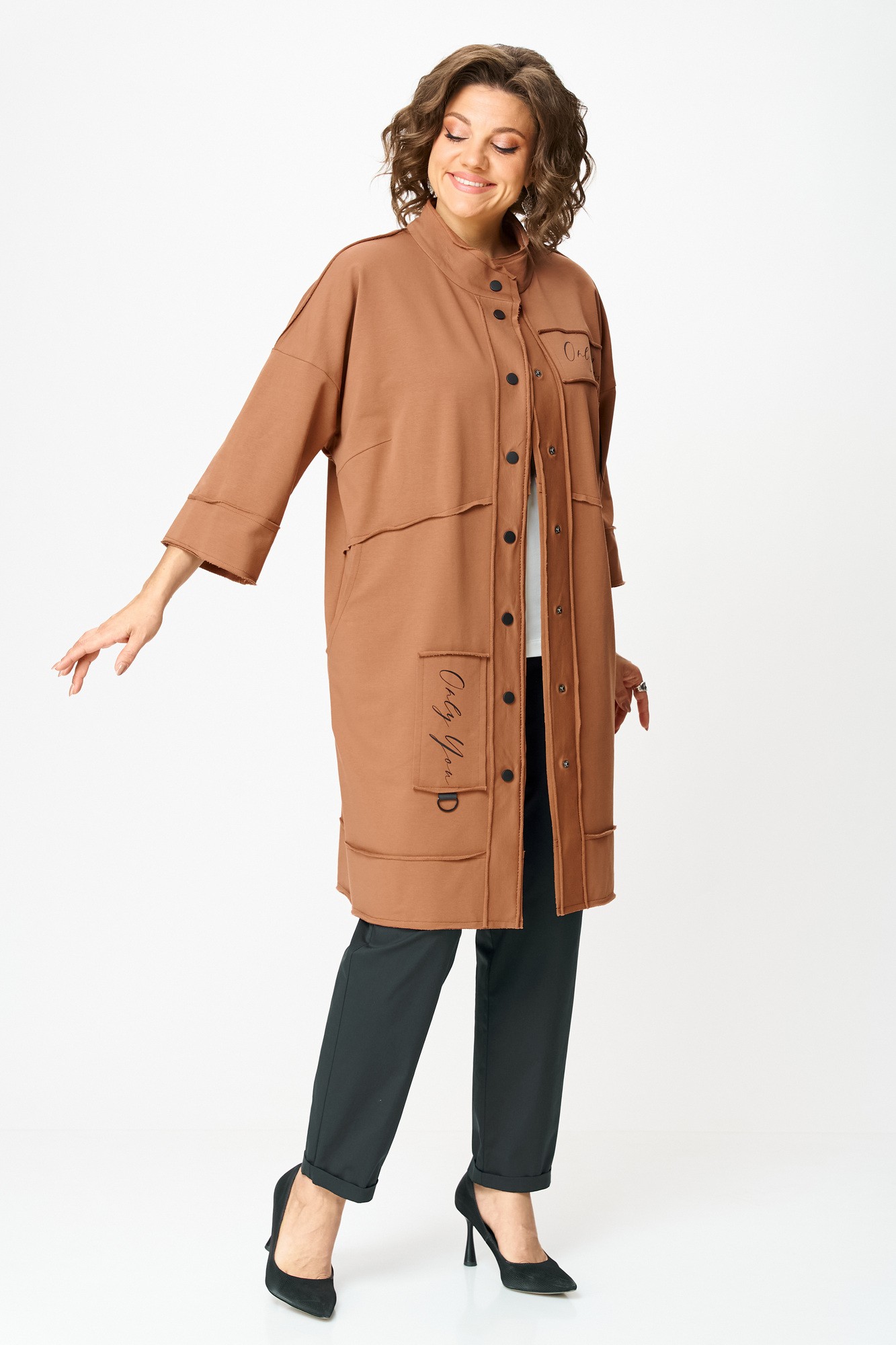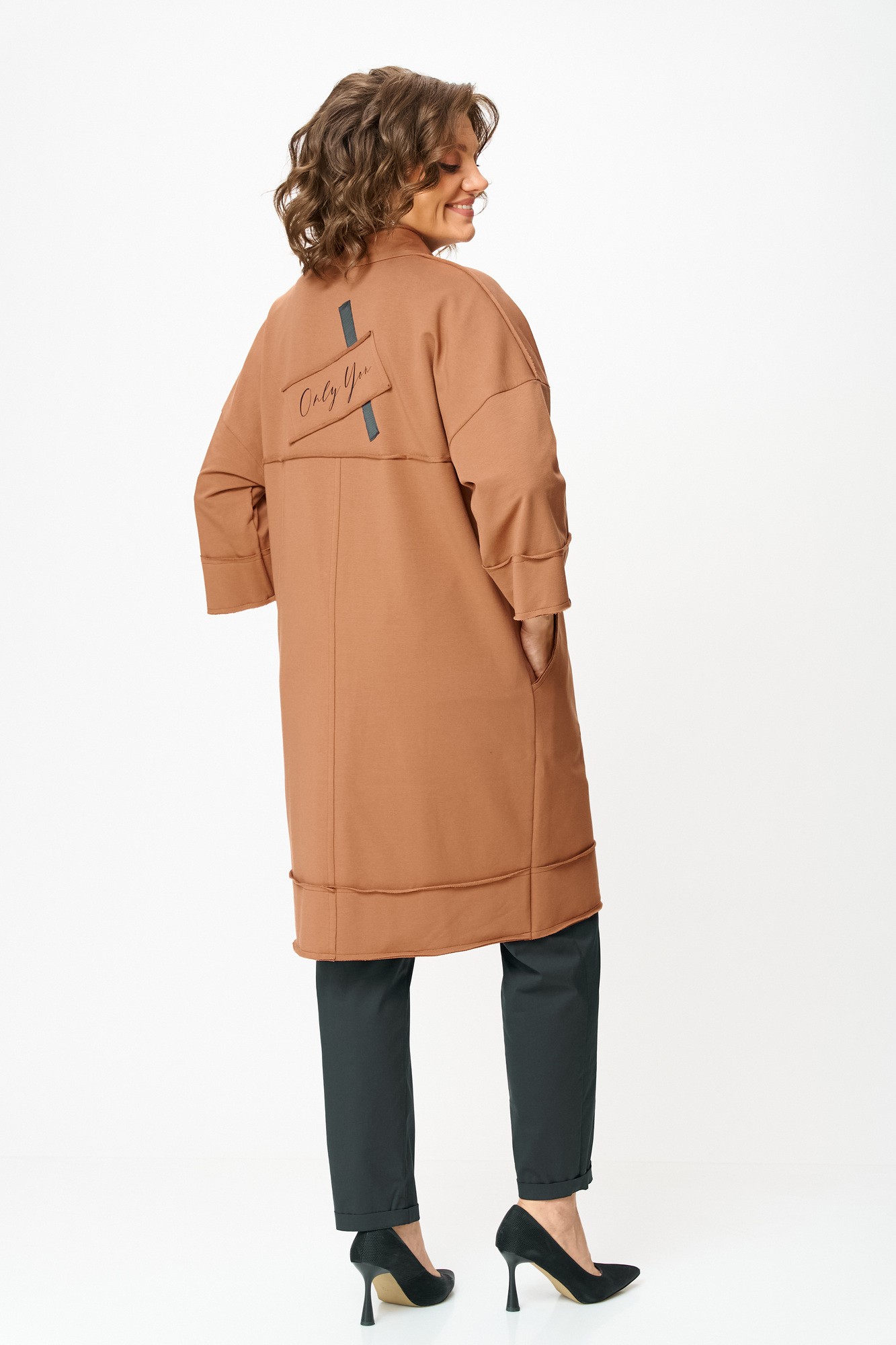 Кардиган женский прямого силуэта из трикотажной ткани (двунитка-футер). На полочке и спинке расположены декоративные, необработанные швы. В верхней и нижней части переда есть настрочные элементы с печатью и тесьмой. По переду изделия карманы. Спинка со средним швом и кокеткой. На кокетке расположен элемент с печатью и тесьмой. Рукав спущенный с манжетой. Вырез горловины оформлен стойкой. По переду изделия планка с кнопками.