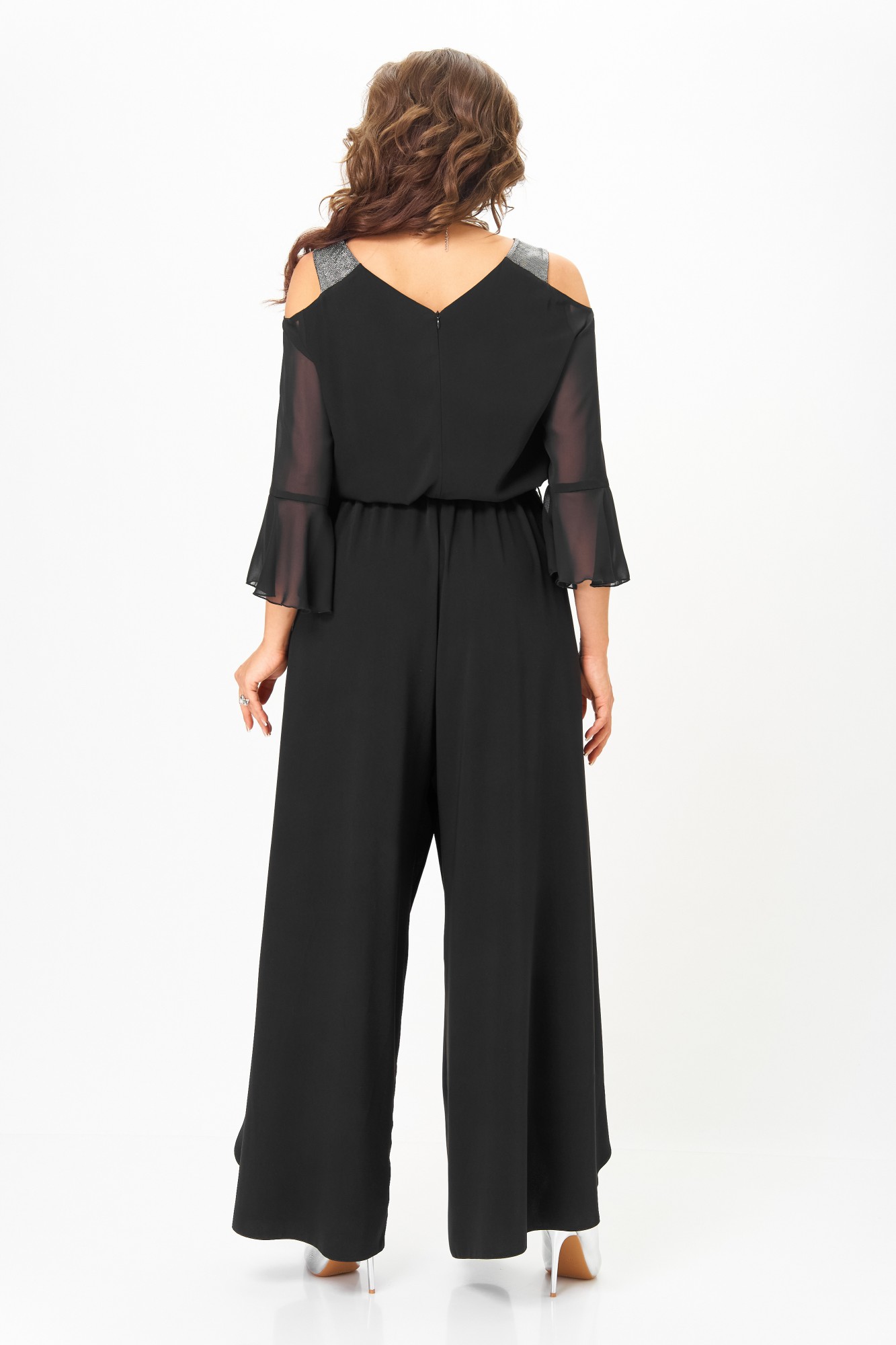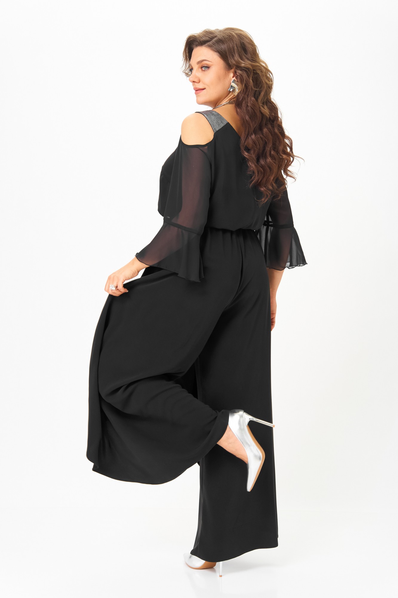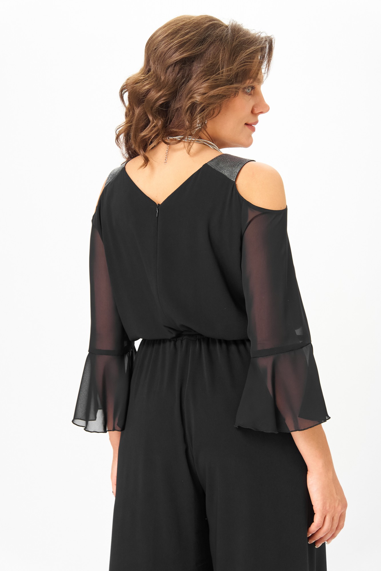 Комбинезон выполнен из однотонной ткани плательно-костюмной группы, в качестве отделки использован однотонный шифон и материал с люрексом. Комбинезон отрезной по линии талии. Полочка лифа с нагрудными вытачками, спинка с потайной молнией в среднем шве. Горловина V-образной формы, обработана притачной планкой из материала с люрексом. Рукав с открытым плечом, выполнен из шифона. Длина рукава ¾, по низу рукава обработан притачной волан. Нижняя часть комбинезона выполнена с запахом. По линии талии комбинезон на резинке. По боковым швам настрочены шлевки, через которые продет пояс, завязывающийся спереди.