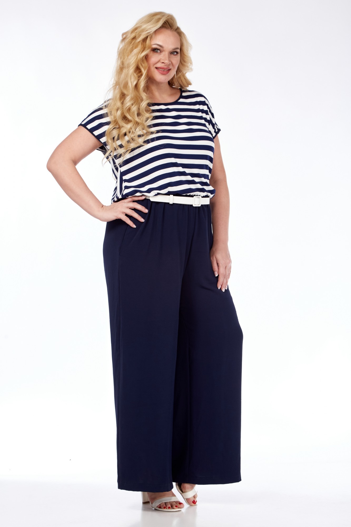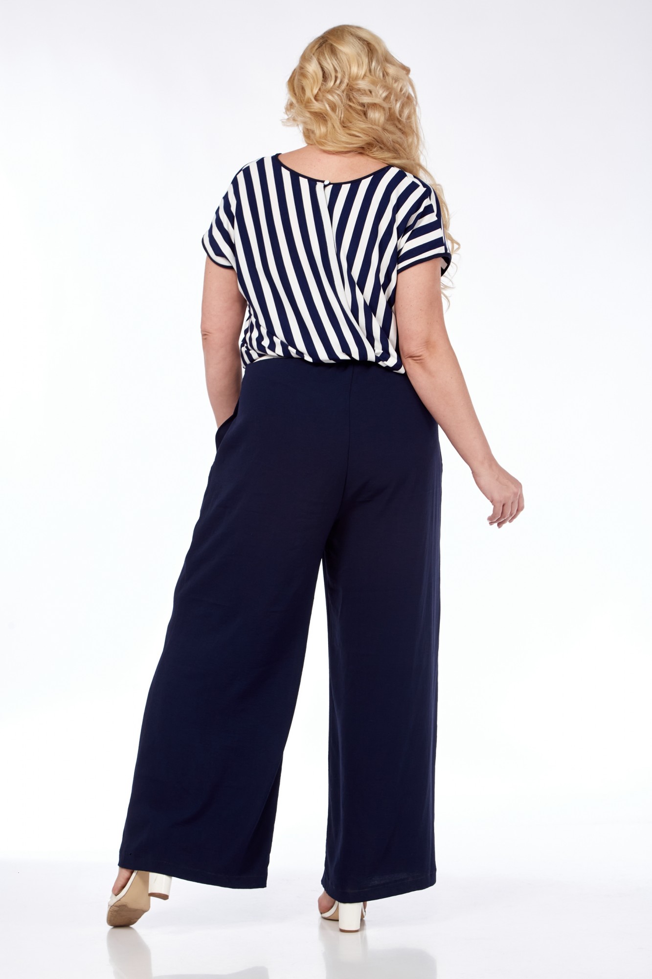Комбинезон женский ( выполнен из двух видов ткани) свободного кроя с застежкой на 1 навесную петлю и пуговицу на горловине спинки. Лиф из трикотажа в полоску с запахом на спинке. Горловина округлой формы. Нижняя часть комбинезона с притачным поясом и резинкой. В боковых швах обработаны карманы.