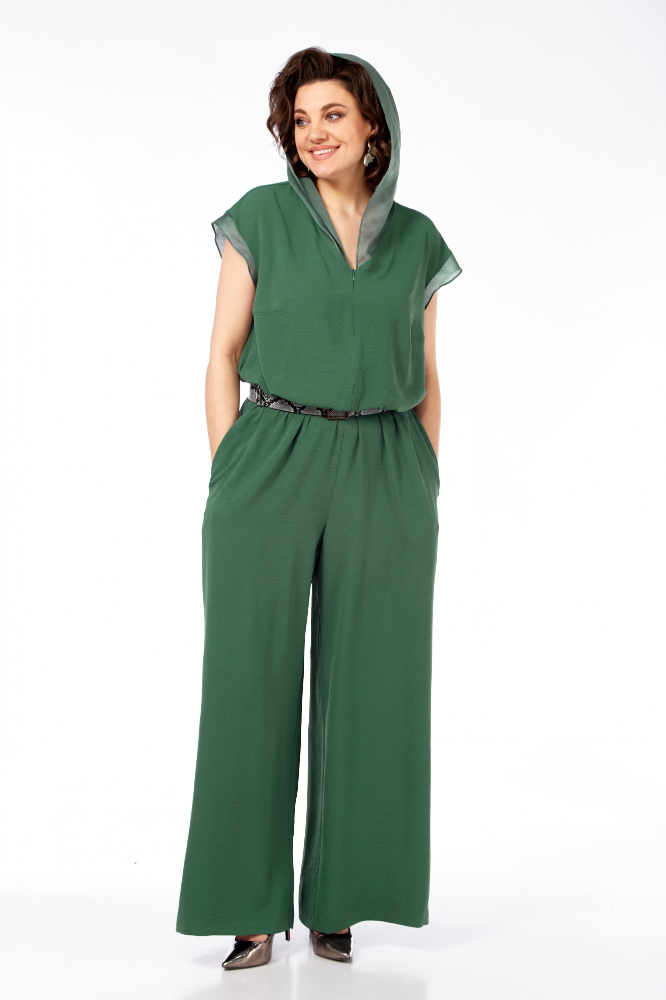 Комбинезон женский свободного кроя с застежкой на потайную молнию спереди и петлю и пуговицу сзади. Перед с нагрудными вытачками. По линии талии собран на резинку. Боковые карманы обработаны в швах. Рукав-крылышко из отделочной ткани со спущенным швом и "капелькой" для удобства при надевании и снятии.