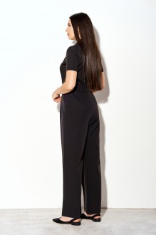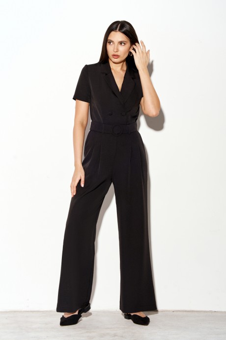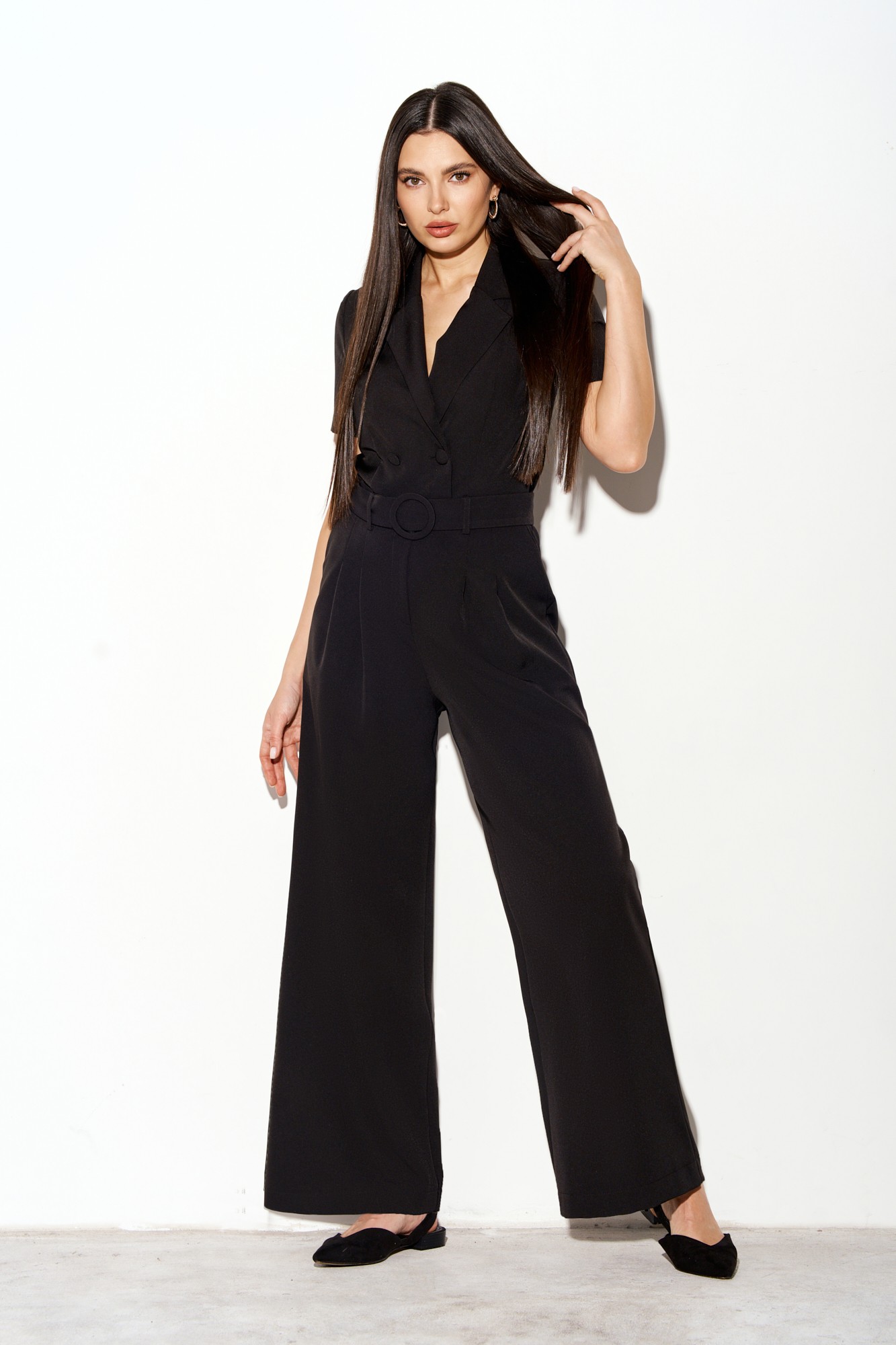Комбинезон женский полуприлегающего силуэта со втачными рукавами, пиджачным воротником и мягкими складками по переду застегивается на молнию, петли и пуговицы; в боковых швах карманы.