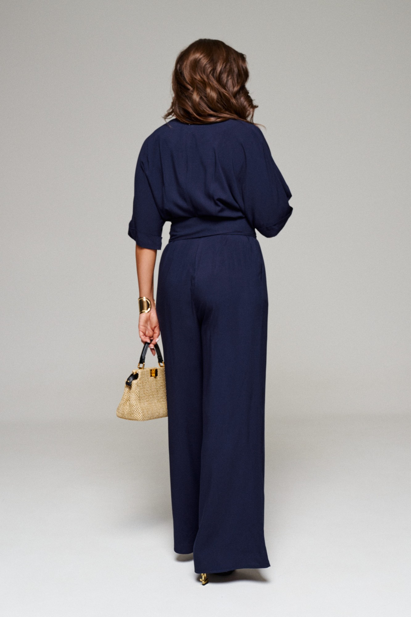 Задняя часть комбинезона разрезная по среднему шву, с двумя талиевыми выточками и потайной застежкой на молнию.