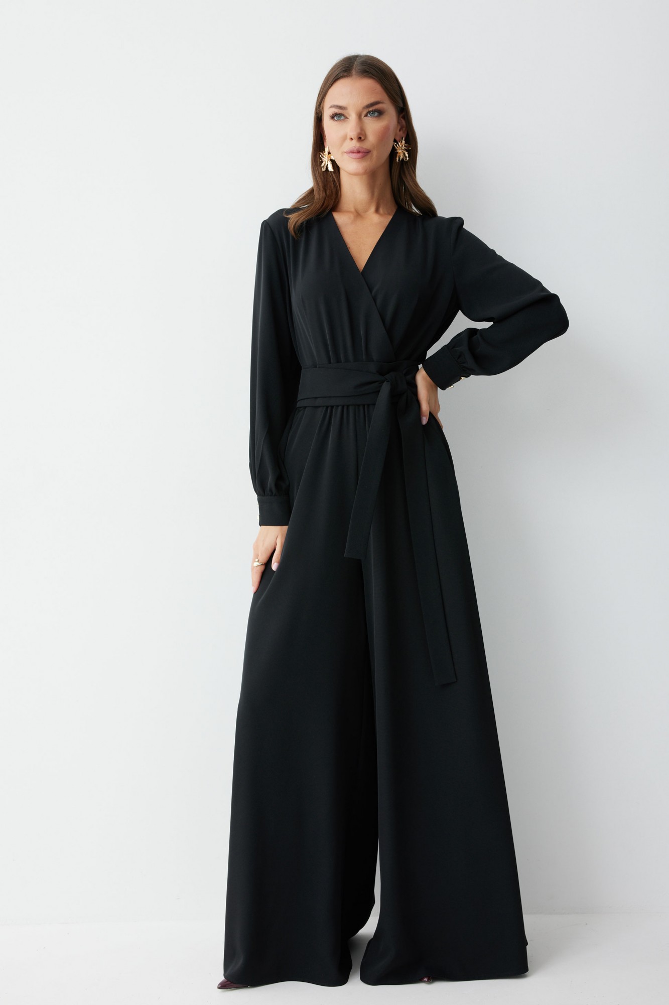 Комбинезон полуприлегающего силуэта с расширенными книзу брюками из струящейся ткани. Комбинезон отрезной по линии талии на резинке, верхняя часть комбинезона на запах. Рукав втачной, длинный, по низу манжета с застежкой на петлю и пуговицу. На спинке в среднем шве застежка на потайную молнию. В боковых швах карманы. В комплект входит пояс. Обращаем ваше внимание, что фурнитура может отличаться от фото.
