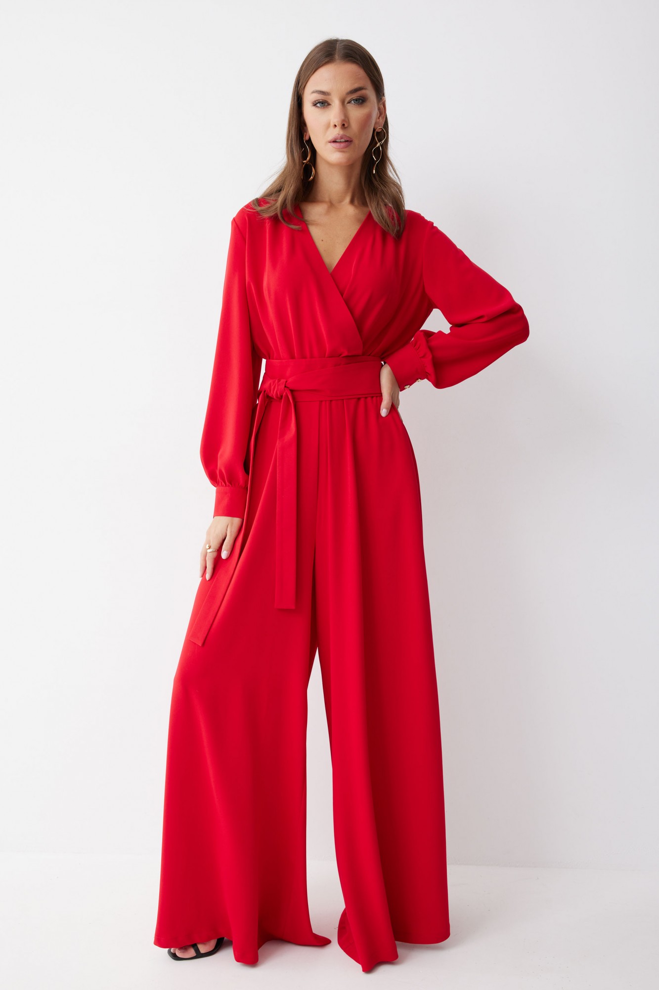 Комбинезон полуприлегающего силуэта с расширенными книзу брюками из струящейся ткани. Комбинезон отрезной по линии талии на резинке, верхняя часть комбинезона на запах. Рукав втачной, длинный, по низу манжета с застежкой на петлю и пуговицу. На спинке в среднем шве застежка на потайную молнию. В боковых швах карманы. В комплект входит пояс. Обращаем ваше внимание, что фурнитура может отличаться от фото.
