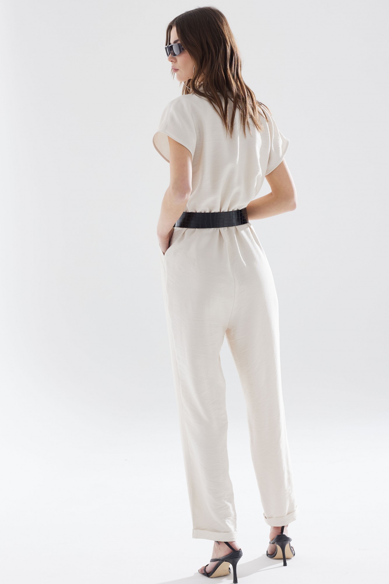 Стильный комбинезон полуприлегающего силуэта из струящейся ткани. Воротник пиджачного типа. Рукав цельнокроеный короткий. Комбинезон отрезной по линии талии на резинке, верхняя часть комбинезона на запах. На спинке потайная молния. По низу брюк цельнокроеная манжета. В боковых швах карманы. В комплект входит ремень. Обращаем ваше внимание на то, что фурнитура может меняться.