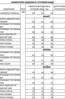 Костюм городского стиля, состоящий из жакета, брюк и майки. Жакет и брюки выполнены из джинса. Жакет прямого силуэта со втачными рукавами, отложным воротником, по переду застежка на петли и пуговицы и накладные карманы, рукава на манжетах. Брюки полуприлегающего силуэта в спортивном стиле на обтачке со шлевками для ремня, в боковых швах карманы. Майка удлиненная прямая со втачными рукавами.