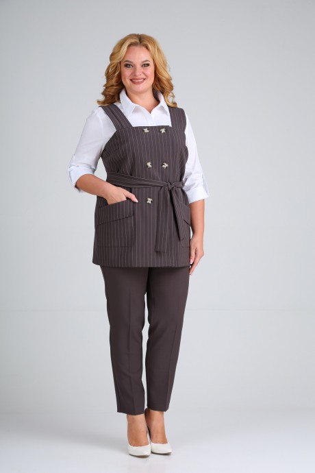 Комплект брючный с жилетом. Жилет полуприлегающего силуэта с 2-бортной застёжкой на 6 пуговиц и съёмным поясом. Спинка с талиевыми вытачками. Перед с нагрудными вытачками. Карманы боковые накладные с клапаном. Бретели с мягкой складкой. Брюки классические зауженные к низу с застёжкой на молнию петлю и пуговицу спереди. Задние полочки с талиевыми вытачками. Пояс притачной.